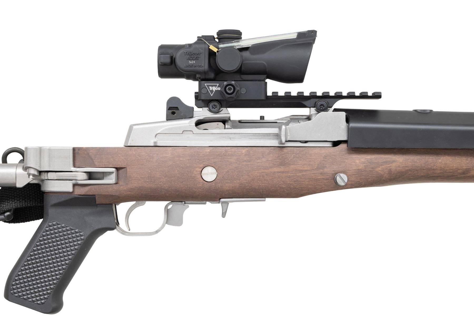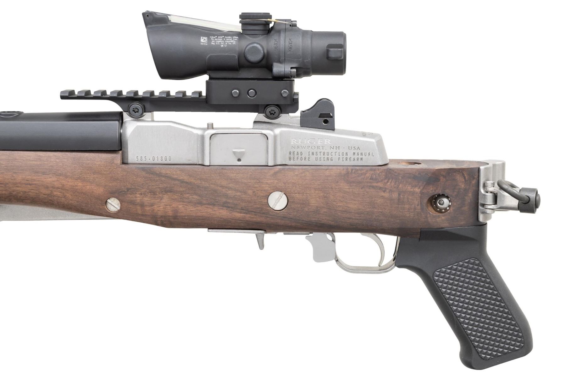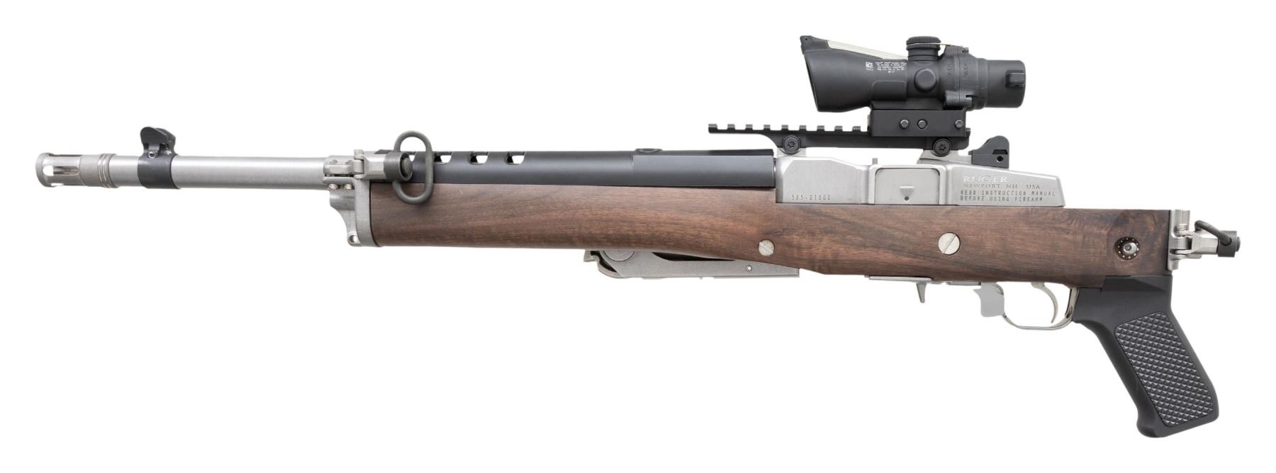 TRIJICON ACOG SCOPE. Cal. 7.62X39. S# 585-01800. Bbl. 16.12" heavy cold hammer forged with 5/8"-24 bird cage flash hider and serrated blade sight having protective ears; factory ghost ring rear sight on rear of receiver. Mfg. 2023 as Model 05868 with black synthetic stock; presently fitted with Samson folding oil finished walnut stock. Patterned after Ruger's original folding stocks that were also made by Samson but with walnut stained birch stocks. Includes Samson upper gas block cover with adapter allowing side mounting of its Samson sling swivel set having black nylon tactical sling. Receiver factory machined for Ruger scope rings plus it's factory drilled and tapped for scope base mounting. Factory Picatinny adapter installed holding Trijicon ACOG 3X24 TA50-C with green dot and horse shoe ballistic reticle specifically for 7.62X39 having 123 grain bullets. Great utility package suitable for fast, close range hunting too. MAGS: NONE. Readily available from Ruger or commercially. CONDITION: all aspects near excellent including bore and optics; looks new. (25-4631/NW). MODERN. $1,500-2,000.