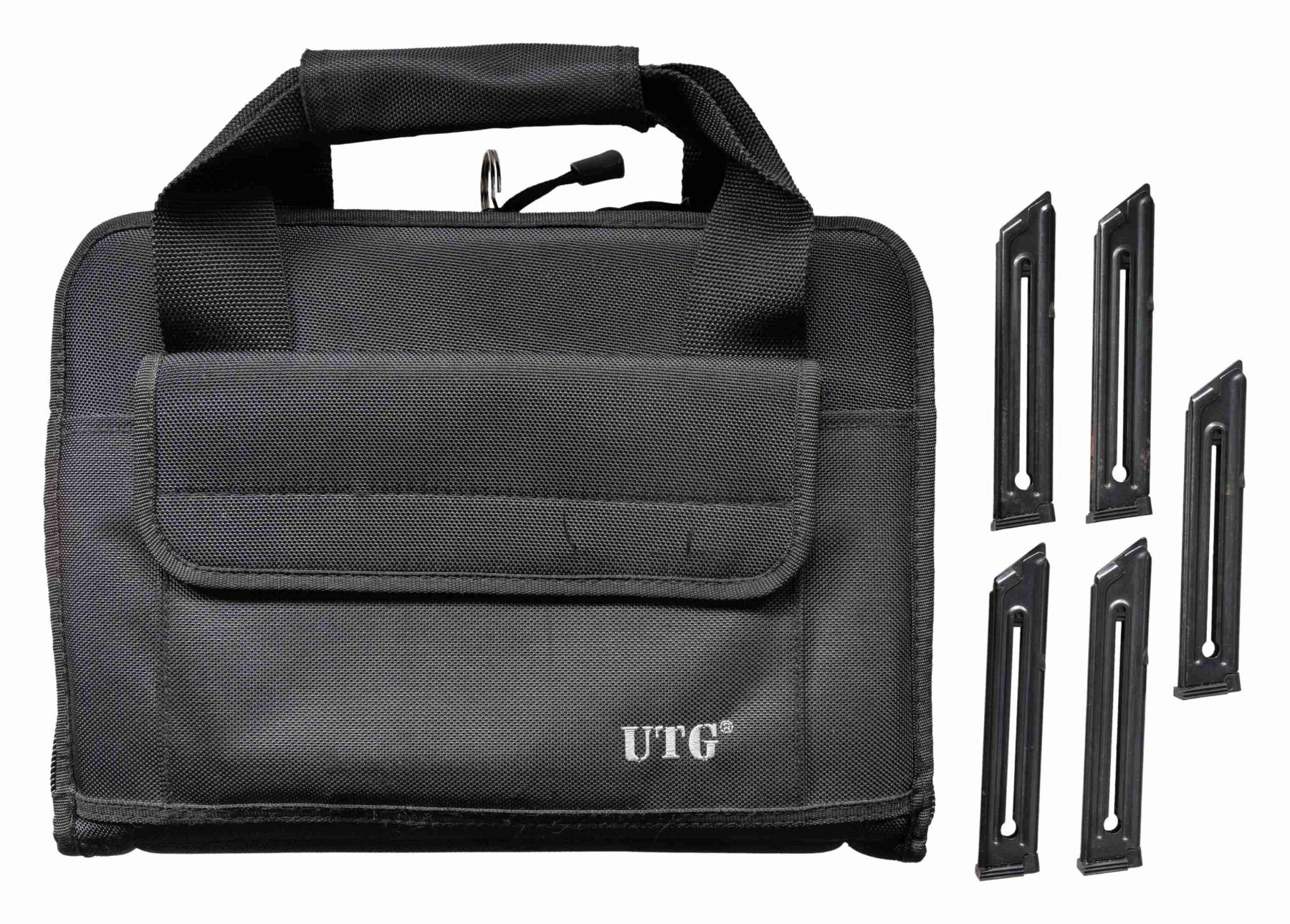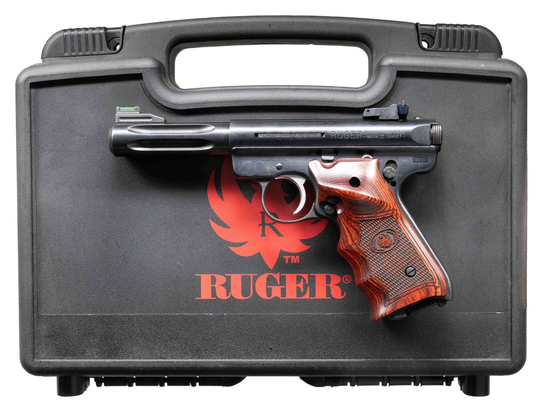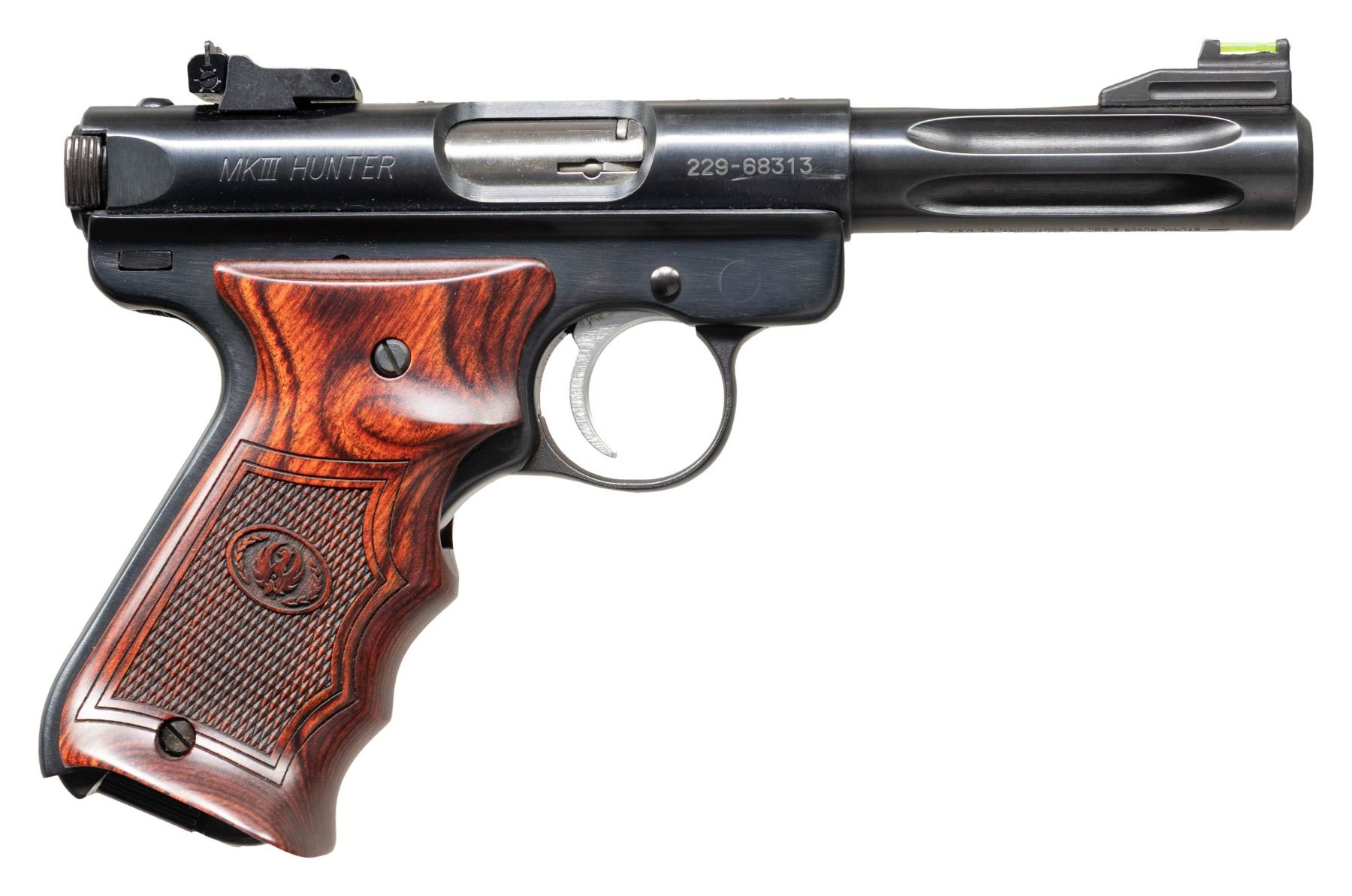 Cal. 22 LR. S# 229-68313. Bbl. 4 1/2" fluted bull with recessed target crown and "warning marks" discretely on bottom. Mfg. 2009 as Model 10134 with blued finish having catalog designation MKIII45H-TR. Special edition with "HUNTER" and "TARGET" markings; most Hunters were stainless. Multiple special features to include: internal lock, side of receiver loaded chamber indicator, 3 drilled and tapped holes for included factory scope base (plug screws installed), push button magazine release, last round hold open latch, laminated rosewood checkered finger grooved grips with laser engraved Ruger logo and RH thumb rest, tapered cocking ears on bolt, Hi-Viz fiber optic front sight and V notched adjustable rear sight. MAGS: 6 factory 10 rd. UNATTACHED ACCESSORIES: original matching numbered factory box with packaging plus near excellent UTG zippered black nylon range bag with 6 internal magazine compartments along with 2 for accessories. CONDITION: overall near excellent appearance with very faint mark just below serial number and slight thinning of finish at edge of muzzle. Bore and grips are near excellent. (25-6227/NW). MODERN. $350-500.