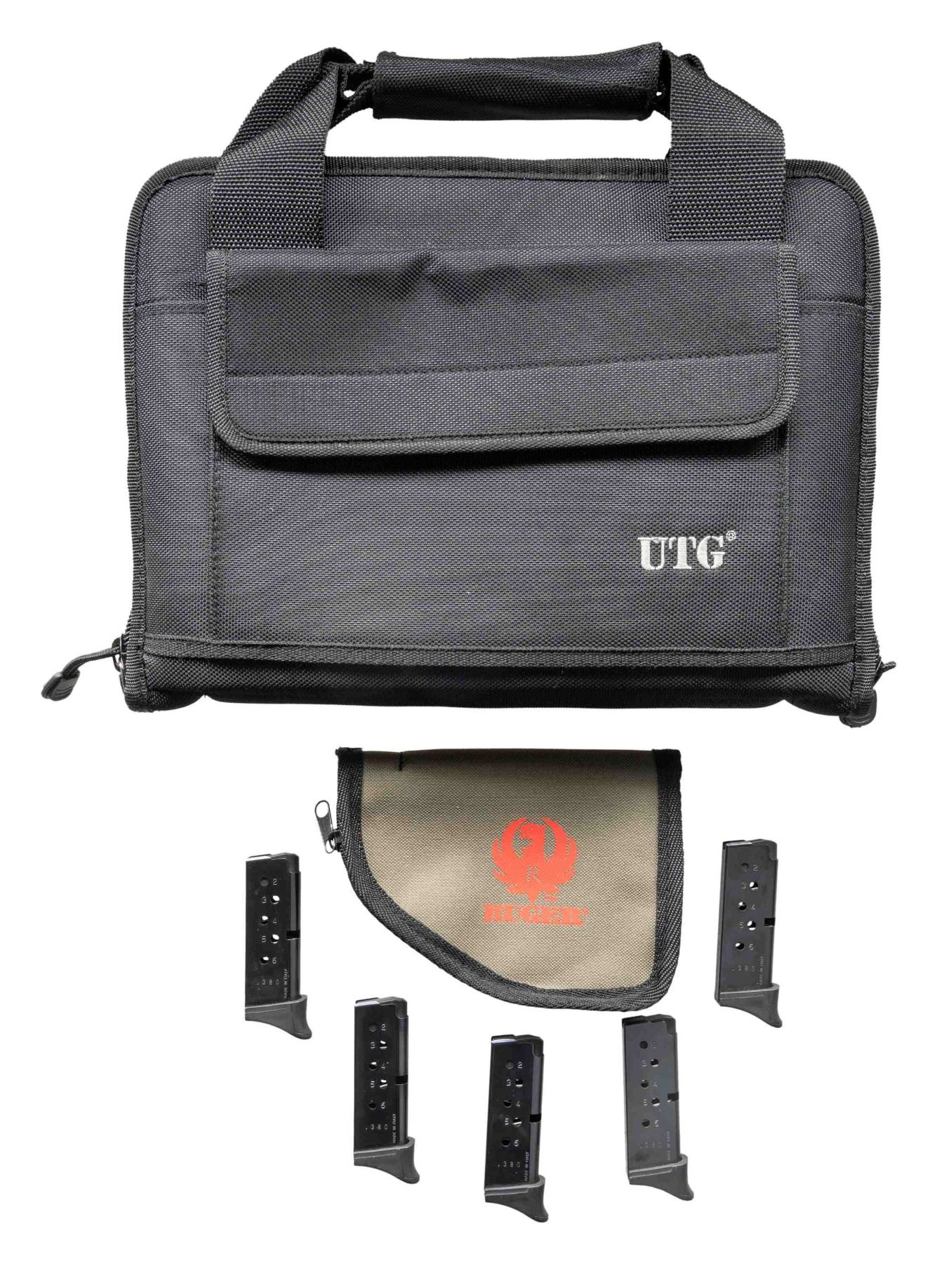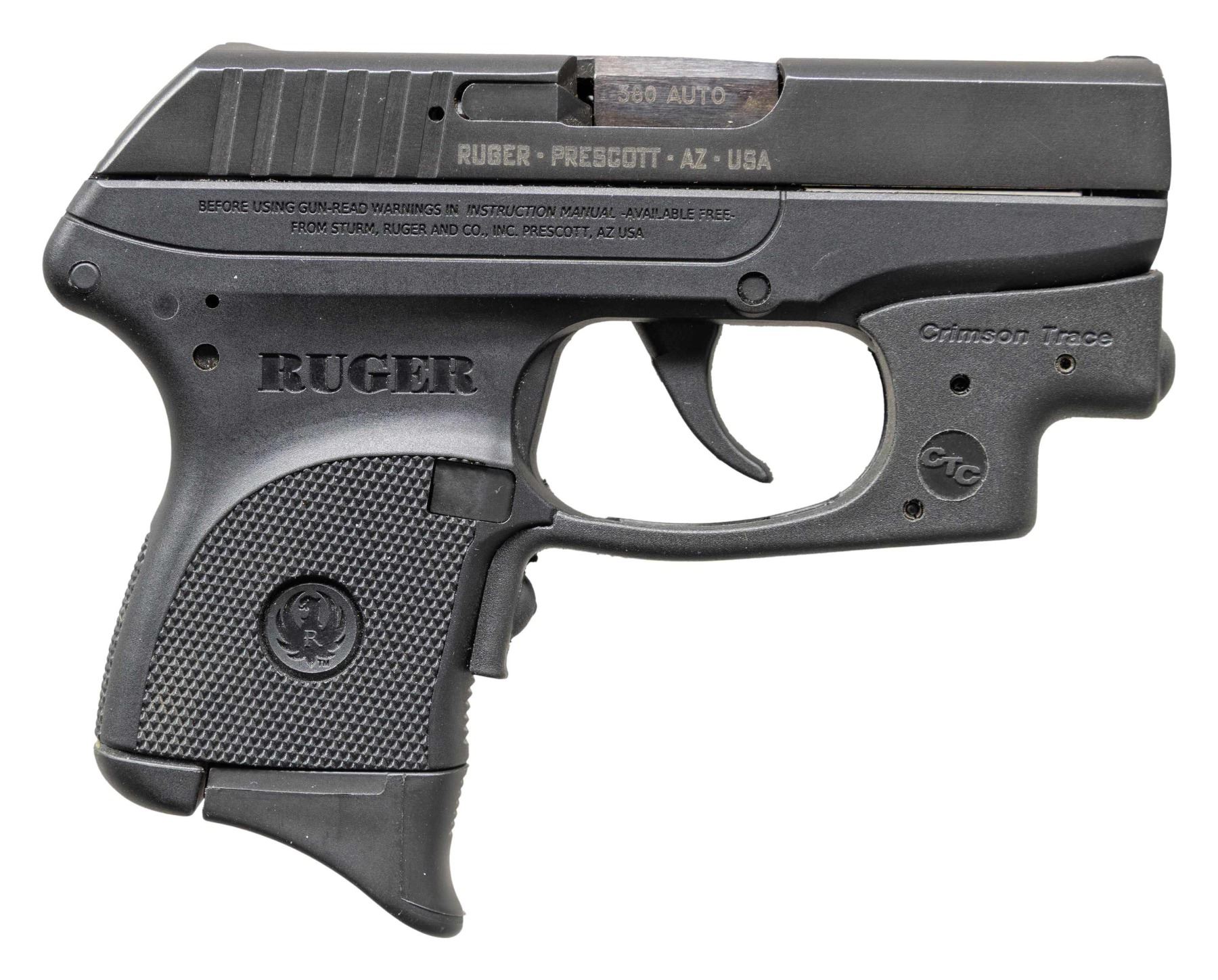 Cal. 380 ACP. S# 371-72396. Bbl. 2.75". Mfg. 2009 (2008 to date) as Model 03701 having High Performance Glass Filled Nylon frame. Hammer firing mechanism concealed in rear of slide having integral fixed front sight plus notch at rear. Fitted with Crimson Trace red laser that is finger activated from frontstrap when gripped. MAGS: 6 factory 6 rd. with finger extensions. UNATTACHED ACCESSORIES: factory matching numbered box with packaging to include tan Ruger nylon zippered pouch and UTG black nylon zippered carry pouch with 6 internal magazine compartments. CONDITION: all aspects near excellent with new appearance and properly functioning laser. (25-6220/NW). MODERN. $300-400.