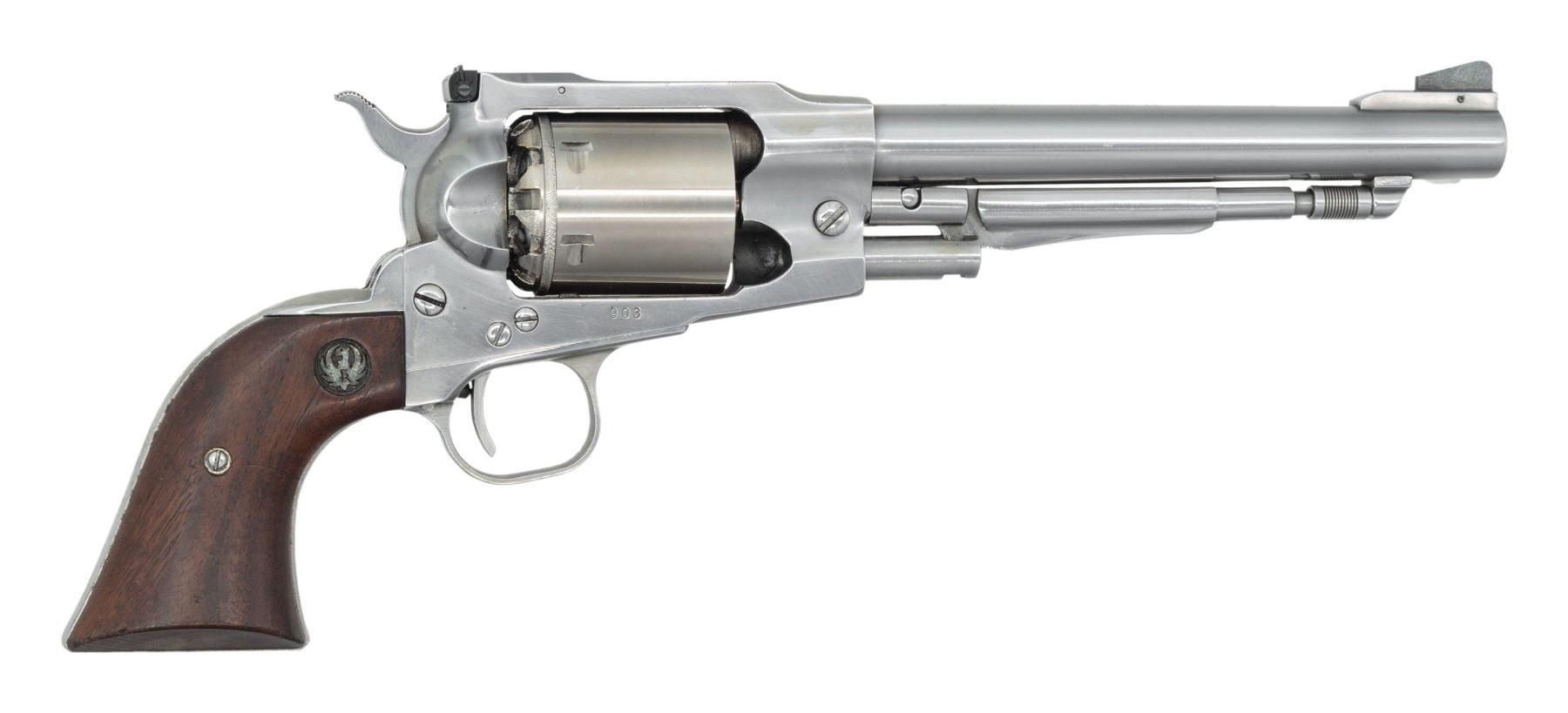 Cal. 45 Long Colt. S# 903. Bbl. 7 1/2" with ramped base having pinned blued serrated blade front sight; frame mounted factory adjustable rear sight. Mfg. 1975 as first year of stainless model (1975-2009) without serial number prefix (also in 1976; 7,790 without prefixes). Blued Old Army models (1972-2009) and later stainless models all had serial number prefixes (140-148). Change to prefixes was dictated by ATF which also states that henceforth this is not classified (and can't be changed back) as an Antique due to the replacement of the factory percussion cylinder with a cartridge cylinder by R&D which is an early nickel plated example (company later switched to stainless). Barrel has Southport address and is without "warning marks" (initiated 1978). Factory smooth walnut grips with silver eagle medallions. Wide, Super Blackhawk style serrated trigger in Blackhawk sized grip frame. CONDITION: very good to excellent overall appearance with evidence of once being used with black powder; grips are somewhat darkened with faint handling marks plus sides of hammer enclosed within the frame and sides of grip frame under grips have cleaned pitting. Exterior has appearance of light polishing beyond factory finish. Bore and cylinder are near excellent. Noticeably smooth mechanical functioning. PROVENANCE: From the Buckstix Collection. (25-6330/NW). CURIO. $650-900.