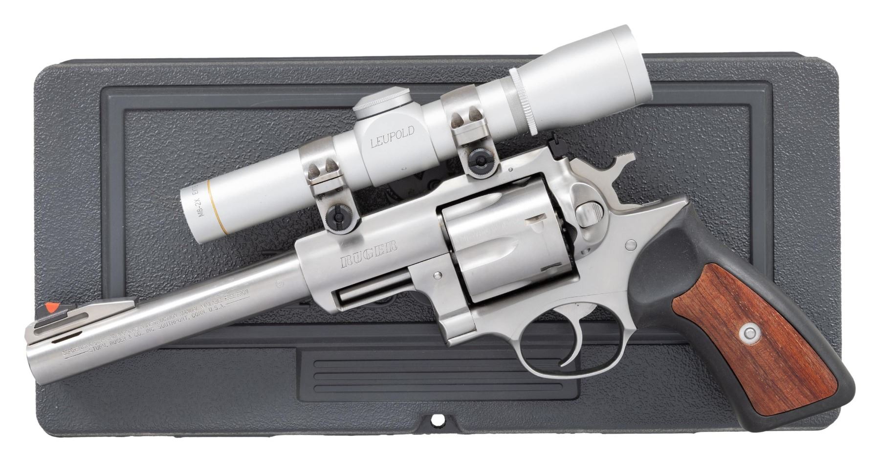 SCOPE. Cal. 44 Mag. S# 551-24954. Shipped 1997 as Model 05501; Catalog No. KSRH-7. Ported 7.5" bbl. Orange insert ramp front sight & adj. rear sight. Leupold silver M8-2x EER duplex scope on stainless Ruger rings. 6 Shot cyl. Satin Stainless finish. Houge Tamer Monogrip w/ Walnut panels. UNATTACHED ACCESSORIES: Ruger gray case. CONDITION: very good overall appearance showing light handling marks. Very good strong rifling. (25-3628/MD). MODERN. $600-900.
