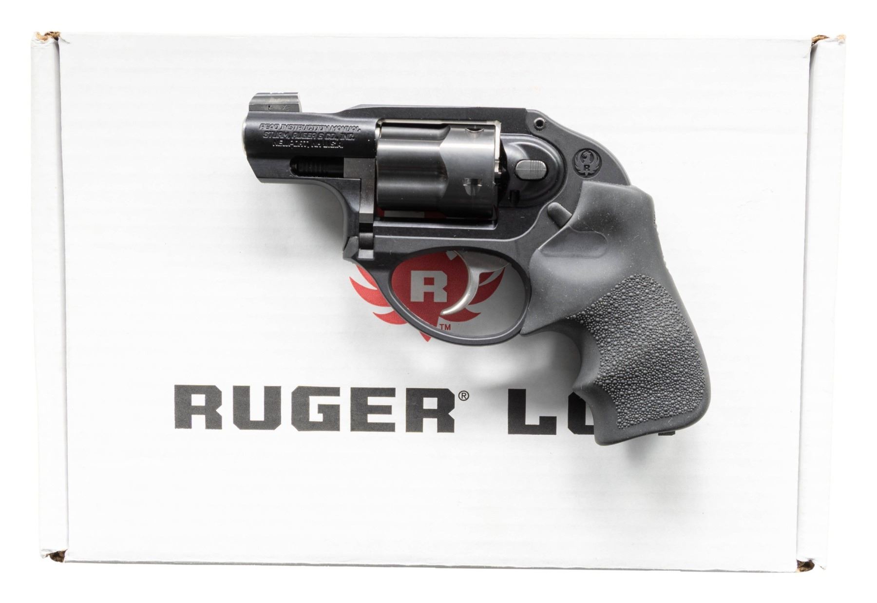 Cal. 38 Spl. S# 541-96496. Bbl. 1.87" stainless within aircraft grade aluminum housing with Trijicon night sight at frond and fixed frame notch at rear. DAO functioning with shroud enclosed hammer incorporating special factory friction reducing cam to eliminate trigger stacking. Stainless PVD finished cylinder is extensively fluted to reduce weight. Mfg. 2012 (2010 to date) as Model 05405 with factory logo rubber Hogue Tamer Monogrip having finger grooves and pebble grained texture. UNATTACHED ACCESSORIES: original box and packaging to include Ruger black nylon zippered pouch. Near excellent black leather Pocket Holsters.Com Hand Made formed holster. CONDITION: all aspects near excellent with unused appearance. (25-6213/NW). MODERN. $300-400.