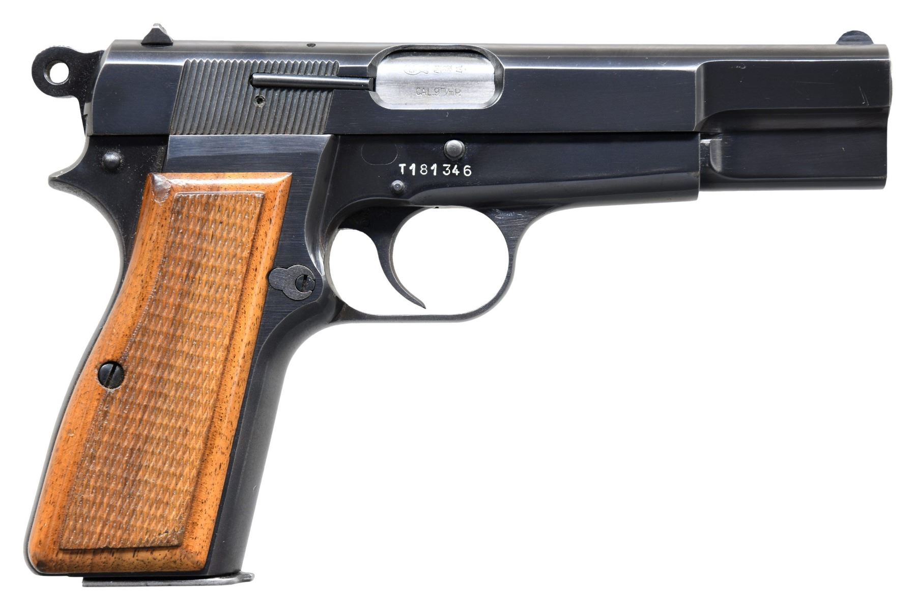 SEMI-AUTOMATIC PISTOL. Cal. 9mm Luger. S# T181346. Bbl. 4 5/8". Hi Power semi-automatic pistol mfg. in Belgium by Fabrique Nationale and imported by Browning Arms Company in 1967. Left side of the slide is marked with Browning's importer information above "MADE IN BELGIUM". Metal components exhibit a blue finish overall, save for on the bbl., which is polished in-the-white. Frame is mounted with 2-piece varnished checkered wood grips, which feature red anti-moisture barrier paint on the interior of the panels. Slide features an external extractor, with a fixed half-moon blade front sight and dovetailed U-notch rear sight. MAGS: 1 blued 13-rd. mag. with black enamel finish button type floorplate. UNATTACHED ACCESSORIES: black leather Browning soft case. CONDITION: metal components retain the majority of their original factory blue finish, exhibiting some light to mild edge wear overall. Grip straps exhibit light to mild wear and thinning, with consistent light surface level pitting overall. Brilliant mirror bore, exhibiting well defined rifling throughout. Grips show some superficial marks and minor impressions from handling and storage, but otherwise remain sturdy and serviceable. PROVENANCE: The Estate Collection of Charles Wagner. (25-425/MLW). CURIO. $750-1,000.