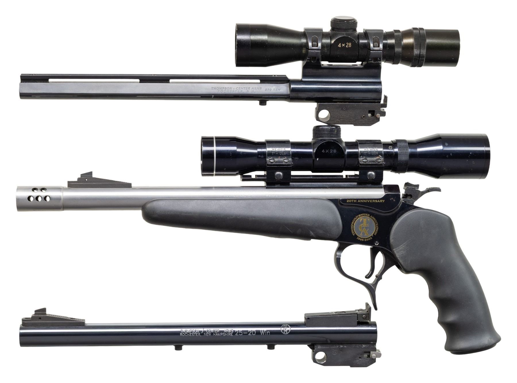 PISTOL WITH TWO SPARE BBLS.Cal. 7-30 Waters. S# TCA 20-022. Bbl. 12" stainless with muzzle brake. Blade front sight. No rear iron sight. Pistol is equipped with Tasco 4x28 scope. Scope has duplex crosshair reticle & good optics. 20th anniversary Contender pistol made in 2005. Frame has blued finish with gold accents. Black rubber finger groove grip & forend. UNATTACHED ACCESSORIES: matching numbered factory box with manual, 7-30 Waters carbine kit that is empty & numbered to a different gun, two empty 7-30 carbine bbl. boxes, 12" 25-20 bbl. with iron sights & 12" 270 Rem bbl. with VR & 4x28 duplex crosshair reticle scope that appears to lack a maker's marking. CONDITION: furniture shows some scuffing & scattered handling marks. Bbl. shows some minor handling marks & a couple specks of light oxidation. Frame retains nearly all its original bluing with some minor handling wear. Action functions properly when hand cycled. Bright near excellent bore. Spare bbls. have near excellent bluing & bores. PROVENANCE: Estate of Groves Herrick. (25-5652/MJC). MODERN. $400-600.