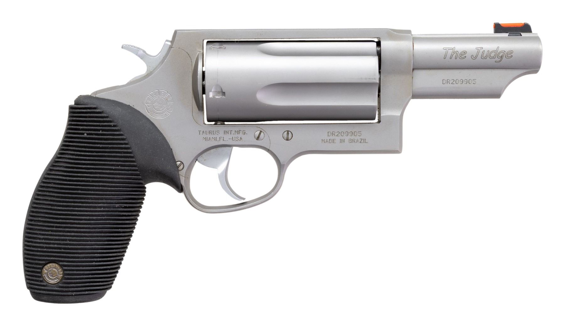 Cal. 410 3"/45 Colt. S# DR209905. Bbl. 3". Fiber optic front sight. Fixed rear sight. 5-shot cyl. Stainless finish. Grooved black rubber grips with Taurus medallions. UNATTACHED ACCESSORIES: matching numbered factory box with manual & keys for internal locking system. CONDITION: grips & metal show some light handling marks & operational wear. Action functions properly when hand cycled. Near excellent bore. (25-6218/MJC). MODERN. $300-500.