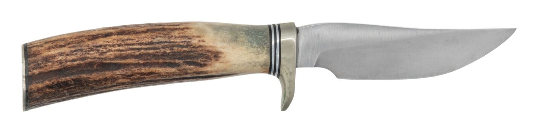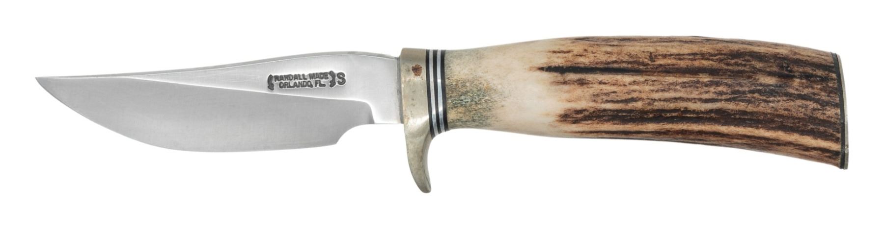 7 1/2" overall length with 3 1/2" blade marked "RANDALL MADE/ORLANDO, FL S". Silver plated hilt. Stag handles. No scabbard or stone present. CONDITION: handle shows some light handling wear. Silver plated parts show some light flaking & light oxidation. Blade shows minor oil staining & some tiny oxidation specks. (02-25164/MJC). NON-GUN. $250-350.