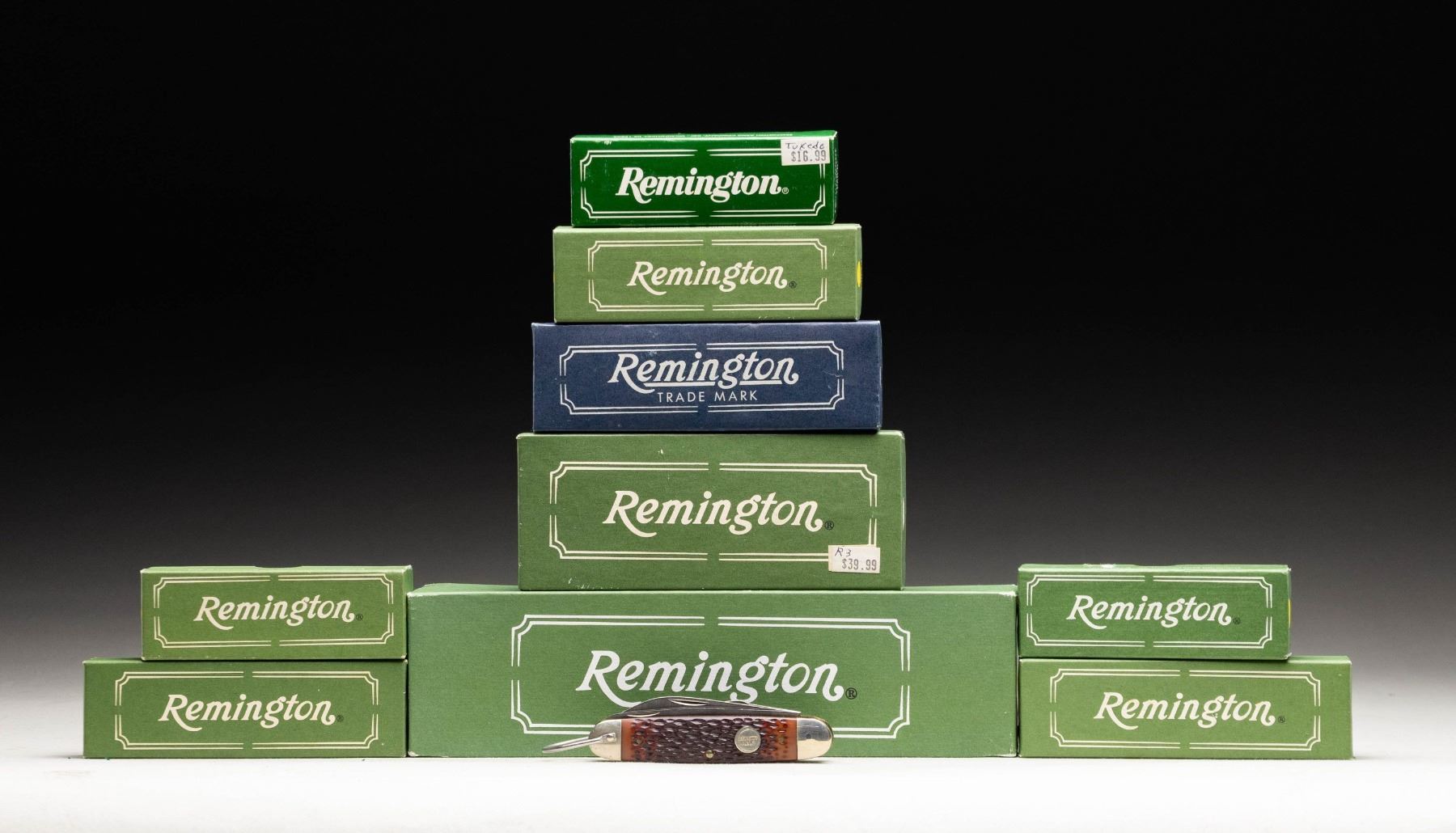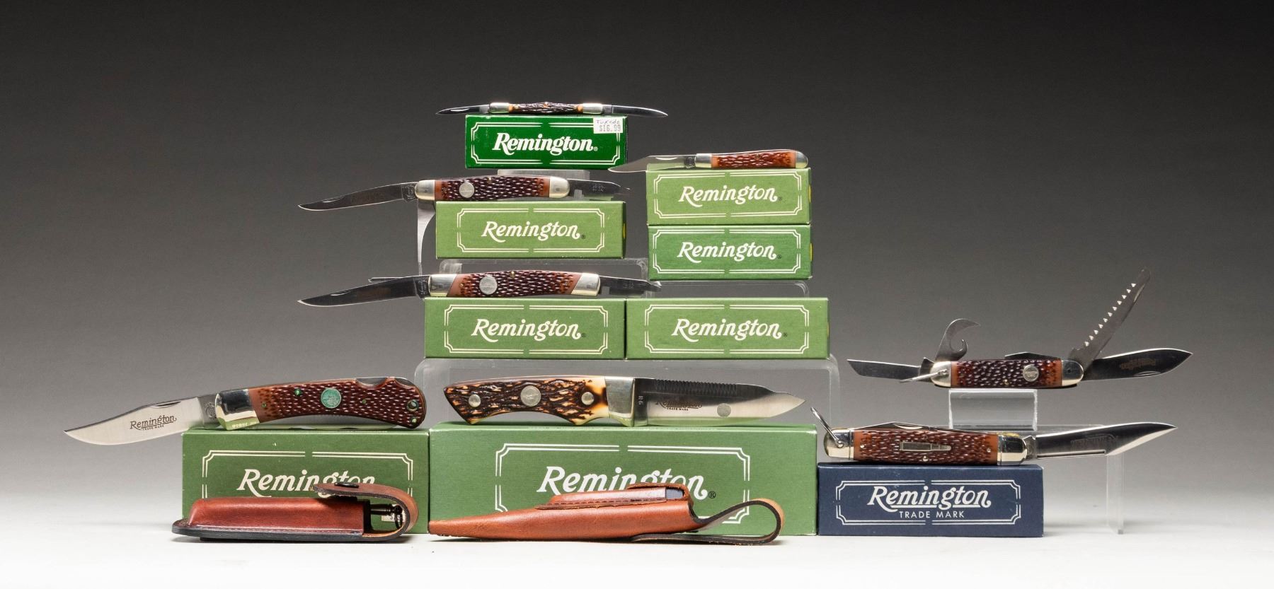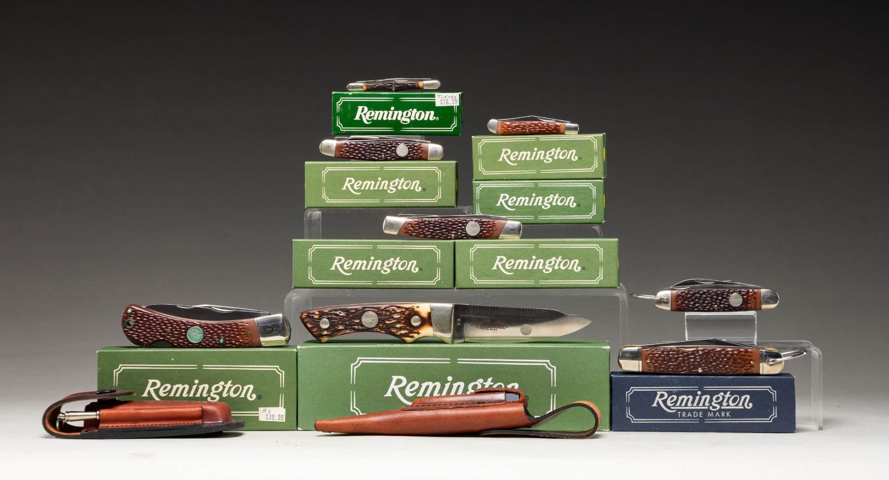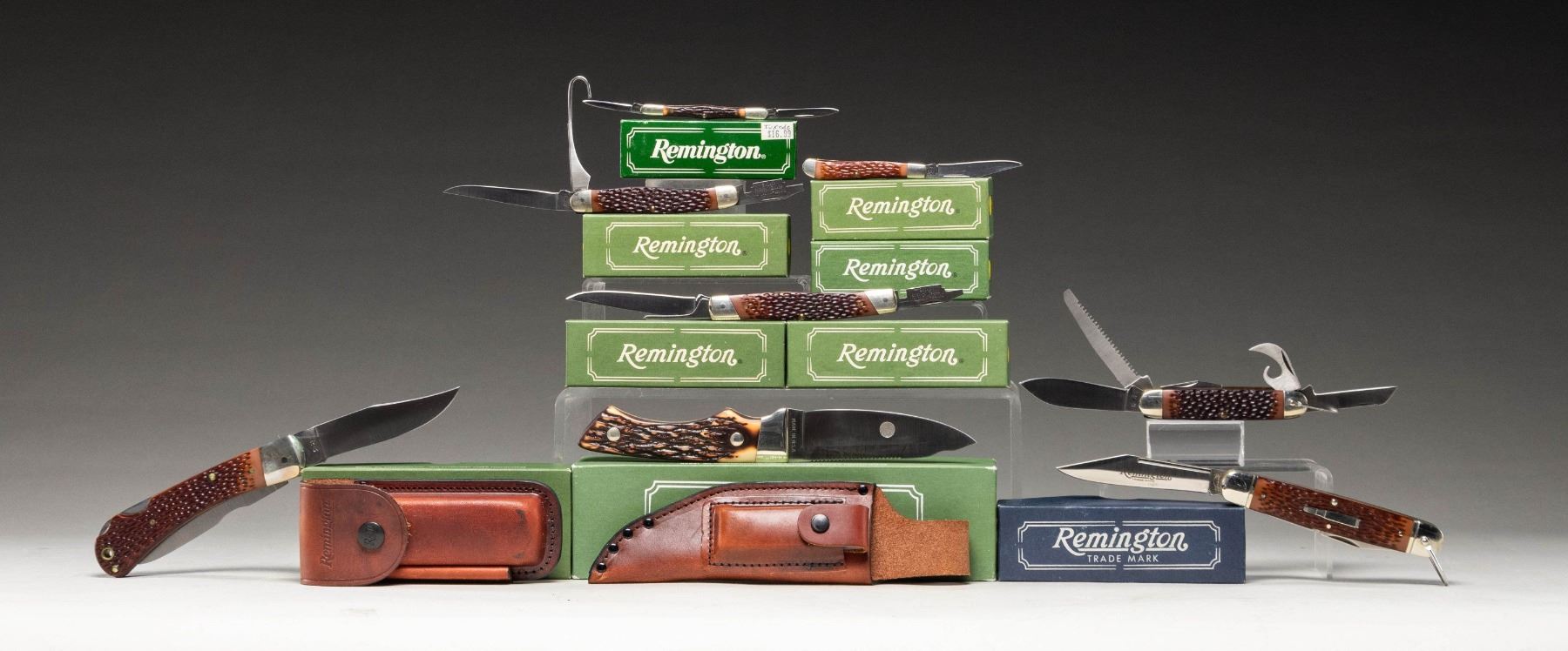 Lot of 10 assorted Remington pocket knives, including: 1) x1 Remington UMC R6 Skinner fixed blade knife. Stainless steel construction with 2-piece faux stag (delrin) grip scales. Right grip scale is inlaid with a Remington UMC medallion. Complete with factory box and brown leather sheath containing whetstone. 2) Remington UMC R3 Lockback folding blade pocket knife with clip point blade and secondary saw blade with gut hook. Stainless steel construction with 2-piece faux stag grip scales. Left grip scale is inlaid with a Remington UMC medallion. Complete with factory box, leather pouch, and sharpening tool. 3) Remington UMC R7 with folding blade, choke wrench, and pin remover. Stainless steel construction with 2-piece faux stag grip scales. Left grip scale is inlaid with a Remington UMC medallion. Complete with factory box. 4) Remington UMC R2 Waterfowl folding blade pocket knife with serrated edge blade, choke wrench, and pin remover. Stainless steel construction with 2-piece faux stag grip scales. Left grip scale is inlaid with a Remington UMC medallion. Complete with factory box. 5) Remington UMC R1 Upland folding pocket knife with choke wrench and bird hook. Stainless steel construction with 2-piece faux stag grip scales. Left grip scale is inlaid with a Remington UMC medallion. Complete with factory box. 6) Remington R5 Gentleman folding blade pocket knife. Stainless steel construction with 2-piece faux stag grip scales. Left grip scale is inlaid with a Remington UMC medallion. Complete with factory box. 7) Diminutive Remington UMC folding pocket knife. Stainless steel construction with 2-piece faux stag grip scales. Complete with an R4 Utility knife box. 8) Remington Tuxedo Pen-D folding knife with 2 folding blades. Stainless steel construction with 2-piece faux stag grip scales. Complete with factory box. 9) Remington UMC Boy Scout pattern knife / multi-tool. Stainless steel construction with 2-piece faux grip scales and swiveling hanger. 10) Remington UMC limited edition R4243 Camp Bullet knife / multi-tool. Stainless steel construction with 2-piece faux stag grips. Left grip scale is inlaid with a flat polished bullet. Complete with factory box containing limited edition registration card. CONDITION: blades/tools are all excellent, showing no signs of prior use. Scales are excellent, with some spots of verdigris on brass pins. Boxes are very good, with some showing some light to mild exterior wear. (02-25905/MLW). NON-GUN. $1,000-1,500.