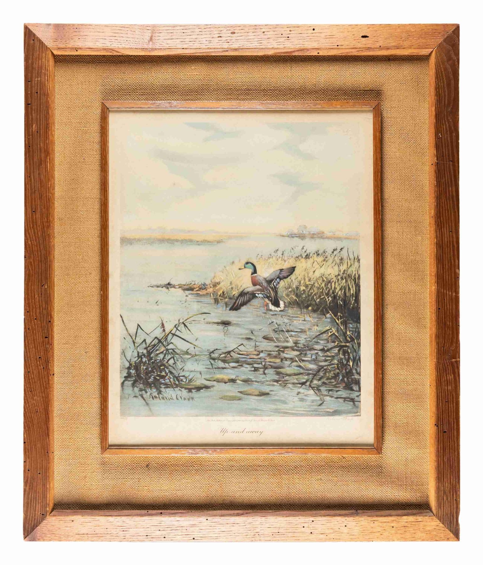 1) Copyright 1937 Derrydale Press "THE ALARM" "Black Duck" "19/250". Signed Roland Clark lower right. SIZE: overall 22-1/2" x 27", sight 14-1/2 x 18". CONDITION: very fine. Housed in old frame and backing; under glass. 2) Copyright 1947 "Up and Away" depicting mallard taking flight. "176/300". Signed Roland Clark lower right. SIZE: overall 28-1/2" x 34", sight 17" x 21-1/2". CONDITION: fine; foxed toward top. Housed in large burlap and wood frame with old backing under glass. PROVENANCE: From the Private Collection of Berrien Moore III. (02-25871-8/MGM). $400-800.