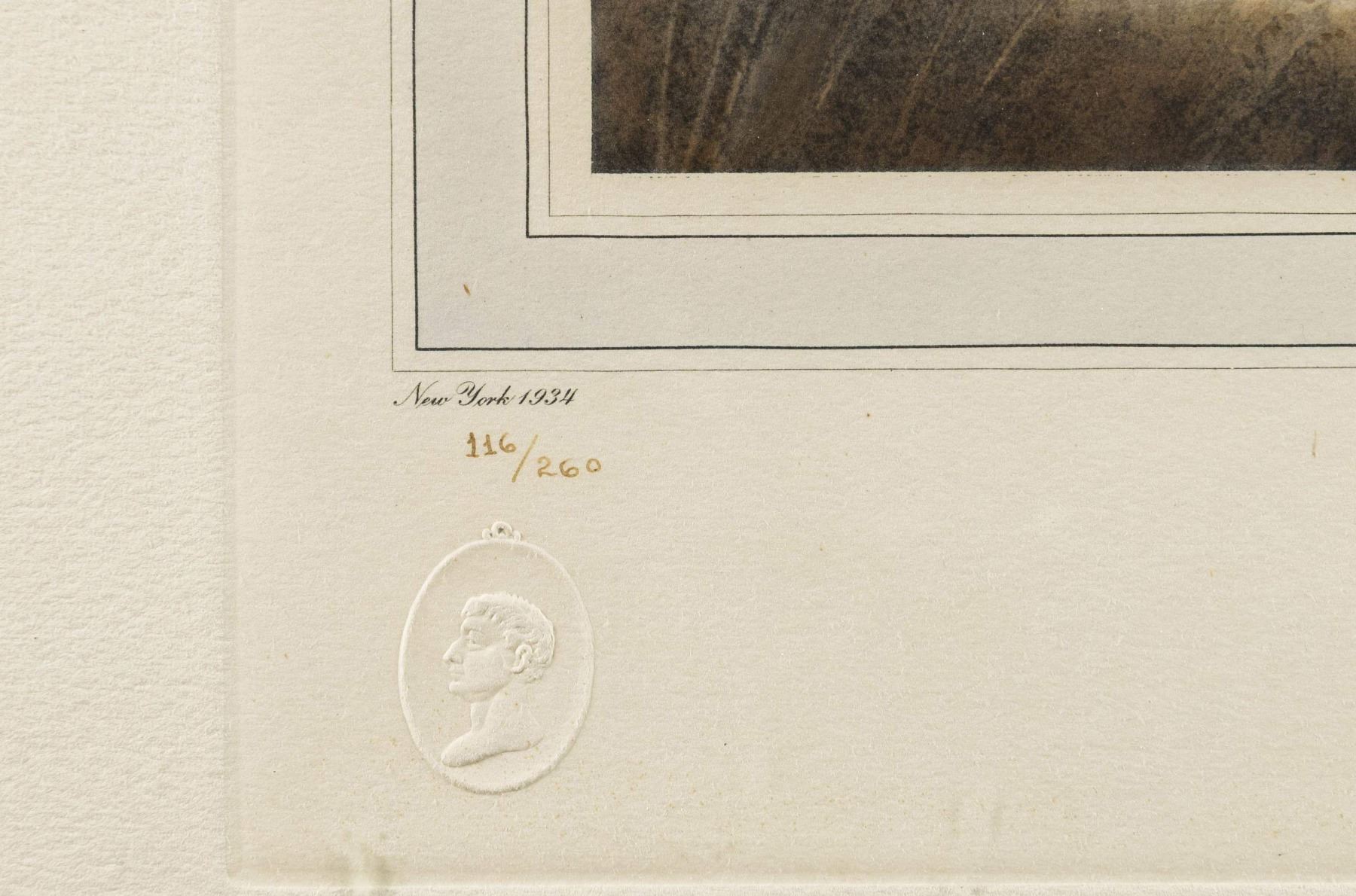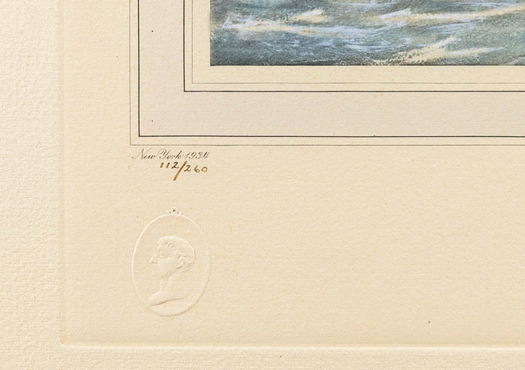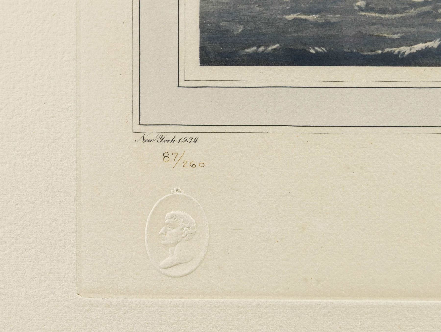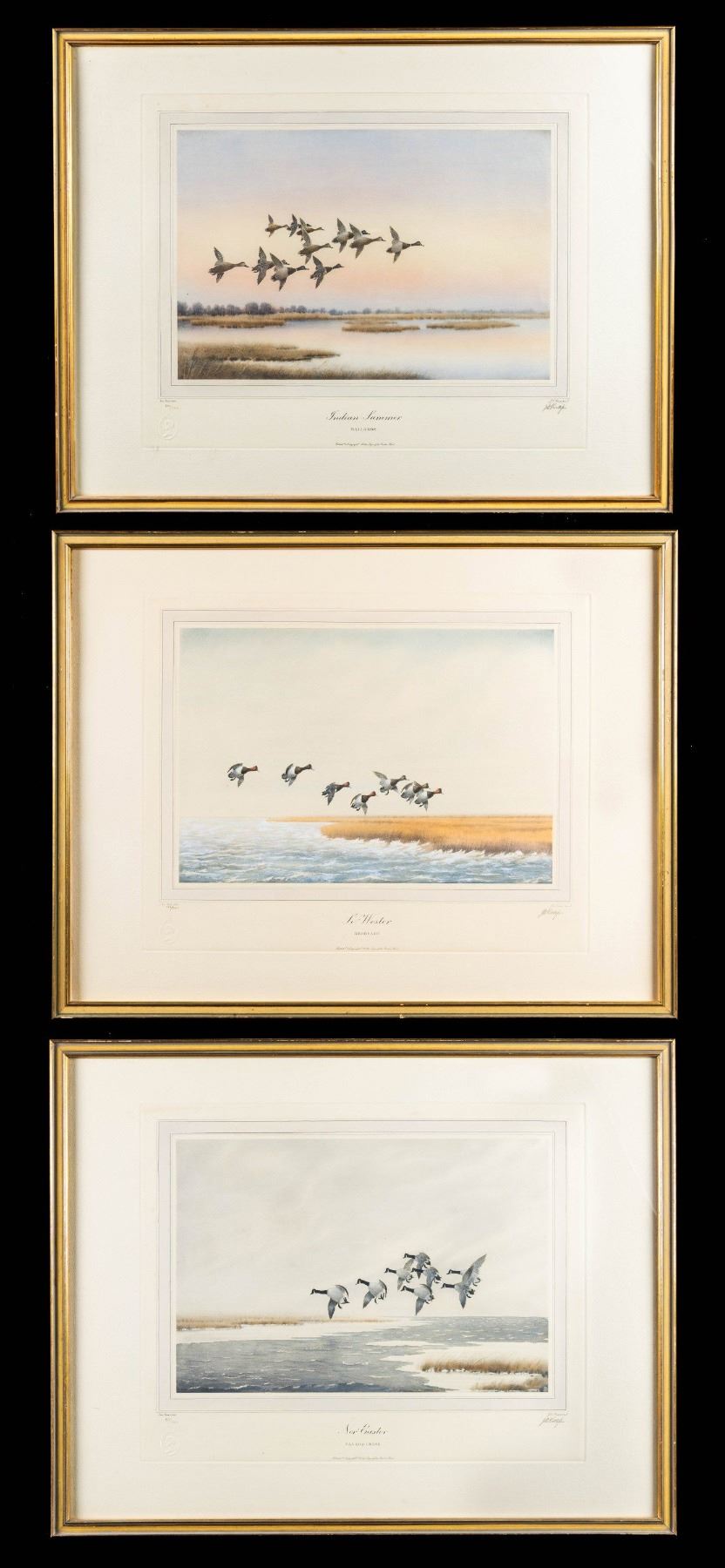 MATCHING FRAMES. 1) "Indian Summer" "MALLARDS" "16/260". 2) "So' Wester" "REDHEADS" "112/260". 3) "Nor' Easter" "CANADA GEESE" "87/260". Each signed J.D. Knap at lower right in pencil. Lower left dated "New York 1934" over inked in edition size, over embossed male portrait. SIZE: All: overall 27" x 21" , sight 17-1/2" x 15". CONDITION: fine. Housed in gilt frames under glass. Indian Summer and Nor' Easter with old backing etc. So' Wester new backing; print slightly foxed. PROVENANCE: From the Private Collection of Berrien Moore III. (02-25871-4/MGM). $300-700.