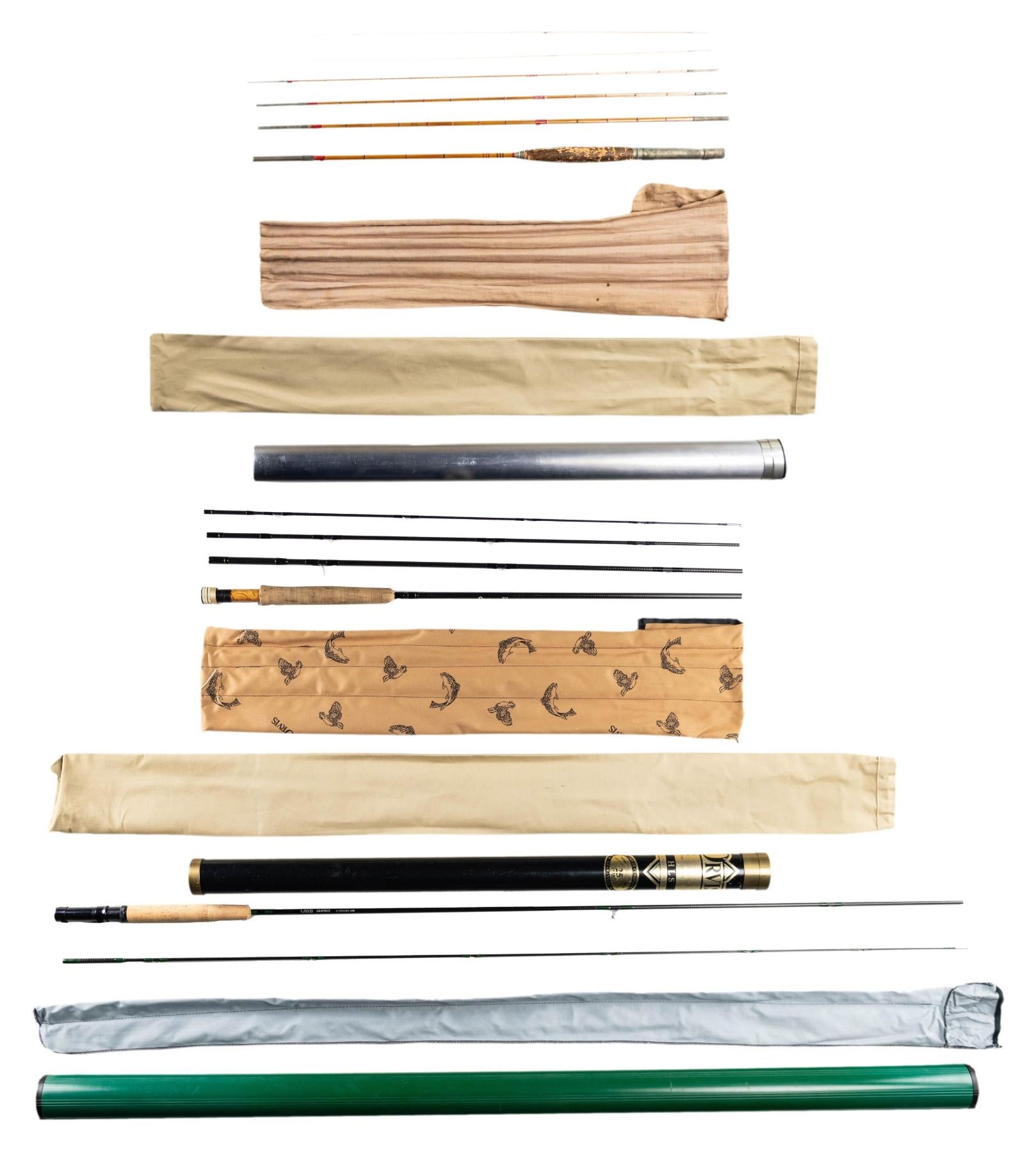 1) Orvis graphite fly rod. 8', 2 piece, 1 tip, 6 weight, with bag and plastic tube. CONDITION: very fine. 2) Orvis graphite fly rod. 9', 4 piece, 5 weight, with bag and tube. CONDITION: lightly used. 3) Antique bamboo fly rod. Retailed by William Read & Sons Boston. 10', 5 piece, 2 tips, (probably for 9 weight line), in original bag and new tube. CONDITION: good. Appears complete. Ferrules are corroded. Both tips are correct length. PROVENANCE: From the Private Collection of Berrien Moore III. (02-25866-11/MGM). $300-600.