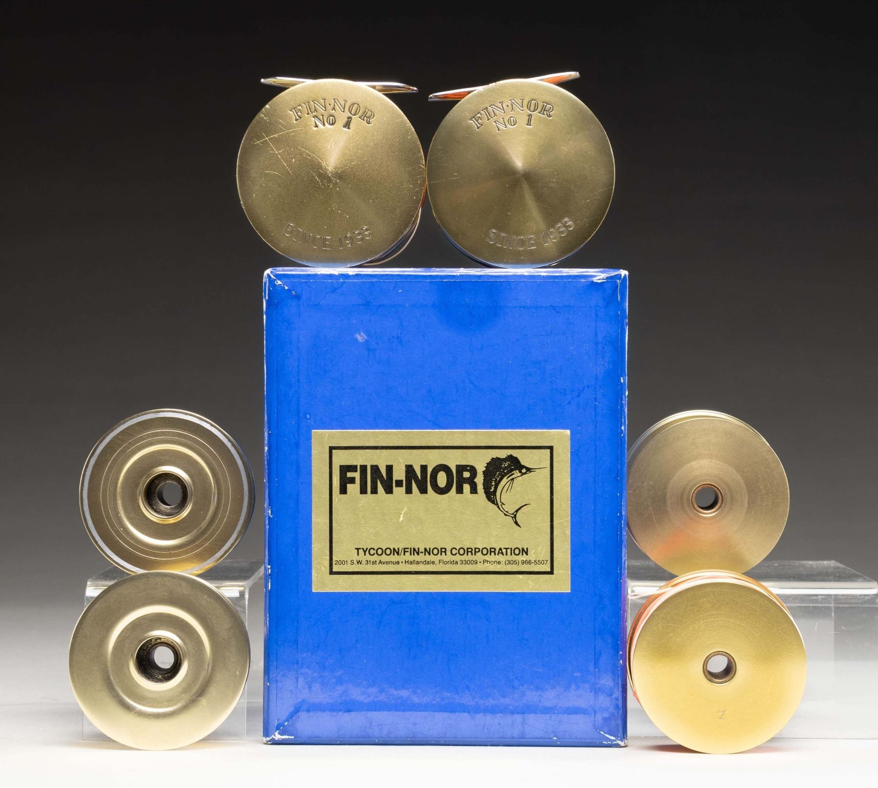 SPOOLS. 1) Fin-Nor #1 direct drive (left hand wind) with 1 extra spool with lines. CONDITION: very fine. Overall clean with some knicks on right base. 2) #1 Anti-reverse (right hand wind) with backing and 3 extra spools without lines. CONDITION: very fine with some light scratches. Extra spools excellent; one with backing. All in blue box for anti-reverse reel containing spare parts, bag and paperwork. PROVENANCE: From the Private Collection of Berrien Moore III. (02-25870-3/MGM). $600-1,200.