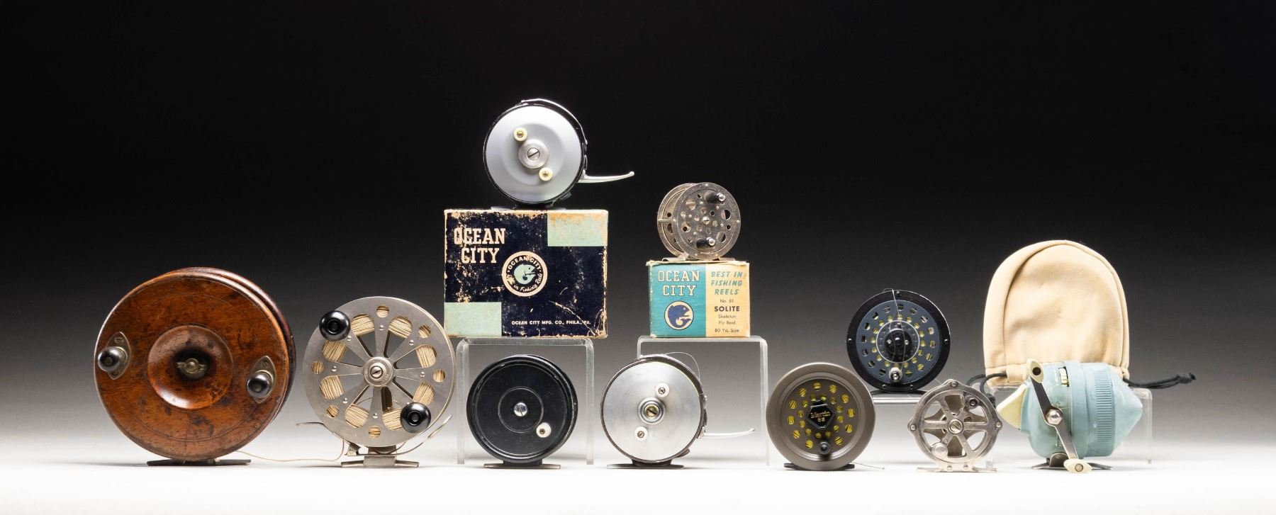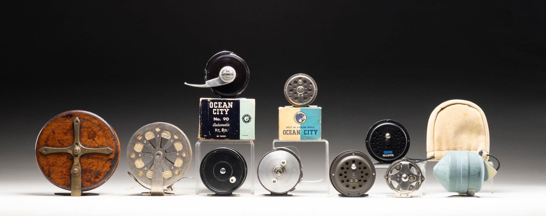 1) 6" diameter "Nottingham" wooden fly reel with horn knobs and star brass base with click. Marked "SUN" and with 1885 patent date on brass star. CONDITION: fine with many knocks and scrapes original wood finish. Brass nicely toned. 2) Pfueger "Captain" trolling reel with drag. CONDITION: very fine; looks unfished. 3) Ocean City No 90 automatic fly reel in box with paperwork. CONDITION: very fine; very lightly used. Box good; heavily chipped. 4) Ocean City No 90 automatic fly reel with line. CONDITION: good. 5) Ocean City "Solite" metal fly reel in box. CONDITION: fine. Box rough. 6) Union Hardware "Sunnybrook" metal fly reel. ONDITION: very fine.7) Martin 65 fly reel with line. CONDITION: very fine.8) Ocean City #36 fly reel with line. CONDITION: very fine; with some rubs. 9) Zebco 803 spin cast reel. CONDITION: good. 10) Martin 65 fly reel with line, in bag. CONDITION: fine; with some rubs. PROVENANCE: From the Private Collection of Berrien Moore III. (02-25870-7/MGM). $300-600.