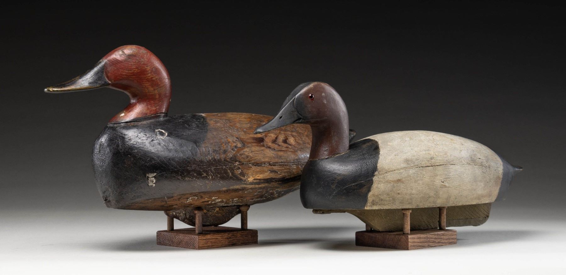 1) Solid body flat bottom with keel, 17" with glass eyes and stand. Nice feather pattern paint on back. CONDITION: very good; most likely original paint with some minor chips. 2) Oversized solid body old decoy, 19" with stapled heavy lead weight and stand. CONDITION: old worn paint probably stripped revealing original. PROVENANCE: From the Private Collection of Berrien Moore III. (02-25872-9/MGM). $250-500.