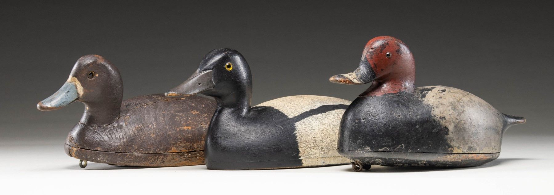 1) Bluebill drake measures 15" with glass eyes, tacked on bottom. CONDITION: very fine; original paint having edge wear. 2) Bluebill hen measures 14" with glass eyes; has keel. CONDITION: good; old paint good with cleaning. Body shows some shot strikes. 3) Redhead drake measures 11-1/2" with glass eyes; iron plate on chamfered base. CONDITION: good "as found" with considerable over painting over shot strikes. A good looking decoy. PROVENANCE: From the Private Collection of Berrien Moore III. (02-25872-10/MGM). $450-800.