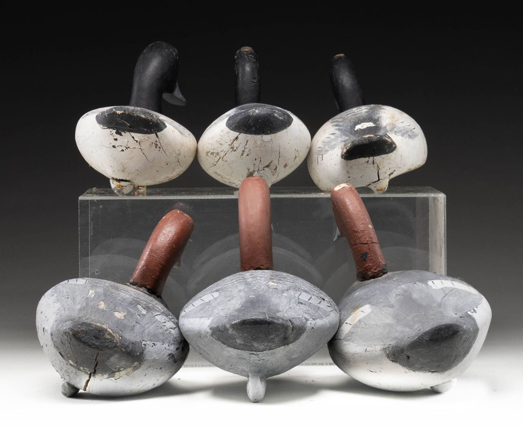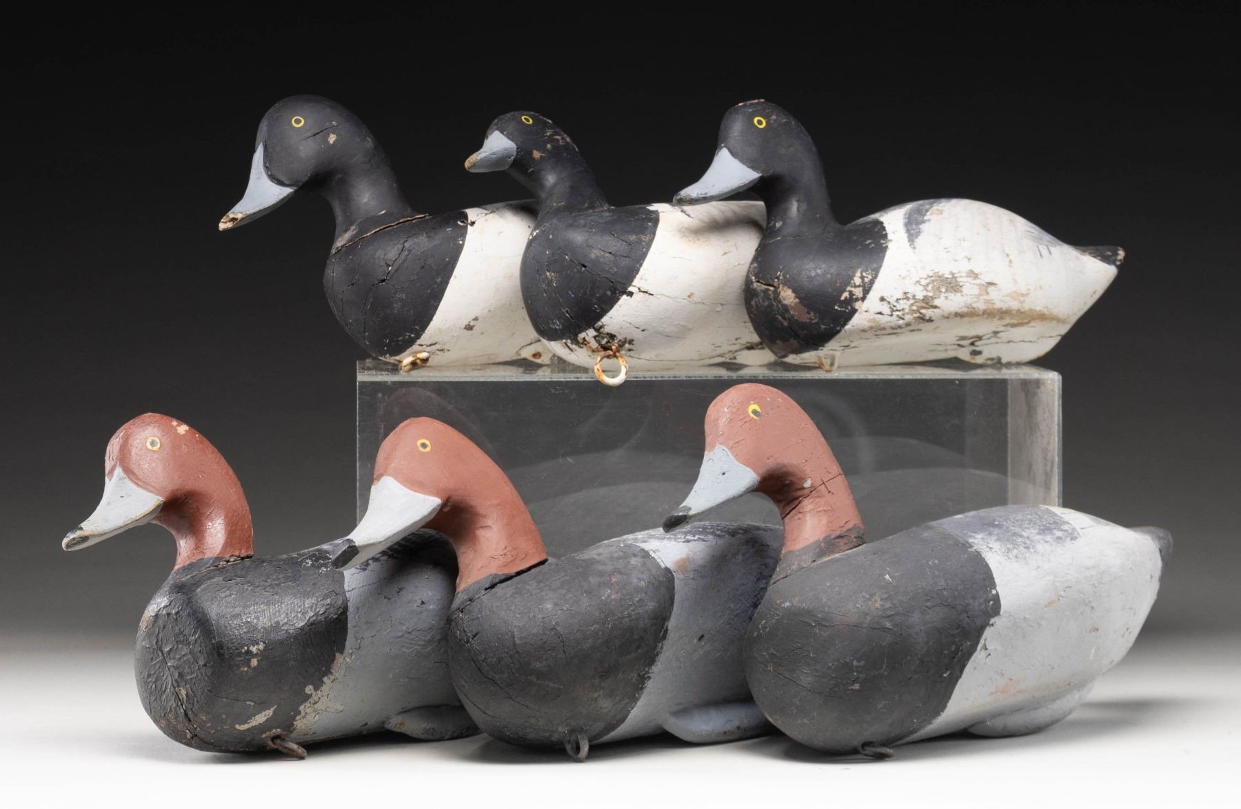 1) 3- Oversized Redhead drake decoys measure 15", 14", 15", solid bodied with painted eyes. CONDITION: old handmade decoys with over paint, showing some chips. 2) 3- Bluebill drake decoys each measure 13", various carvers, solid bodies with painted eyes. CONDITION: period of use over paint considerably chipped with some shot strikes. PROVENANCE: From the Private Collection of Berrien Moore III. (02-25872-12/MGM). $600-1,200.