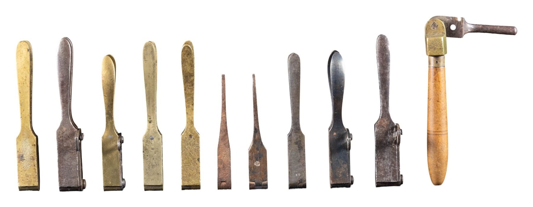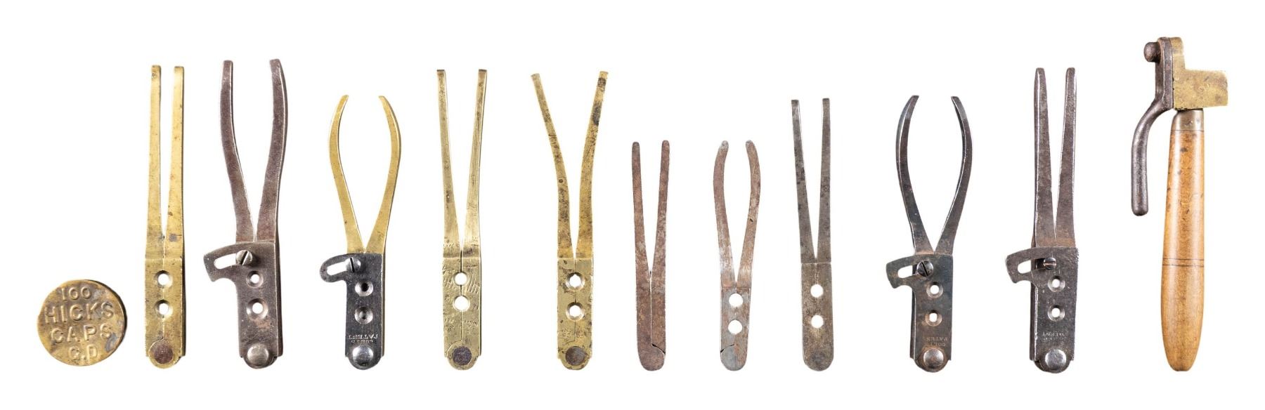 REVOLVERS. Lot contains 11 molds, 10 of which are double-cavity and one is single-cavity. No.1: 31 caliber. Brass double-cavity mold. Casts one round and one conical ball. Mold is marked on top "COLT'S PATENT". CONDITION: mold has been cleaned. Shows wear and tool marks. / No.2: 28 caliber. Brass double-cavity mold with steel cutoff. Casts one round ball and one pointed bullet. CONDITION: mold has been cleaned, showing moderate wear and handling marks. / No.3: 31 caliber. Brass double-cavity mold. Casts one round ball and one pointed bullet. Mold is marked on top "COLT'S PATENT". CONDITION: mold has wear with tool and handling marks, retaining a pleasing patina. / No.4: 31 caliber. Brass double-cavity mold. Casts one conical and one round ball. Mold is marked on top with faint "COLT'S PATENT". CONDITION: mold is worn with numerous tool marks, turning patina. / No.5: 31 caliber. Steel double-cavity mold with cutoff. Mold is marked on right side with "31PKT". Casts one round and one conical ball. CONDITION: mold shows extensive wear and handling marks, turning gray and patina. / No.6: 36 caliber. Steel double-cavity mold with cutoff. Cutoff is marked "COLT'S PATENT". Mold is marked on right side "36". Casts one conical bullet and one round ball. CONDITION: mold has extensive wear with oxidation and pitting. / No.7: 28 caliber. Steel double-cavity with cutoff. Replacement cutoff screw. Casts one conical and one round ball. CONDITION: mold has wear, dents and handling marks while retaining traces of original blue. / No.8: 31 caliber. Steel double-cavity marked only on right side "31". Casts one round and one conical bullet. CONDITION: mold is turning gray and patina w/ wear and handling marks. / No.9: 31 caliber. Steel double-cavity unmarked mold. Casts one round ball and one conical bullet. CONDITION: mold in the white, turning gray and patina. / No.10: 31 caliber. Steel double-cavity. Casts two round balls. CONDITION: mold has turned overall patina with oxidation and light pitting. / No.11: 44 caliber. Brass single-cavity bullet mold. One piece, base pour. Steel cutoff. Mold is marked only on left side with "H". Hardwood handle. CONDITION: brass parts have turned a pleasing worn patina. Steel cutoff has turned patina with oxidation. Handle has wear and small handling marks. / No.12: One brass percussion cap tin. Tin marked on cover "100 / HICKS / CAPS / GD". (02-25906/RW). NON-GUN. $800-1,300.
