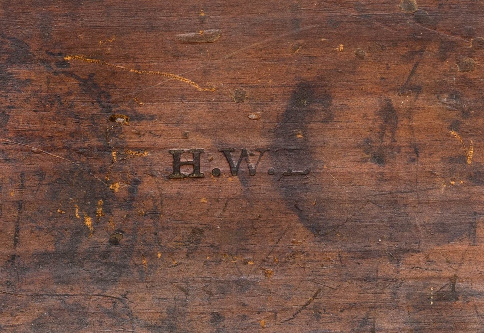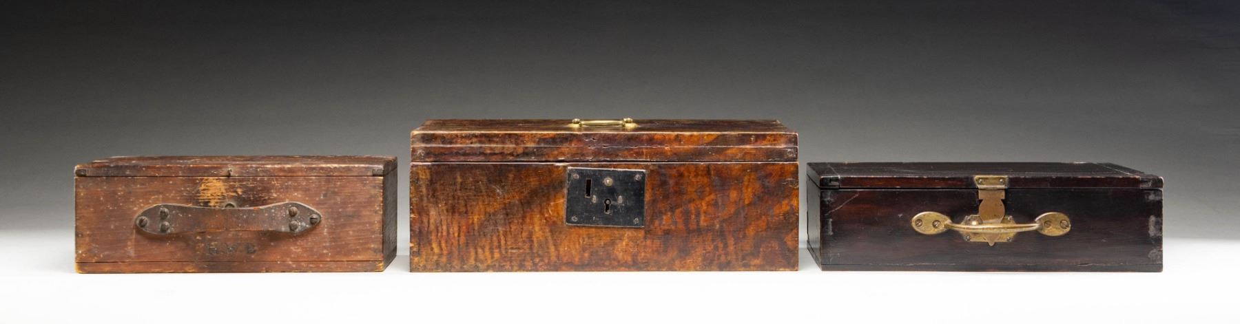 1) 1- Vintage dark varnish pine with brass fittings measures 13" x 9" x 4", holding 95 old 12 gauge shot shells by UMC, Remington and Western Field. CONDITION: box is very good with old finish; shells good some fired. 2) 1- Old pine box with leather handle, stamped "H.W.L.", having hook latch, holding 38 brass cases by UMC and Winchester, 12 old paper shells by US Cartridge Co. CONDITION: good; 18 brass shells have never been loaded, remainder have been fired. 3) 1- Early CA. 1820 grain painted box with brass handle on top measures 15" x 8-1/2" x 5-1/2", holding 11- 10 bore brass cases mostly by UMC. CONDITION: very good; with old finish, rubbed on edges. Shells are fair to good. PROVENANCE: From the Private Collection of Berrien Moore III. (02-25870-12/MGM). $200-500.