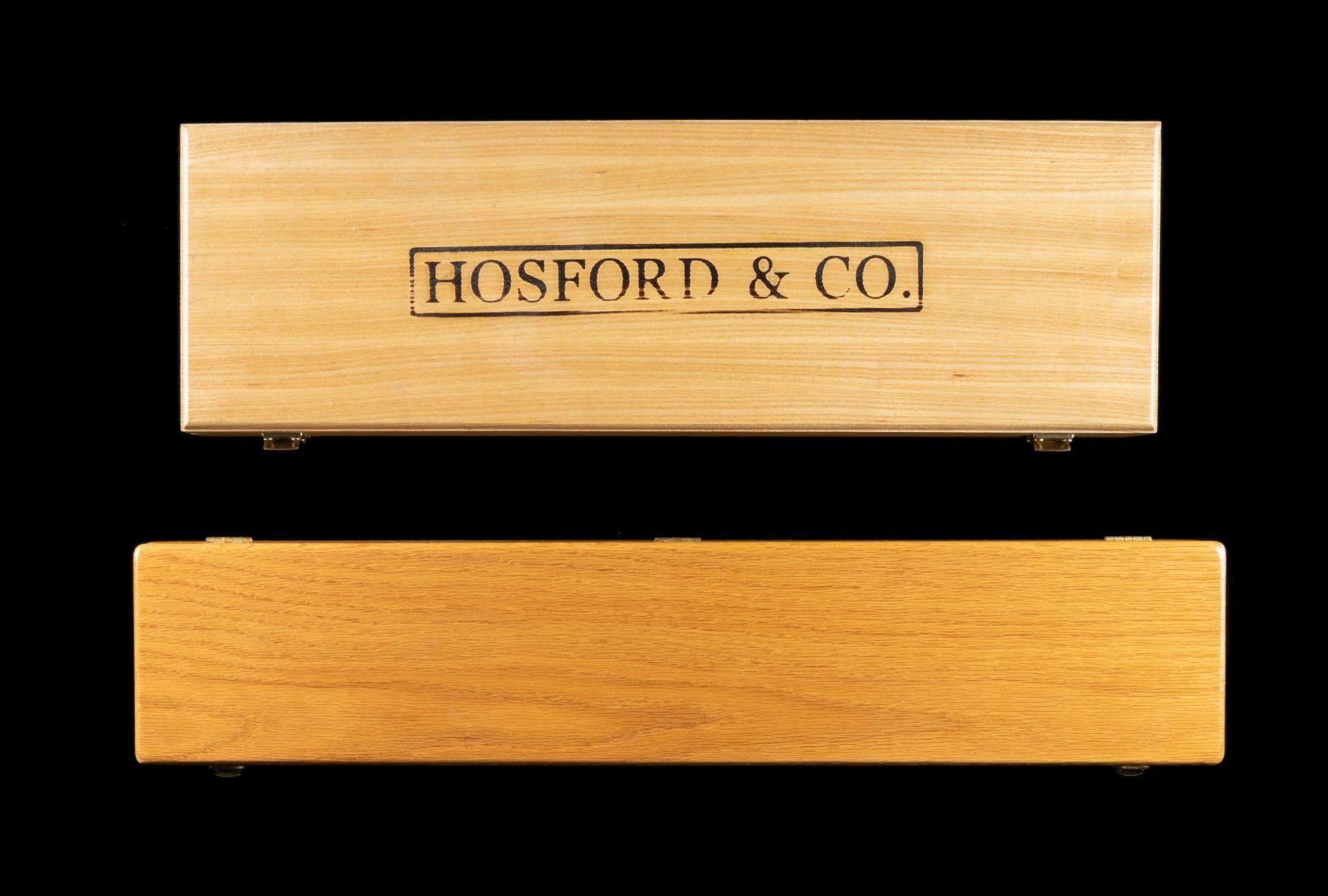 1) 1- "HOSFORD & CO." older style wall thickness gauge with two spuds, large for 20 gauge and up and smaller for .410 & 28 gauge. Complete in wooden box. CONDITION: very fine; looks unused. 2) 1- "Stan Baker" pull through choke and bore gauge for 12, 20, and 410 gauges with extra spuds for 28 and .410. Complete in wooden box. CONDITION: fine; showing overall light oxidation which should clean. PROVENANCE: From the Private Collection of Berrien Moore III. (02-25880-1/MGM). $400-800.