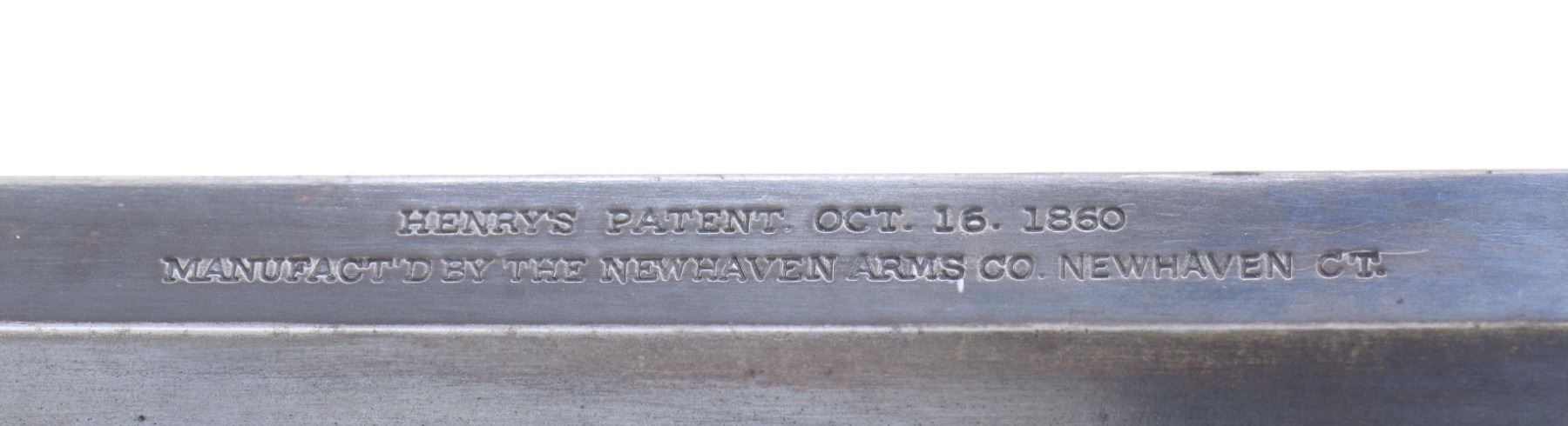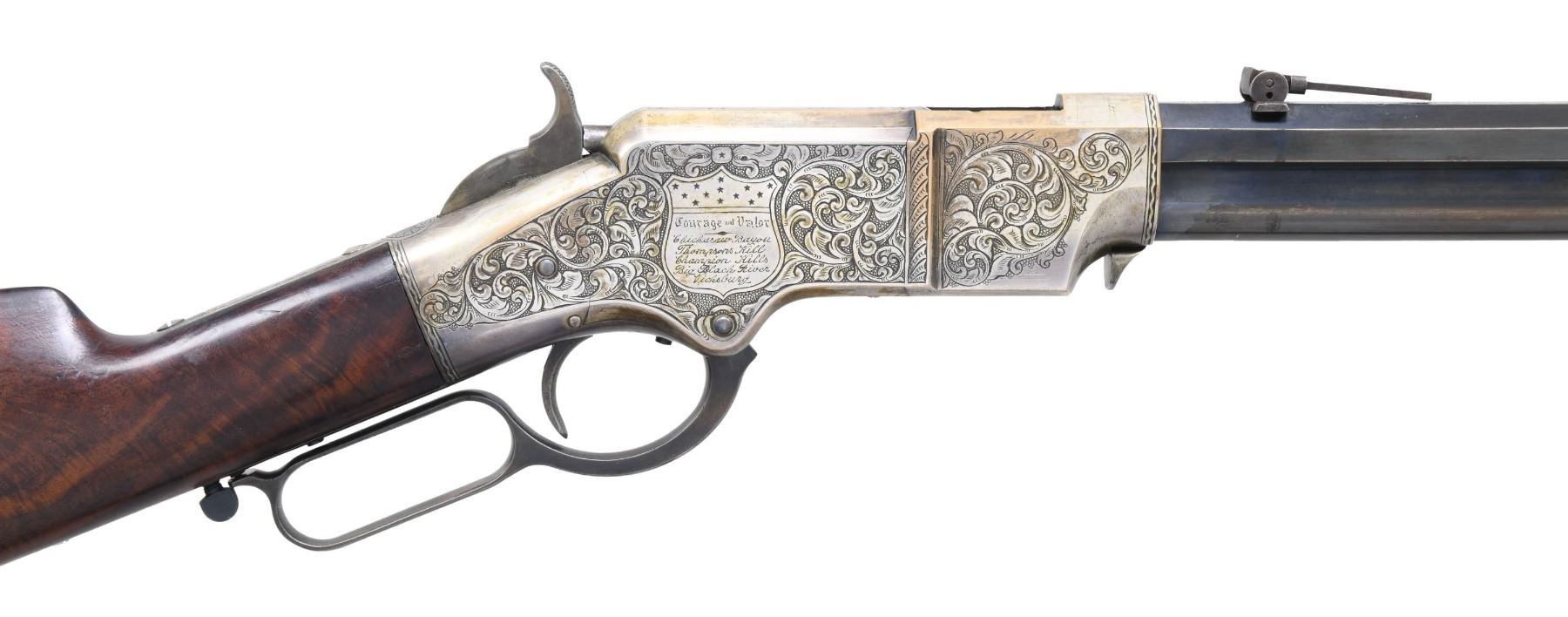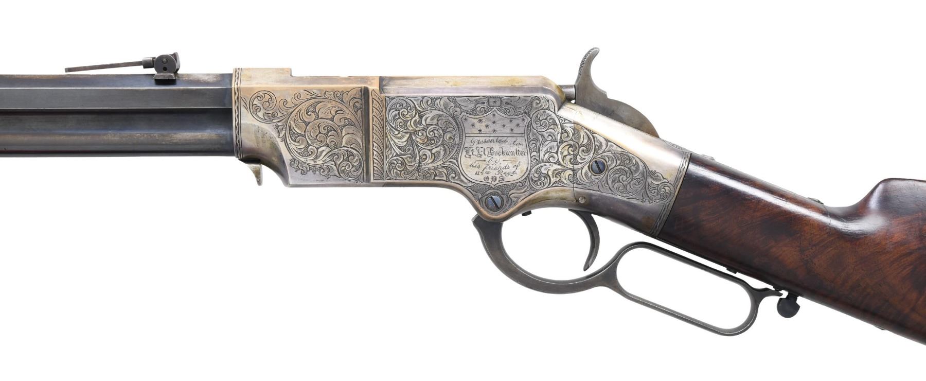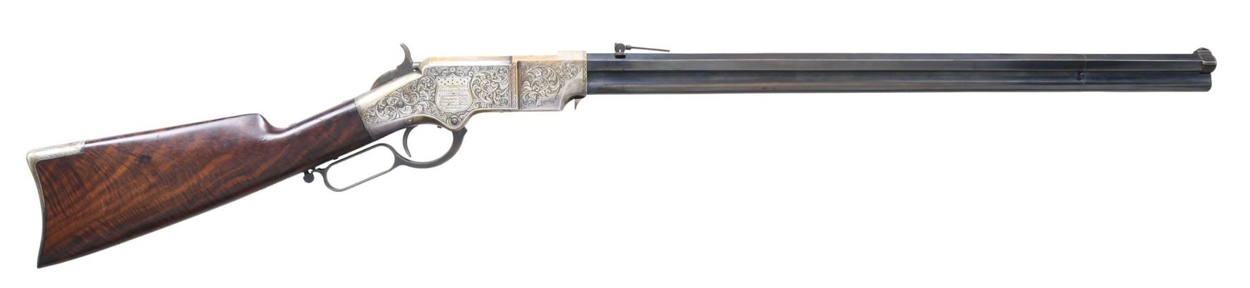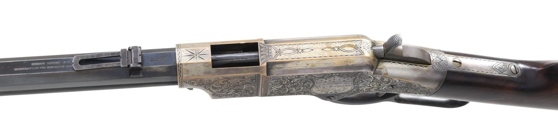 PRESENTATION CIVIL WAR HENRY RIFLE. Cal. 44. S# 3366. This is a beautiful piece of work and I don't believe any of it is original, but a true craftsman either restored it from a frame or totally fabricated it including the deluxe style Hodgson engraving, fiery burled walnut, minty barrel, and presentation to E.L Buckwalter, 114th OVI. UNATTACHED ACCESSORIES: copy of Gary Hendershott catalog entry offering his rifle at six-figure price. CONDITION: excellent overall, barrel retains most of a bright blue finish, crisp barrel address and serial number 3366 which was not previously in the database. Frame & butt plate are punch dot & scroll engraved in the style of Hoggson, silver plating about 80% intact, finely fit and finished figured walnut stock. Serial numbers were observed on the four screws that could be removed, butt plate and the barrel. Mechanics are crisp, bright shiny rifled six land and groove bore. (25-6729/JS). MODERN. $9,000-14,000.