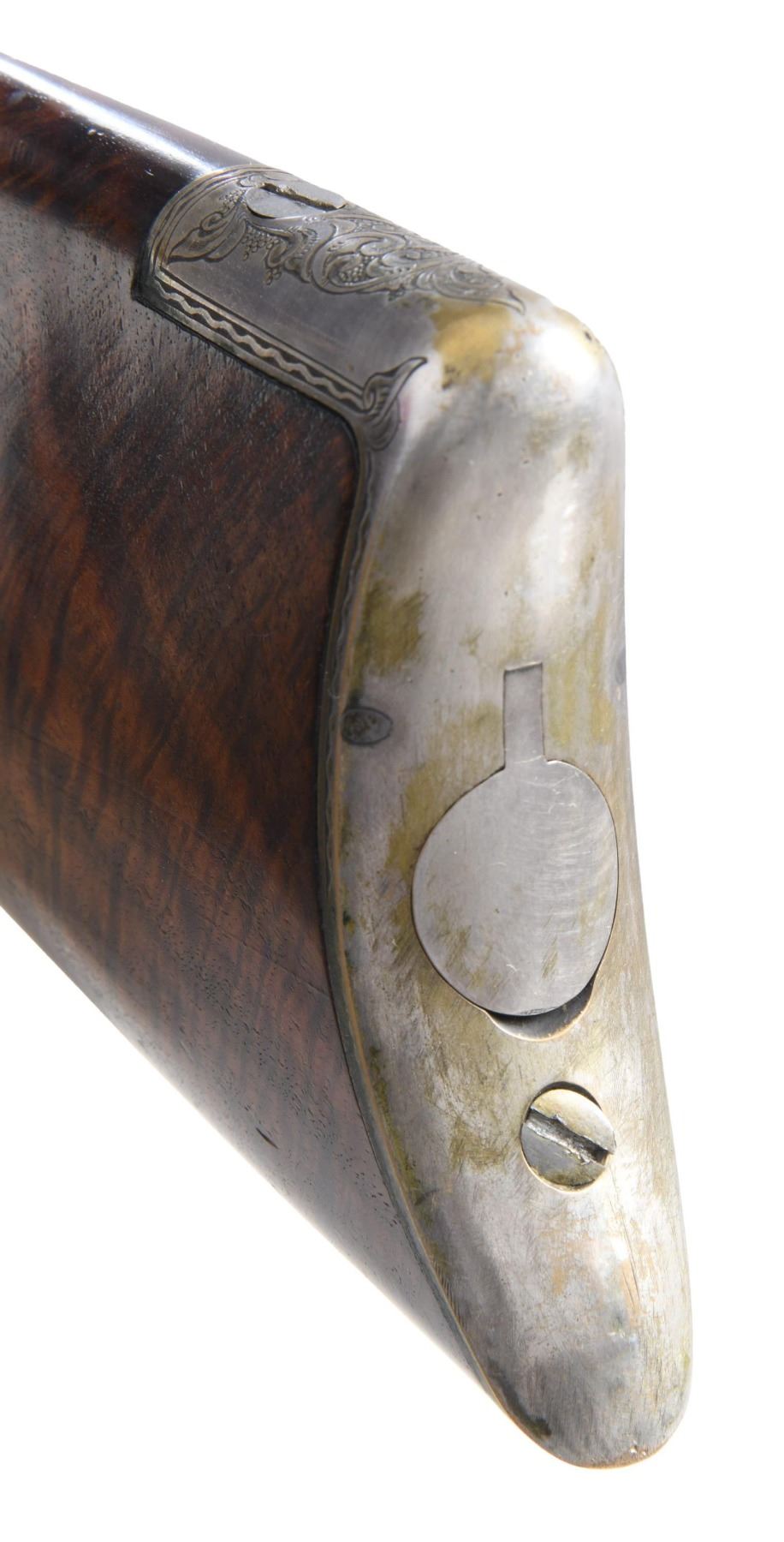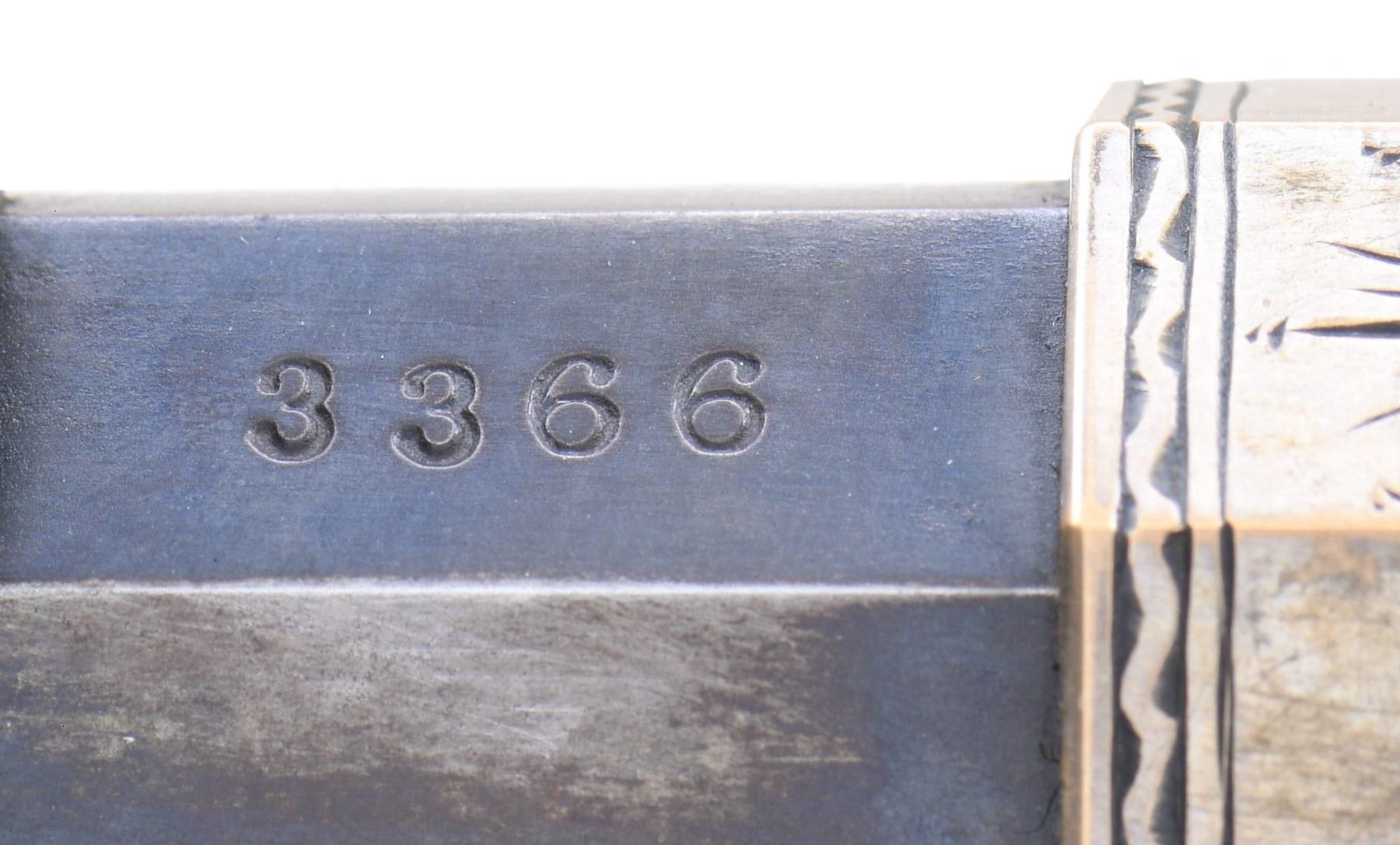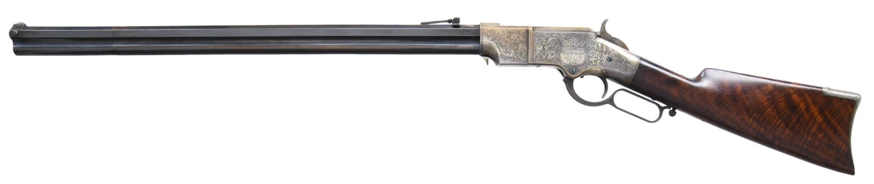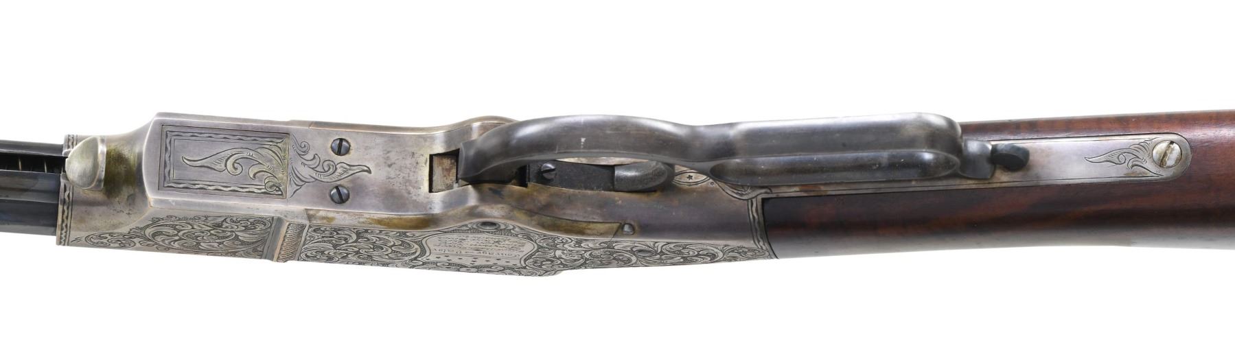 PRESENTATION CIVIL WAR HENRY RIFLE. Cal. 44. S# 3366. This is a beautiful piece of work and I don't believe any of it is original, but a true craftsman either restored it from a frame or totally fabricated it including the deluxe style Hodgson engraving, fiery burled walnut, minty barrel, and presentation to E.L Buckwalter, 114th OVI. UNATTACHED ACCESSORIES: copy of Gary Hendershott catalog entry offering his rifle at six-figure price. CONDITION: excellent overall, barrel retains most of a bright blue finish, crisp barrel address and serial number 3366 which was not previously in the database. Frame & butt plate are punch dot & scroll engraved in the style of Hoggson, silver plating about 80% intact, finely fit and finished figured walnut stock. Serial numbers were observed on the four screws that could be removed, butt plate and the barrel. Mechanics are crisp, bright shiny rifled six land and groove bore. (25-6729/JS). MODERN. $9,000-14,000.