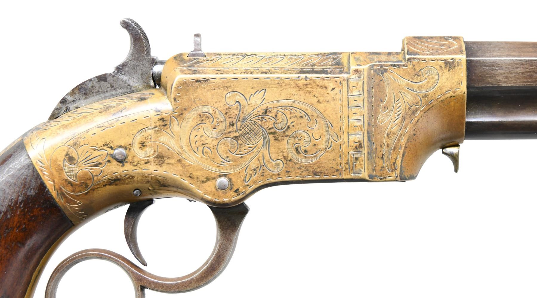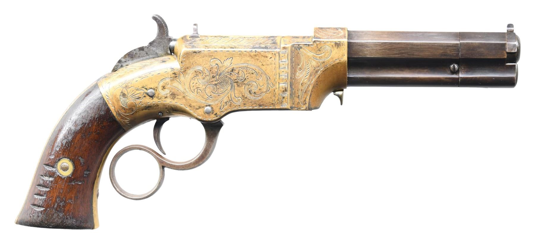 VOLCANIC LEVER ACTION PISTOL. Cal 31. S# 2000. Manufactured between 1857-1860 after the breakup of Volcanic Arms Company by newly formed New Haven Arms Company, continued making same design for the self-contained "rocket ball" cartridges. Standard configuration 3.5" octagonal barrel, integral 6-shot spring loaded magazine, "Volcanic" dropped in address "NEW HAVEN CONN" PATENT FEB 14 1854" stamped in one line on top flat, fixed notch rear sight, pinched post front sight, brass frame, replaced wood grips. CONDITION: very good overall as refinished, custom engraved after manufacture, dull reblued, good barrel marking, brass has mottled patina, replacement grips well fit and are numbered to gun. Mechanics good, crisp rifled bore. Accompanying casing is very good, green velvet lined, mildewed with brass oiler & functioning key. (01-26753/JS). ANTIQUE. $2,000-4,000.