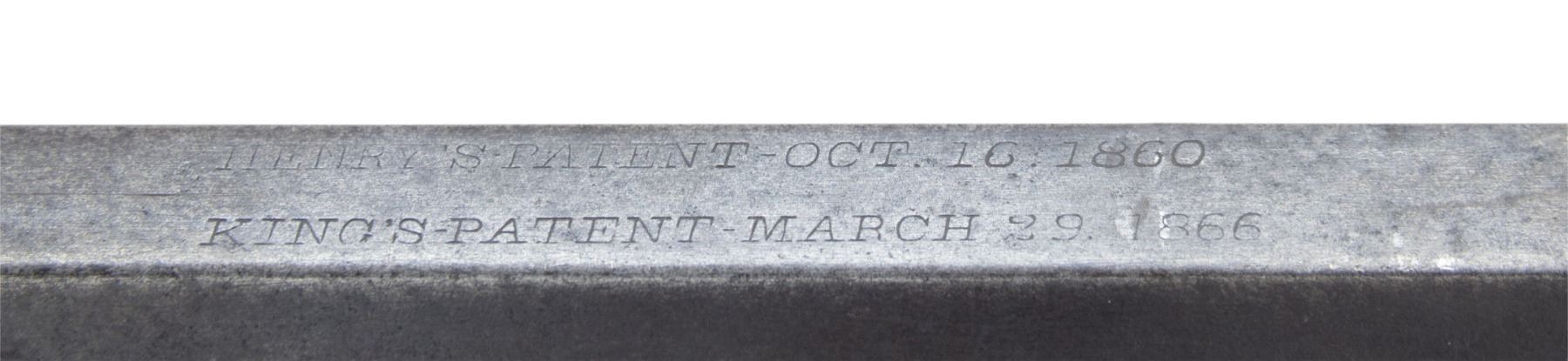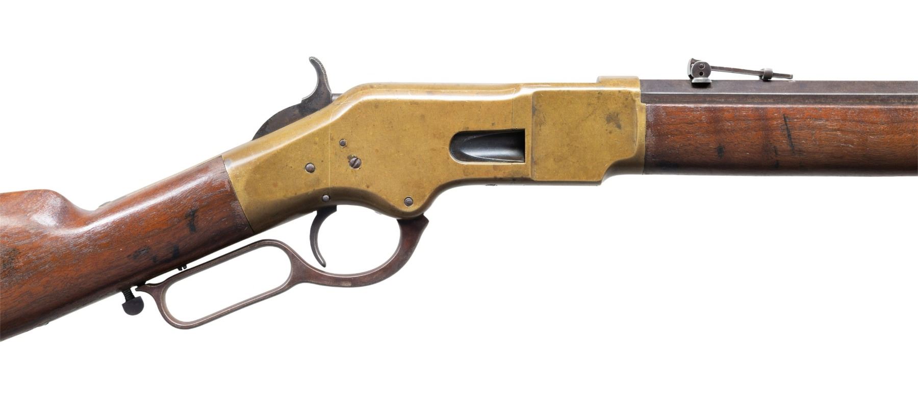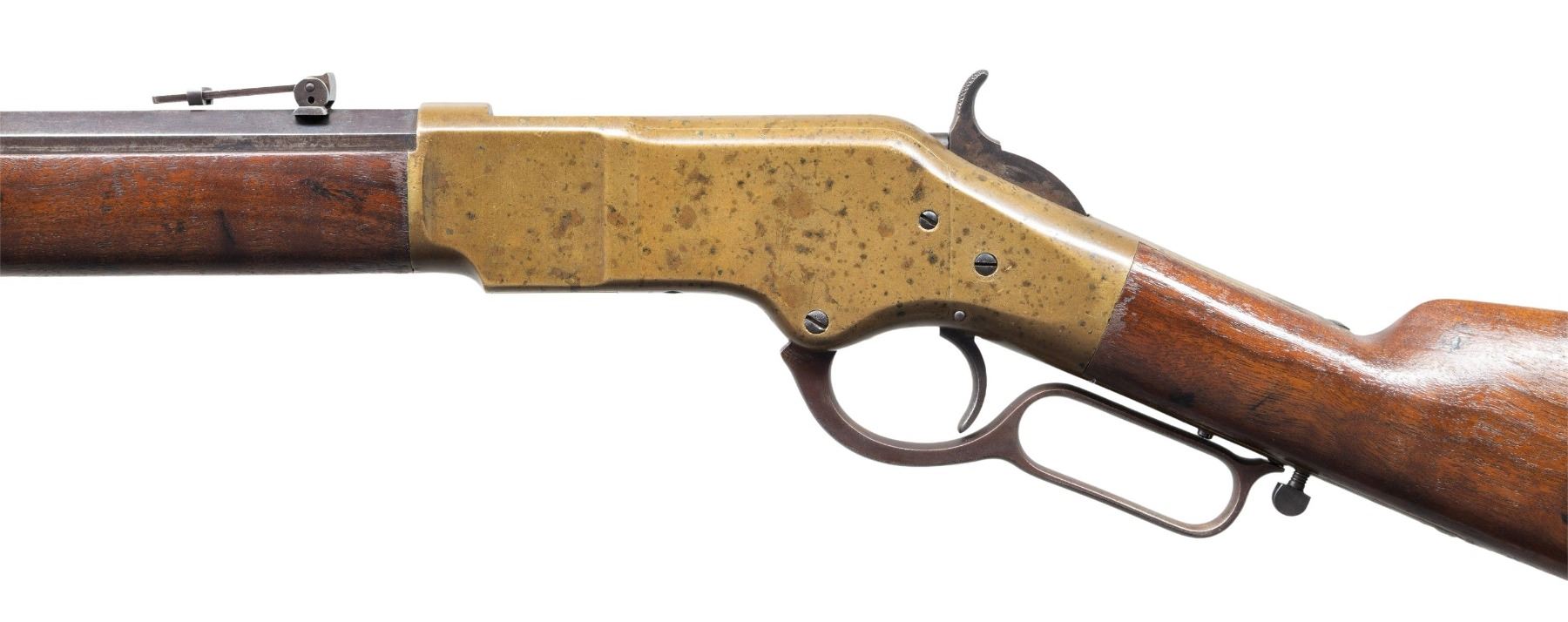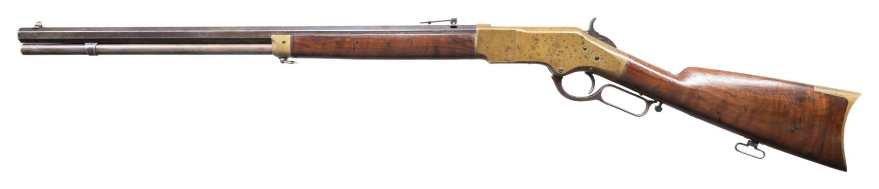 Cal. 44 HRF. S# 15682 (found on left inside of lower tang). Bbl. 24" octagon. Blade front sight with graduated leaf rear sight. Top flat of bbl. is marked "HENRY'S PATENT - OCT. 16, 1860/ KING'S PATENT - MARCH 29, 1866". Brass action featuring the King's patent side loading gate. Full length mag. Walnut forearm and straight grip stock with crescent brass buttplate. Toeline of stock has inletted style sling swivel, front sling swivel is mounted on the brass forearm cap. S# indicates 1868 mfg. CONDITION: bbl. and mag. tube blue have faded to mottled brown showing spotted corrosion. Brass parts have acquired an uncleaned pleasing dark patina showing spots of dark tarnish, most prevalent on the left side. Wood has added finish over scratches, marks, and dents. Sound mechanics. Pitted bore retains largely intact rifling. PROVENANCE: The Esteemed Norm Greenberg Collection. (01-27753/DS). ANTIQUE. $3,000-5,000.