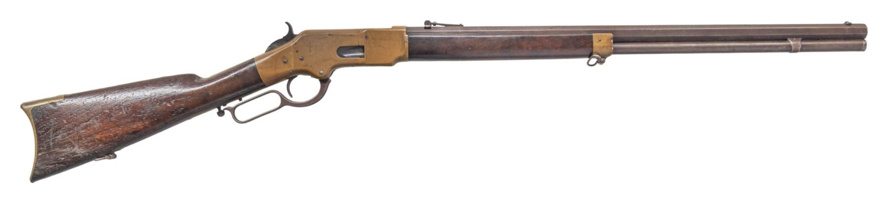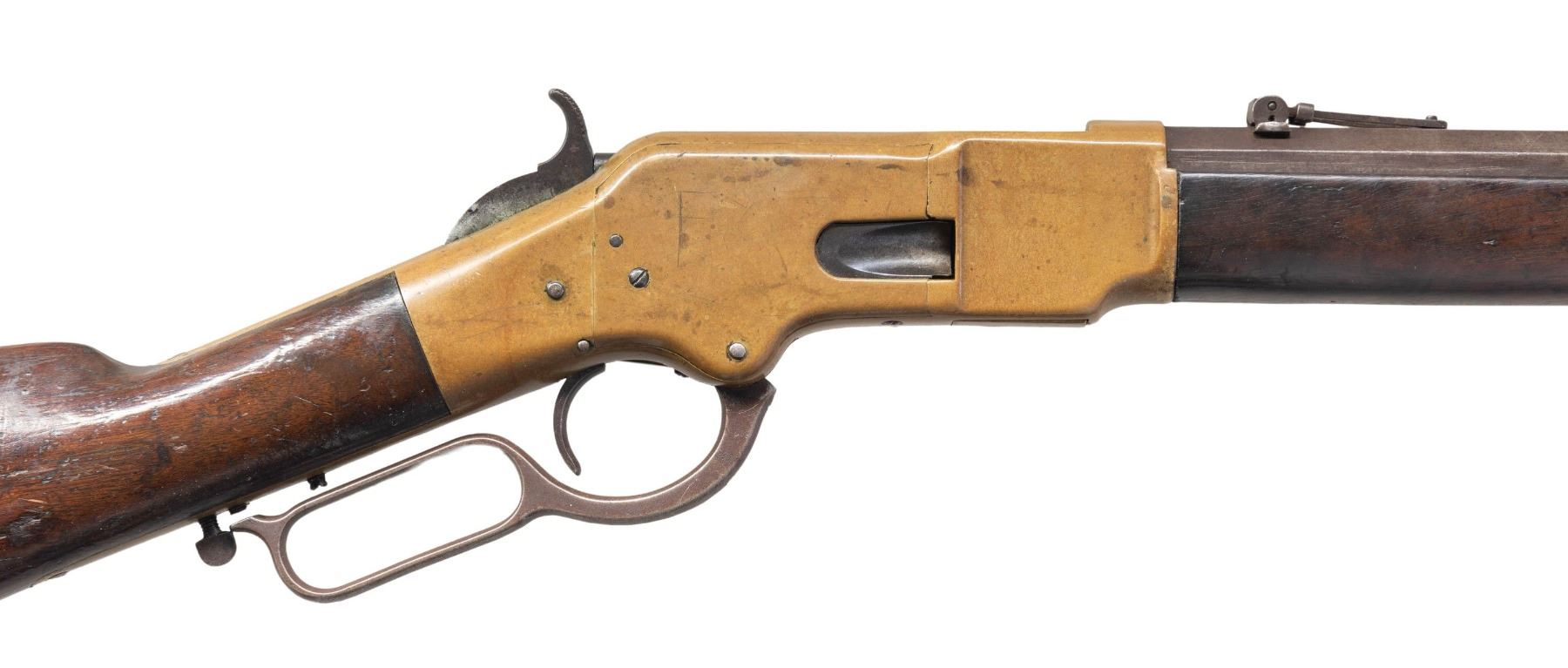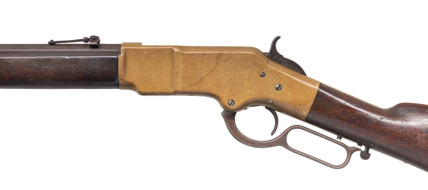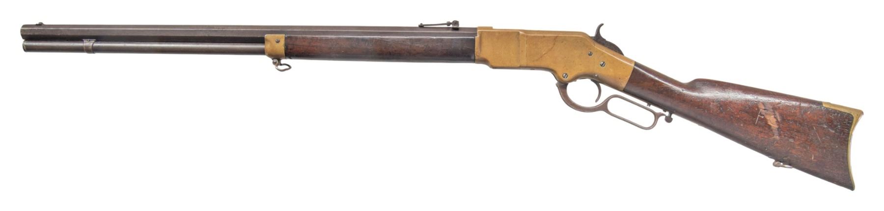 Cal. 44 HRF. S# 16419. Bbl. 24" octagon with Henry and King's Patent markings. Blade front sight with graduated leaf rear sight. Full length mag. Second Model brass frame is flared at the forearm with gracefully curved Henry drop to the hammer area. Forearm and straight grip walnut stock with brass crescent trapdoor buttplate and sling swivels. Left inside of lower tang has apparent hand stamped "RV" followed by "W" and S# "16419". Mfg. in 1868. CONDITION: bbl. and mag. tube finish have faded to brown showing scattered light corrosion. Brass parts have acquired a pleasing dark patina. Stocks have added finish over heavily worn and weathered appearance showing dents and handling marks. Left side of stock has hand carved initials "FC". Sound action. Spring attachment screw on lower tang is an improper replacement. Dark pitted bore with largely intact rifling. PROVENANCE: The Esteemed Norm Greenberg Collection. (01-27751/DS). ANTIQUE. $3,000-5,000.