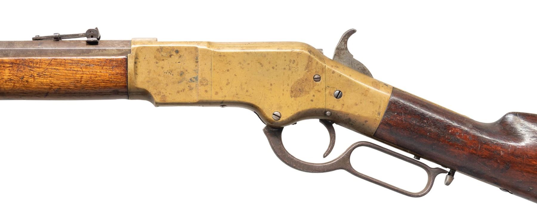 Cal. 44 HRF. S# 41200. Bbl. 24" octagon. Sporting front sight with graduated leaf rear sight. Full length mag. Brass action. Walnut forearm and straight grip stock featuring brass crescent buttplate, brass forearm cap, and sling swivels. Mfg. in 1870. CONDITION: brass action has a mild aged tarnish showing darker spotting with scattered scratches and dents. Bbl. and mag. tube finish has largely faded to gray. Sanded and refinished wood shows numerous scratches, marks, and dents. Stock has small chips around the top tang. Functioning action. Dark pitted bore retains largely intact rifling. PROVENANCE: The Esteemed Norm Greenberg Collection. (01-27754/DS). ANTIQUE. $3,000-5,000.