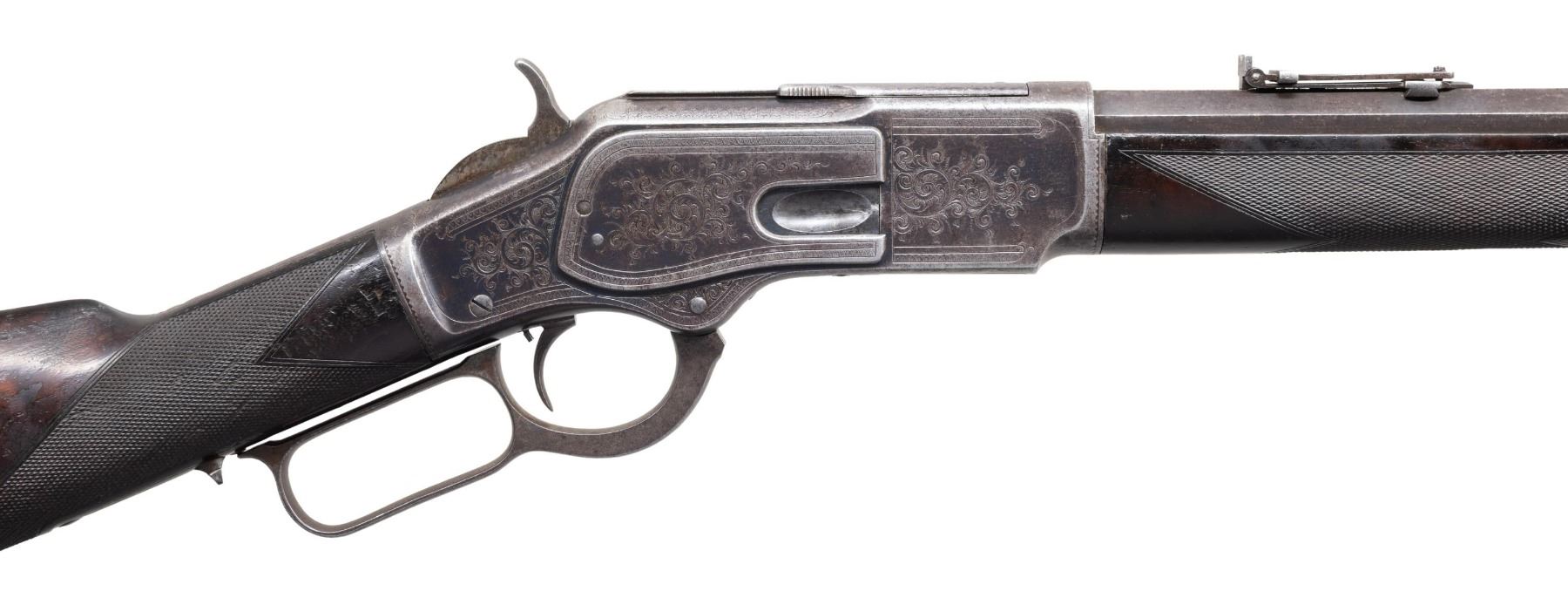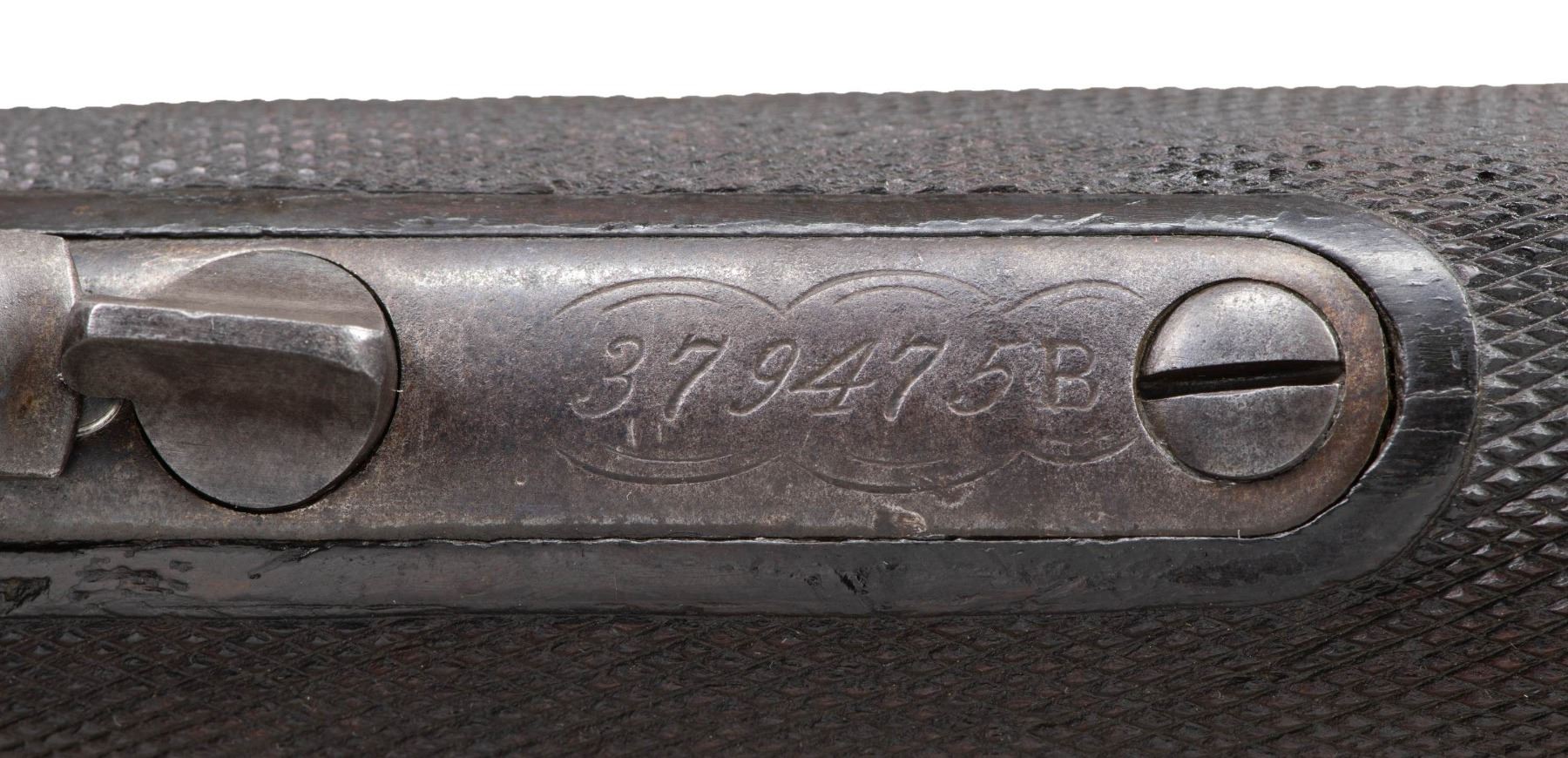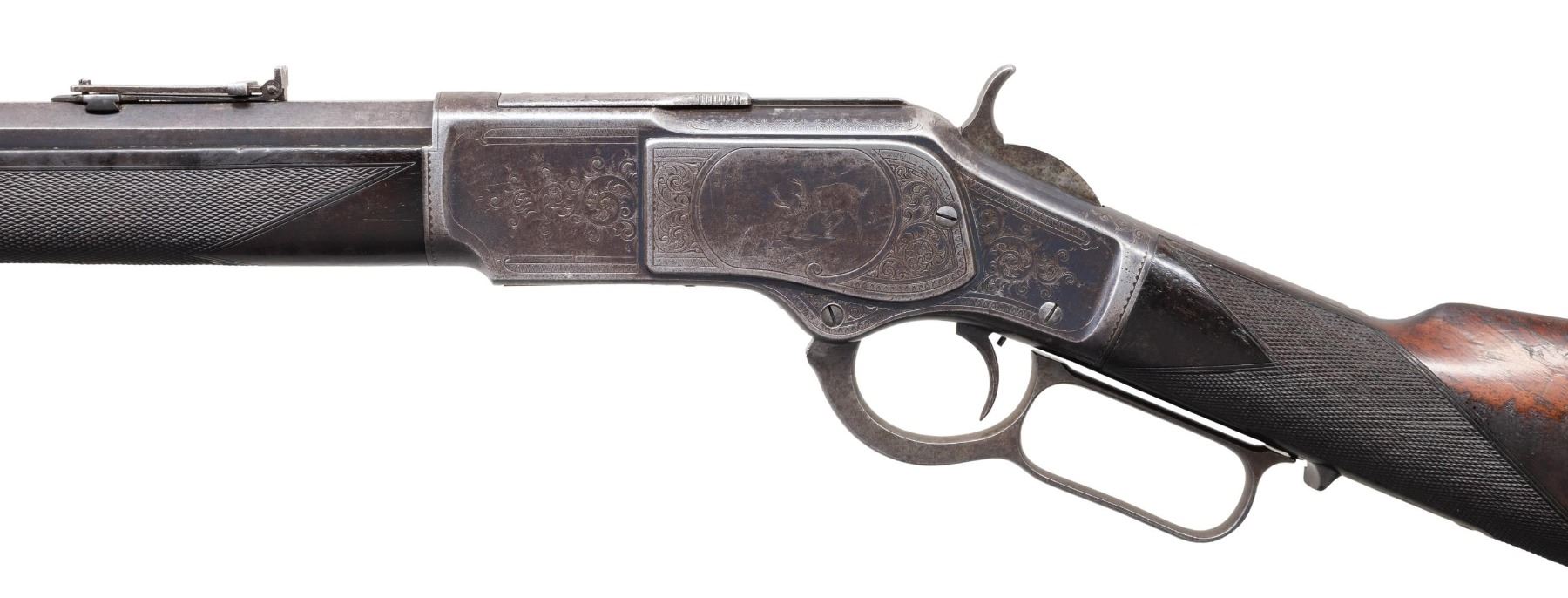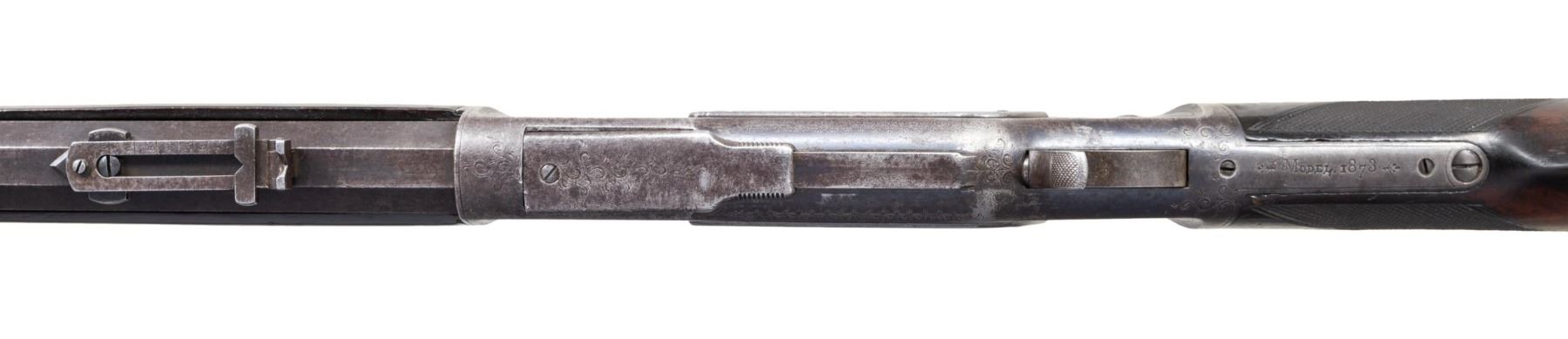 SIGNED & $4.00 ENGRAVED WINCHESTER 1873 3RD MODEL LEVER ACTION SHORT RIFLE WITH FACTORY LETTER. Cal 44-40. S#379475B. Carbine length 20" octagonal barrel. This deluxe Winchester 1873 3rd model left the factory with a multitude of special order features. Fancy checkered stock (straight grip as opposed to the more common pistol grip), set trigger, sling swivels and $4.00 engraving. As a whole, Factory engraved model 1873 rifles are exceptionally rare. "The Winchester Book" by George Madis lists, on page 209 in the "Silver Anniversary Edition 1 of 1000" that it is estimated only "one of each 700 guns were engraved or inscribed". In addition to the engraving, this example is signed on lower tang "J. Ulrich", adding to it's already noteworthy rarity. Wilson states on the same page "One of each 450 rifles had special shorter barrel". While the letter fails to mention the barrel length, included image of original ledger shows that a small batch of 1873s in this S# range left the factory with the exact same features, including barrel length with ditto marks for duplicate features.. Additionally, forearm measures 8 3/8" (1" shorter than standard) which is a feature found only on factory short rifles. Dovetail for mag. hanger measures 3 3/4" from muzzle at center which is correct for all rifles with full length mag. tubes which shows bbl. was never shortened. Checkered, highly figured walnut straight grip stock & forearm appear to be 2X walnut however stock was not removed as all screw heads are in pristine condition and appears to have never been removed since it left the factory in 1891. Front swivel is installed in bottom of forend cap. Rear swivel base is inletted in belly of stock with sling itself measuring 4" from toe. Crescent steel trapdoor buttplate. Sides of action feature John Ulrich's floral scroll engraving amidst a punch dot background with scalloped borders. Left panel features game scene vignette of stand off between red deer stag and deerhound in a finely shaded woodland setting. Additional scroll embellishments are found on forend cap, bottom of carrier block, top of dust cover and top of buttplate. Receiver engraving terminates with beaded borders at front and rear. UNATTACHED ACCESSORIES: original 4 piece Winchester cleaning rod in butt. Rod in very good condition and locks together tightly with no wiggle or looseness. Buffalo Bill Historical Center research letter dated "October 22, 1976" stating the following "The Winchester Records for Model 1873 lists Serial Number 379475B as a rifle, 44 caliber, with an octagonal barrel, set trigger, fancy checkered stock, sling and swivel, leaf sights, Engraved $4.00. It was shipped from the warehouse on April 29, 1891. The "B" in the serial number indicates a minor changed in the mechanism". CONDITION: fine overall and all original, all screw heads remain crisp. Action retains 30% original blue, notably in protected areas with overall thinning and freckling. Engraving is sharp and well defined. Loading gate retains 30% bright, original nitre blue. Bbl. & mag tube have faded to an even brown patina with scattered light handling marks. Lever & hammer show traces of original case color. Stock & forend retain 40% of their original varnish with numerous light to moderate handling marks, dings & impressions with some minor flattening of diamonds. Bore is bright & shiny with remarkably crisp rifling! An exceptionally rare and seldom encountered opportunity to own a special order model 1873 Winchester that would be a worthy addition to any collection. (01-28041/BH). ANTIQUE. $35,000-50,000.