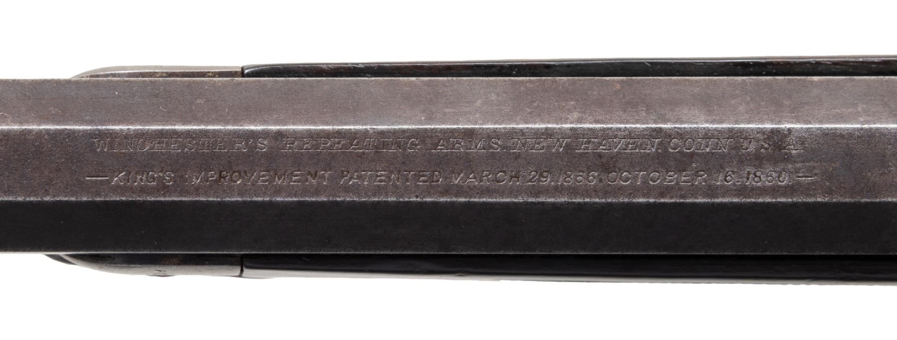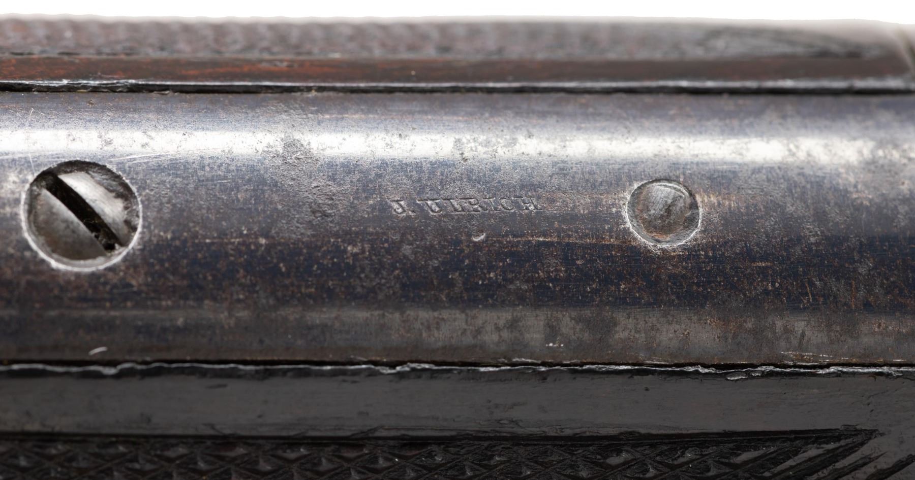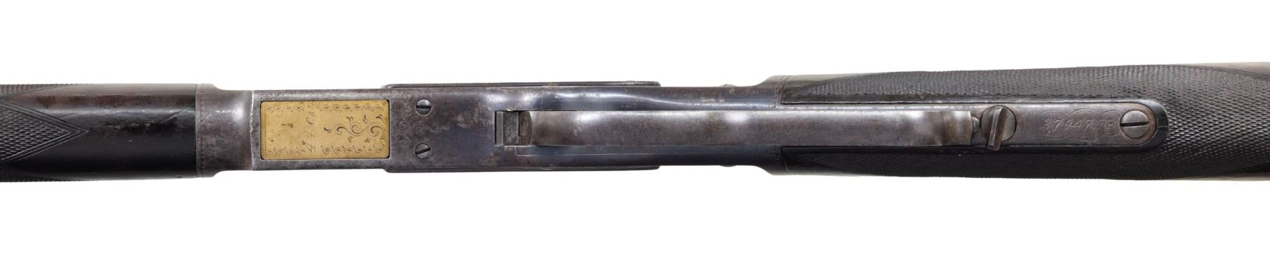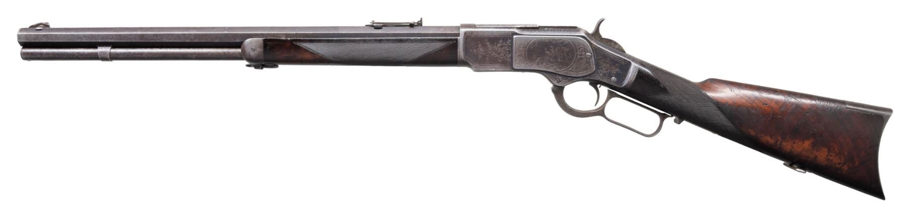 SIGNED & $4.00 ENGRAVED WINCHESTER 1873 3RD MODEL LEVER ACTION SHORT RIFLE WITH FACTORY LETTER. Cal 44-40. S#379475B. Carbine length 20" octagonal barrel. This deluxe Winchester 1873 3rd model left the factory with a multitude of special order features. Fancy checkered stock (straight grip as opposed to the more common pistol grip), set trigger, sling swivels and $4.00 engraving. As a whole, Factory engraved model 1873 rifles are exceptionally rare. "The Winchester Book" by George Madis lists, on page 209 in the "Silver Anniversary Edition 1 of 1000" that it is estimated only "one of each 700 guns were engraved or inscribed". In addition to the engraving, this example is signed on lower tang "J. Ulrich", adding to it's already noteworthy rarity. Wilson states on the same page "One of each 450 rifles had special shorter barrel". While the letter fails to mention the barrel length, included image of original ledger shows that a small batch of 1873s in this S# range left the factory with the exact same features, including barrel length with ditto marks for duplicate features.. Additionally, forearm measures 8 3/8" (1" shorter than standard) which is a feature found only on factory short rifles. Dovetail for mag. hanger measures 3 3/4" from muzzle at center which is correct for all rifles with full length mag. tubes which shows bbl. was never shortened. Checkered, highly figured walnut straight grip stock & forearm appear to be 2X walnut however stock was not removed as all screw heads are in pristine condition and appears to have never been removed since it left the factory in 1891. Front swivel is installed in bottom of forend cap. Rear swivel base is inletted in belly of stock with sling itself measuring 4" from toe. Crescent steel trapdoor buttplate. Sides of action feature John Ulrich's floral scroll engraving amidst a punch dot background with scalloped borders. Left panel features game scene vignette of stand off between red deer stag and deerhound in a finely shaded woodland setting. Additional scroll embellishments are found on forend cap, bottom of carrier block, top of dust cover and top of buttplate. Receiver engraving terminates with beaded borders at front and rear. UNATTACHED ACCESSORIES: original 4 piece Winchester cleaning rod in butt. Rod in very good condition and locks together tightly with no wiggle or looseness. Buffalo Bill Historical Center research letter dated "October 22, 1976" stating the following "The Winchester Records for Model 1873 lists Serial Number 379475B as a rifle, 44 caliber, with an octagonal barrel, set trigger, fancy checkered stock, sling and swivel, leaf sights, Engraved $4.00. It was shipped from the warehouse on April 29, 1891. The "B" in the serial number indicates a minor changed in the mechanism". CONDITION: fine overall and all original, all screw heads remain crisp. Action retains 30% original blue, notably in protected areas with overall thinning and freckling. Engraving is sharp and well defined. Loading gate retains 30% bright, original nitre blue. Bbl. & mag tube have faded to an even brown patina with scattered light handling marks. Lever & hammer show traces of original case color. Stock & forend retain 40% of their original varnish with numerous light to moderate handling marks, dings & impressions with some minor flattening of diamonds. Bore is bright & shiny with remarkably crisp rifling! An exceptionally rare and seldom encountered opportunity to own a special order model 1873 Winchester that would be a worthy addition to any collection. (01-28041/BH). ANTIQUE. $35,000-50,000.