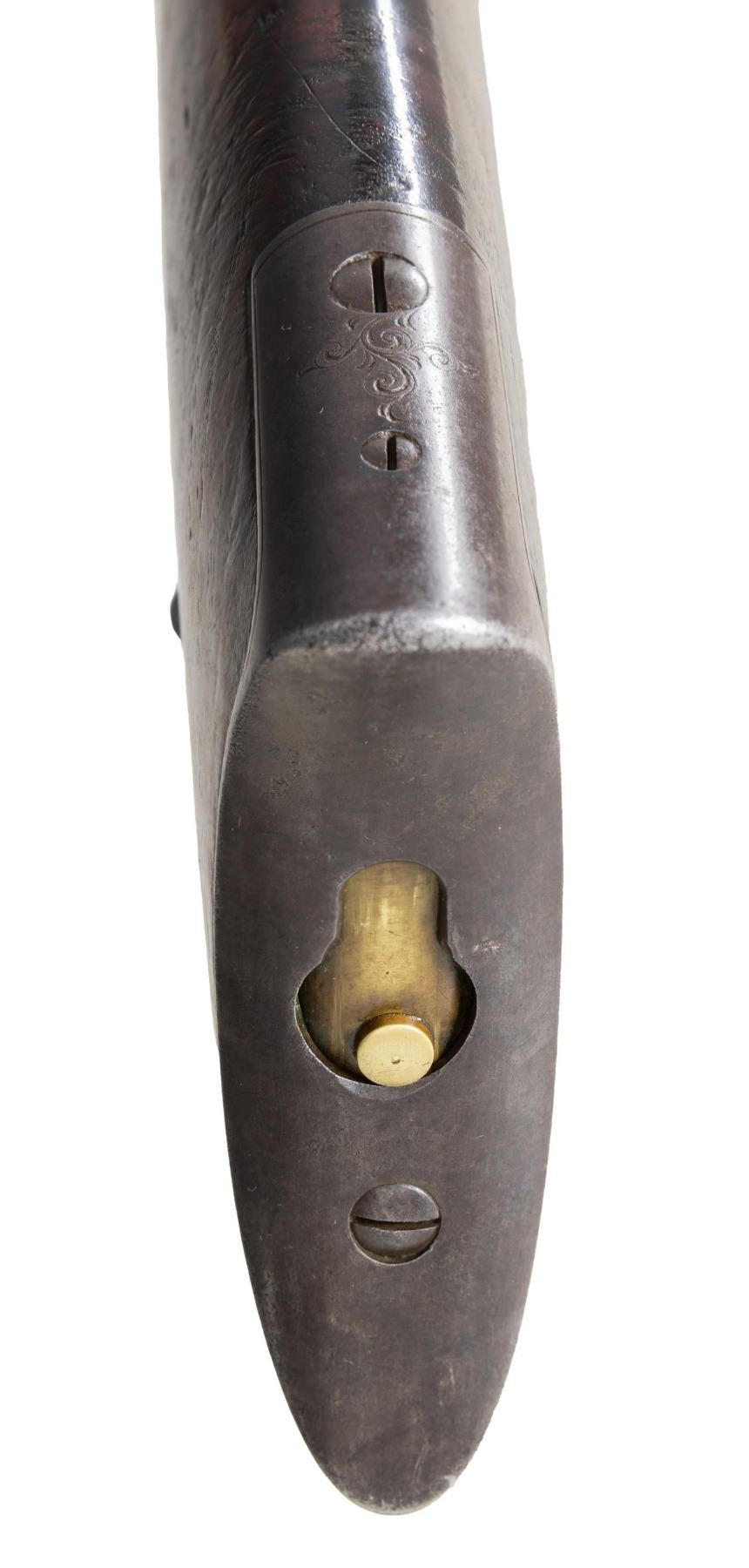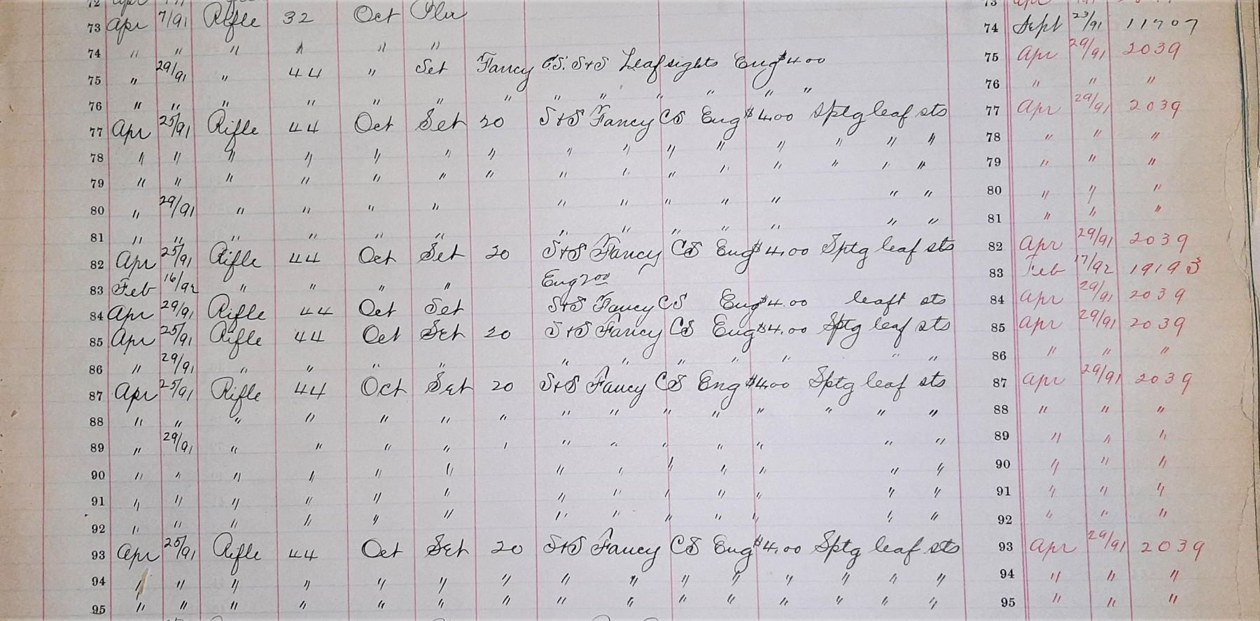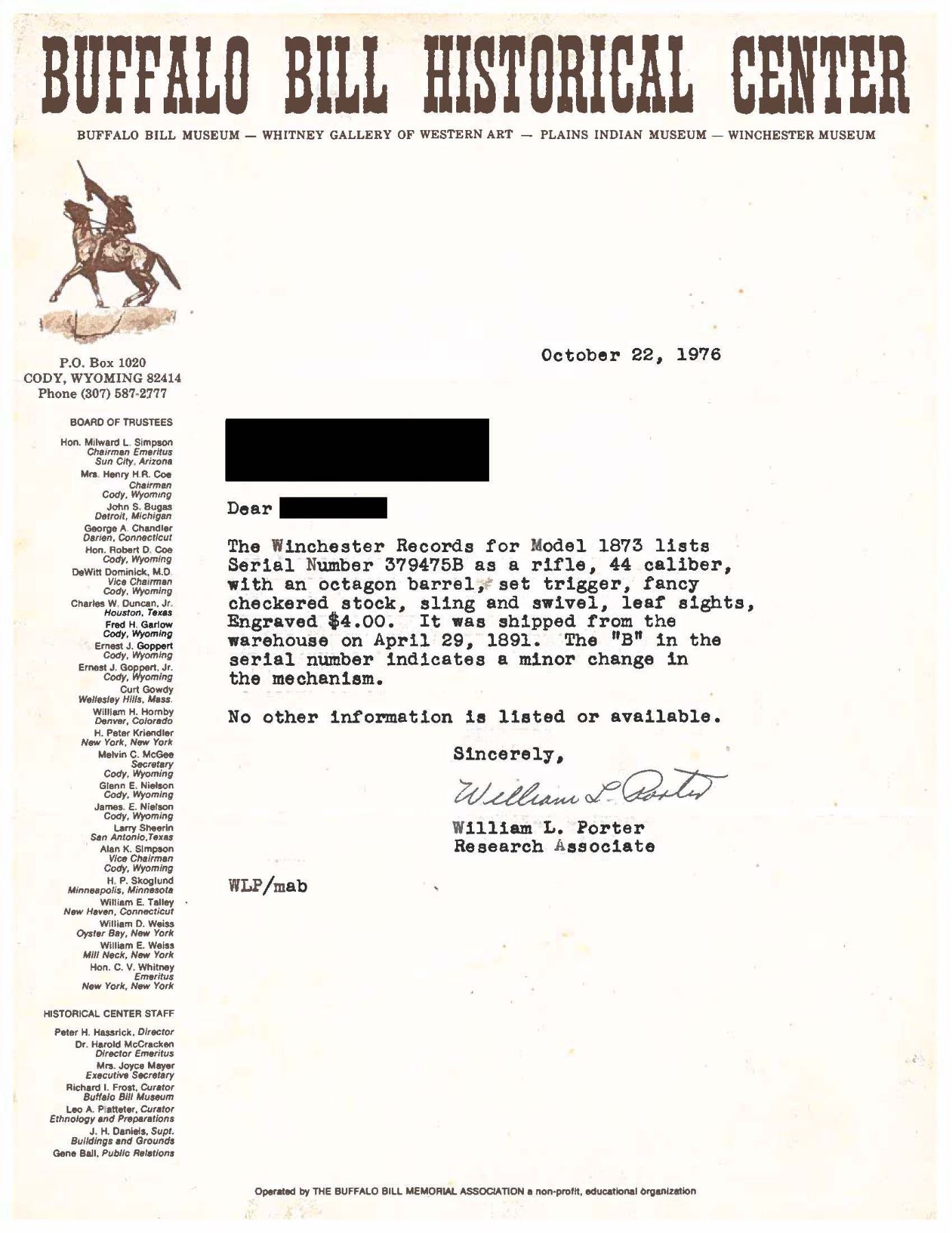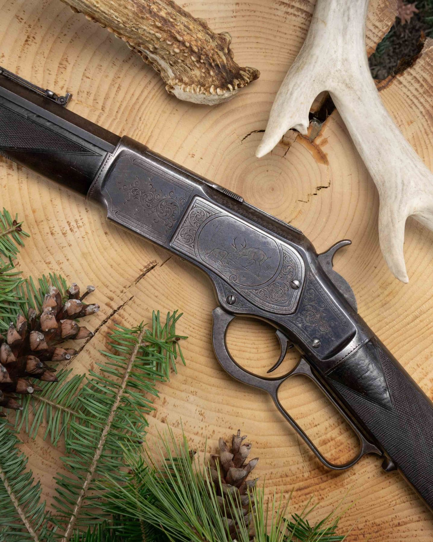 SIGNED & $4.00 ENGRAVED WINCHESTER 1873 3RD MODEL LEVER ACTION SHORT RIFLE WITH FACTORY LETTER. Cal 44-40. S#379475B. Carbine length 20" octagonal barrel. This deluxe Winchester 1873 3rd model left the factory with a multitude of special order features. Fancy checkered stock (straight grip as opposed to the more common pistol grip), set trigger, sling swivels and $4.00 engraving. As a whole, Factory engraved model 1873 rifles are exceptionally rare. "The Winchester Book" by George Madis lists, on page 209 in the "Silver Anniversary Edition 1 of 1000" that it is estimated only "one of each 700 guns were engraved or inscribed". In addition to the engraving, this example is signed on lower tang "J. Ulrich", adding to it's already noteworthy rarity. Wilson states on the same page "One of each 450 rifles had special shorter barrel". While the letter fails to mention the barrel length, included image of original ledger shows that a small batch of 1873s in this S# range left the factory with the exact same features, including barrel length with ditto marks for duplicate features.. Additionally, forearm measures 8 3/8" (1" shorter than standard) which is a feature found only on factory short rifles. Dovetail for mag. hanger measures 3 3/4" from muzzle at center which is correct for all rifles with full length mag. tubes which shows bbl. was never shortened. Checkered, highly figured walnut straight grip stock & forearm appear to be 2X walnut however stock was not removed as all screw heads are in pristine condition and appears to have never been removed since it left the factory in 1891. Front swivel is installed in bottom of forend cap. Rear swivel base is inletted in belly of stock with sling itself measuring 4" from toe. Crescent steel trapdoor buttplate. Sides of action feature John Ulrich's floral scroll engraving amidst a punch dot background with scalloped borders. Left panel features game scene vignette of stand off between red deer stag and deerhound in a finely shaded woodland setting. Additional scroll embellishments are found on forend cap, bottom of carrier block, top of dust cover and top of buttplate. Receiver engraving terminates with beaded borders at front and rear. UNATTACHED ACCESSORIES: original 4 piece Winchester cleaning rod in butt. Rod in very good condition and locks together tightly with no wiggle or looseness. Buffalo Bill Historical Center research letter dated "October 22, 1976" stating the following "The Winchester Records for Model 1873 lists Serial Number 379475B as a rifle, 44 caliber, with an octagonal barrel, set trigger, fancy checkered stock, sling and swivel, leaf sights, Engraved $4.00. It was shipped from the warehouse on April 29, 1891. The "B" in the serial number indicates a minor changed in the mechanism". CONDITION: fine overall and all original, all screw heads remain crisp. Action retains 30% original blue, notably in protected areas with overall thinning and freckling. Engraving is sharp and well defined. Loading gate retains 30% bright, original nitre blue. Bbl. & mag tube have faded to an even brown patina with scattered light handling marks. Lever & hammer show traces of original case color. Stock & forend retain 40% of their original varnish with numerous light to moderate handling marks, dings & impressions with some minor flattening of diamonds. Bore is bright & shiny with remarkably crisp rifling! An exceptionally rare and seldom encountered opportunity to own a special order model 1873 Winchester that would be a worthy addition to any collection. (01-28041/BH). ANTIQUE. $35,000-50,000.