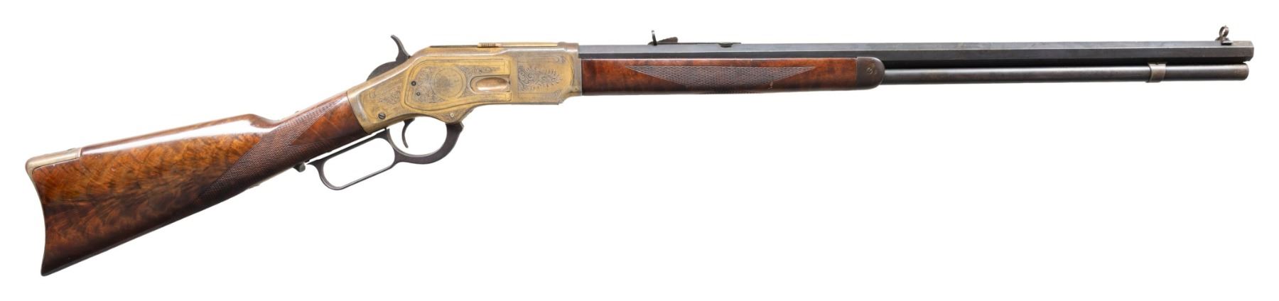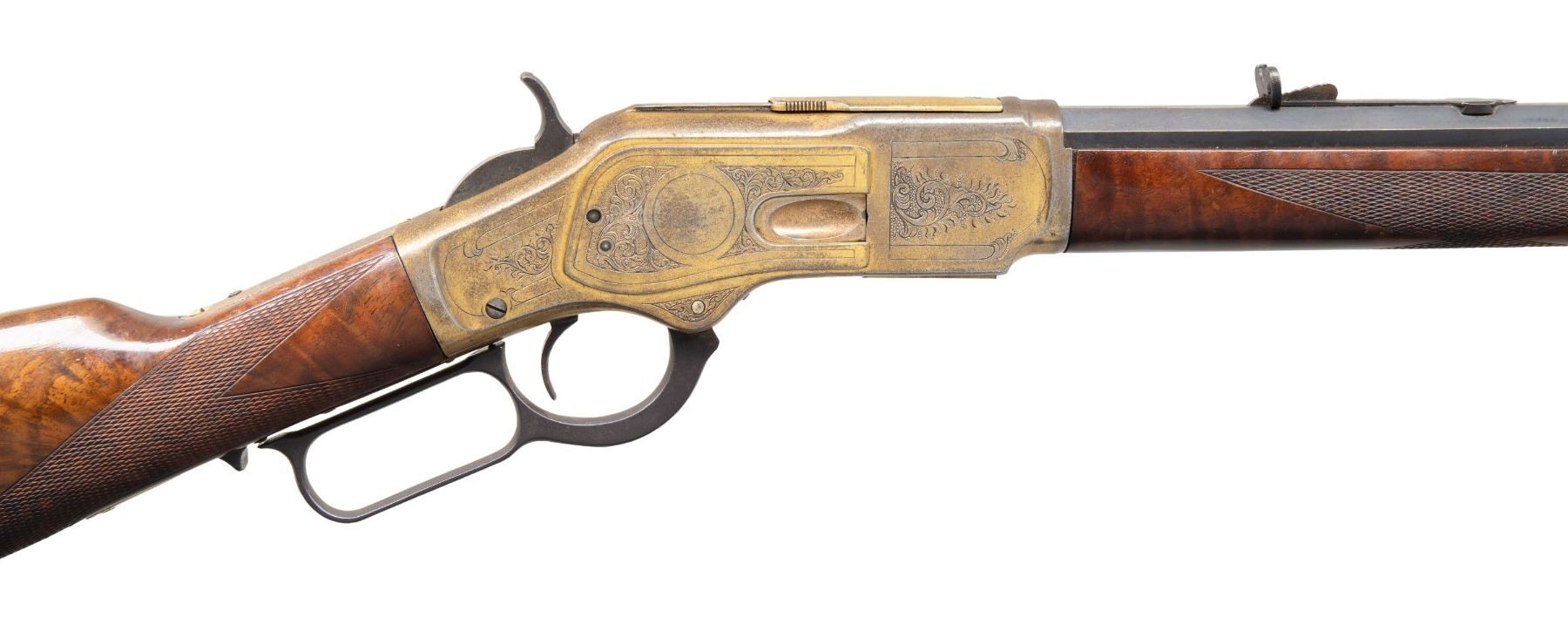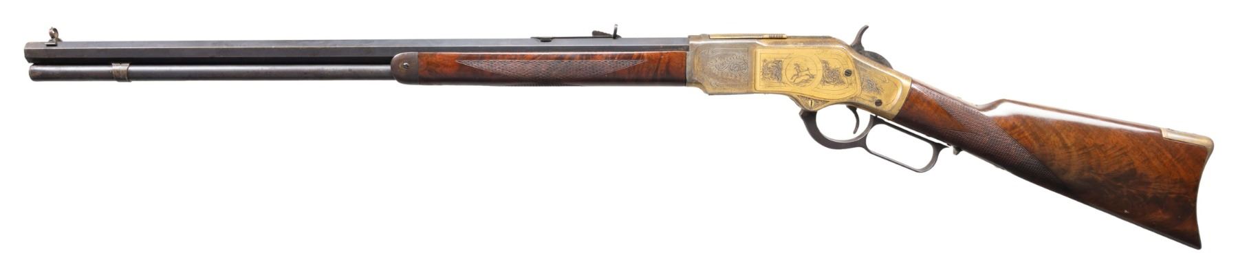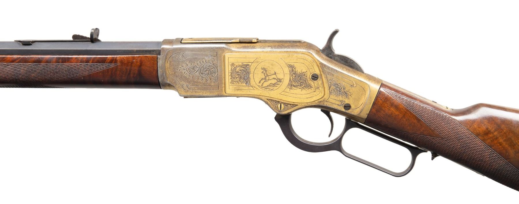 RIFLE. Cal. 38 WCF. S# 338342B. Bbl. 24" octagon. Combination front with sporting rear sights. Full length mag. Action has custom aftermarket vine type foliate scroll engraving with punch dot backgrounds and straight line borders. Left sideplate vignette features a running whitetail buck. Right sideplate vignette has an open circle for inscription. Crescent steel trapdoor buttplate has highlights of matching engraving at the peak. Action has an aftermarket gold plated finish. Bbl., mag. tube, and fittings have standard blue and case colored finish. Custom forearm and straight grip stock of fancy walnut with hand checkering. Mfg. in 1890. CONDITION: bbl. and mag. tube retain 70% dull fading blue showing spotted corrosion and edge wear. Action retains 60% aftermarket nickel finish showing carry and edge wear. Stock and checkering show light wear with some open grain checking on right side of stock. Lever carrier spring screw is missing, leaving the carrier detached. Lightly pitted bore retains sound rifling. (01-26801/DS). ANTIQUE. $4,000-6,000.