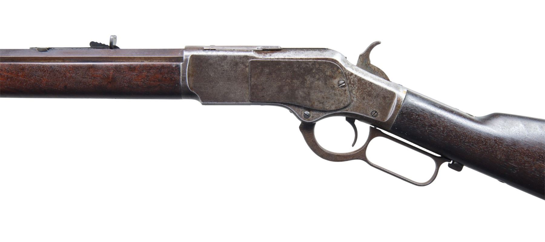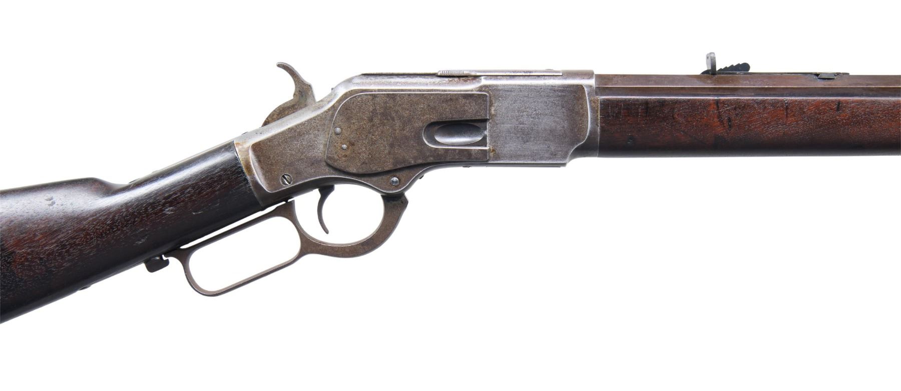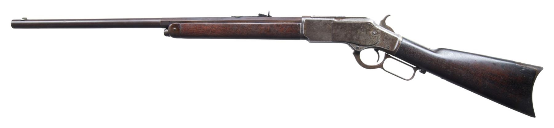 MODEL LEVER ACTION RIFLE. Cal. 44-40. S# 102943A. Bbl. 24 octagon to rnd., with sporting sights. Button mag. Blue finish, with case colored action. Walnut forearm and straight grip stock, with crescent steel trapdoor buttplate. Mfg. in 1882. UNATTACHED ACCESSORIES: Cody Firearms Museum record stating "Rifle/ Barrel Shape: 1/2 Octagon/ Plain trigger/ 1/2 magazine/ Casehardened/ Receiver in warehouse on October 28, 1882/ Shipped from warehouse on October 28, 1882, order number 353". CONDITION: bbl. shows an even brown patina. Action has a mottled gray/brown patina appearance, with spots of light pitting. Hammer shows traces of case colors on its sides. Original wood finish has an age darkened appearance, showing scattered scratches & marks. Mechanically fine, lever screw is a replacement. Bore is generally bright, with strong rifling, showing spots of very light pitting. (01-27047/DS). ANTIQUE. $3,000-4,500.