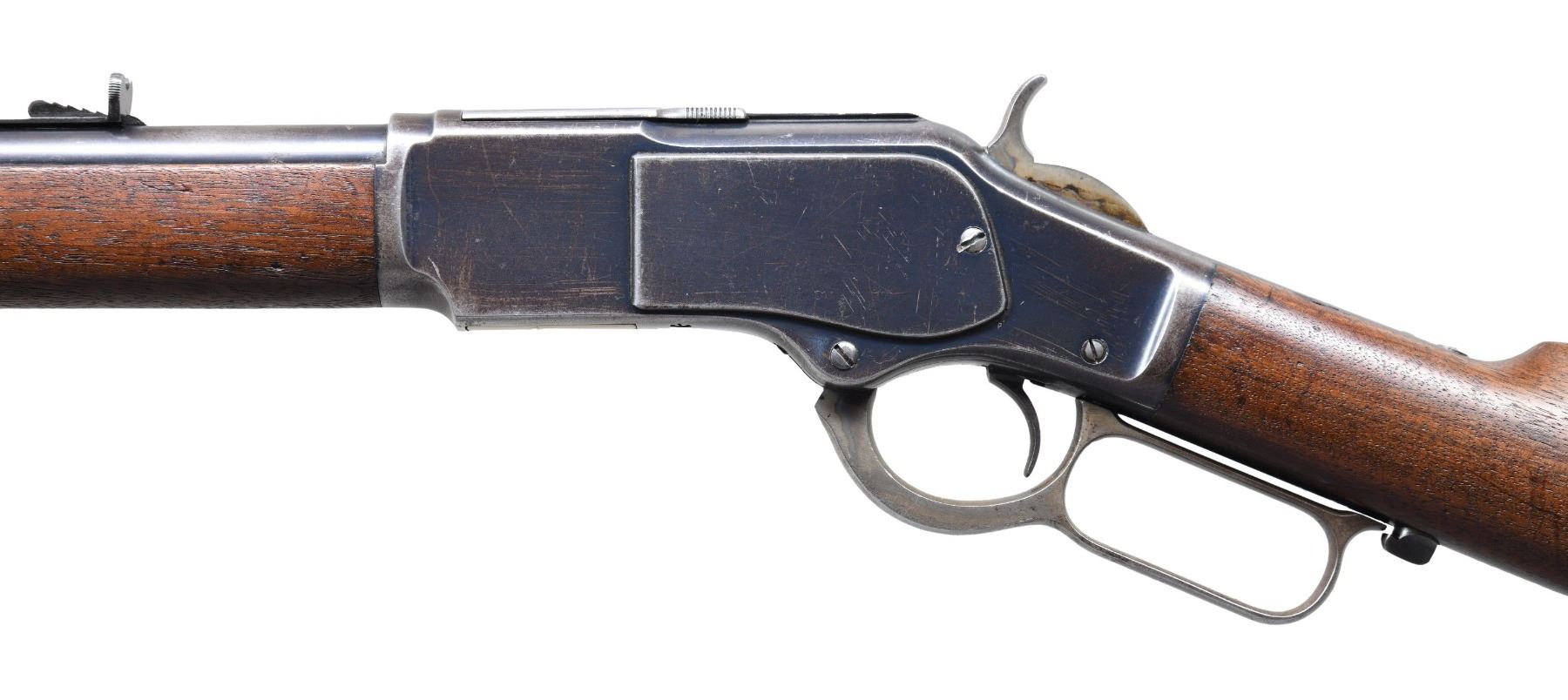 Cal. 38 WCF. S# 269207B. Bbl. 24" rnd., with original sporting sights. Full length mag. Blue finish, with case colored hammer and lever. Walnut forearm and straight grip stock, with crescent steel trapdoor buttplate. Mfg. in 1888. CONDITION: 60% original blue showing carry and edge wear, with numerous light scratches and spotted freckling. Hammer and lever have small amounts of remaining case colors. Original wood finish shows wear with numerous light to moderate scratches & marks. Mechanically fine. Frosted bore retains strong rifling with pitting in grooves. (01-27066/DS). ANTIQUE. $3,500-4,500.