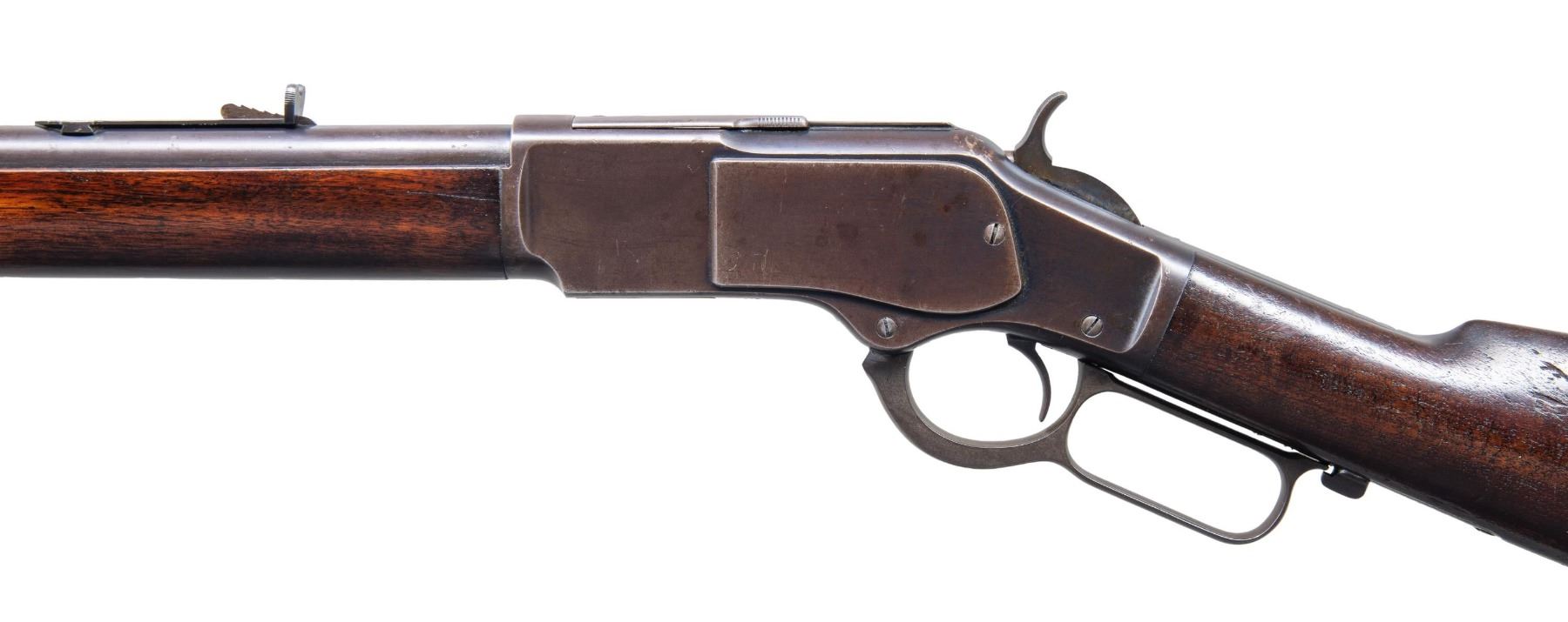Cal. 44 WCF (44-40). S# 269708B. Bbl. 24" rnd., with original sporting sights. Full length mag. Blue finish, with case colored hammer and lever. Walnut forearm and straight grip stock, with crescent steel trapdoor buttplate. Mfg. in 1888. CONDITION: metal finish has faded to an even brown patina, showing scattered scratches and handling marks. Original wood has added finish. Forearm has a 3" hairline crack extending from the left side of the action. Mechanically fine. Bore is bright with sound rifling, showing scattered spots of very light pitting. (01-27091/BH). ANTIQUE. $3,500-4,500.