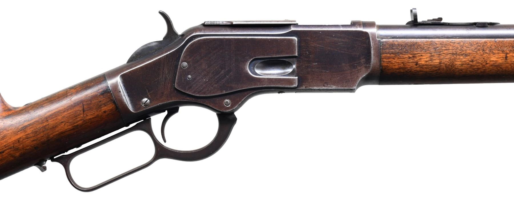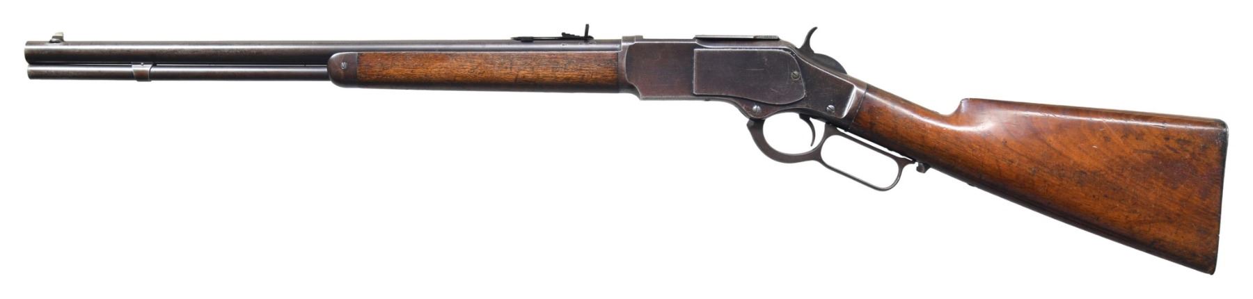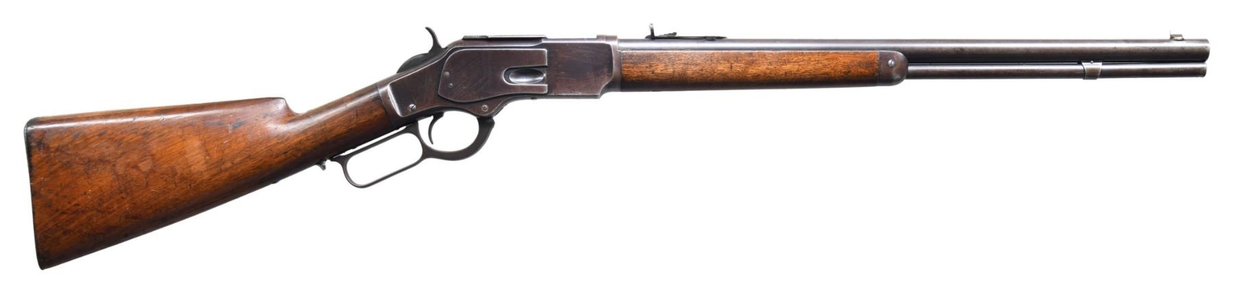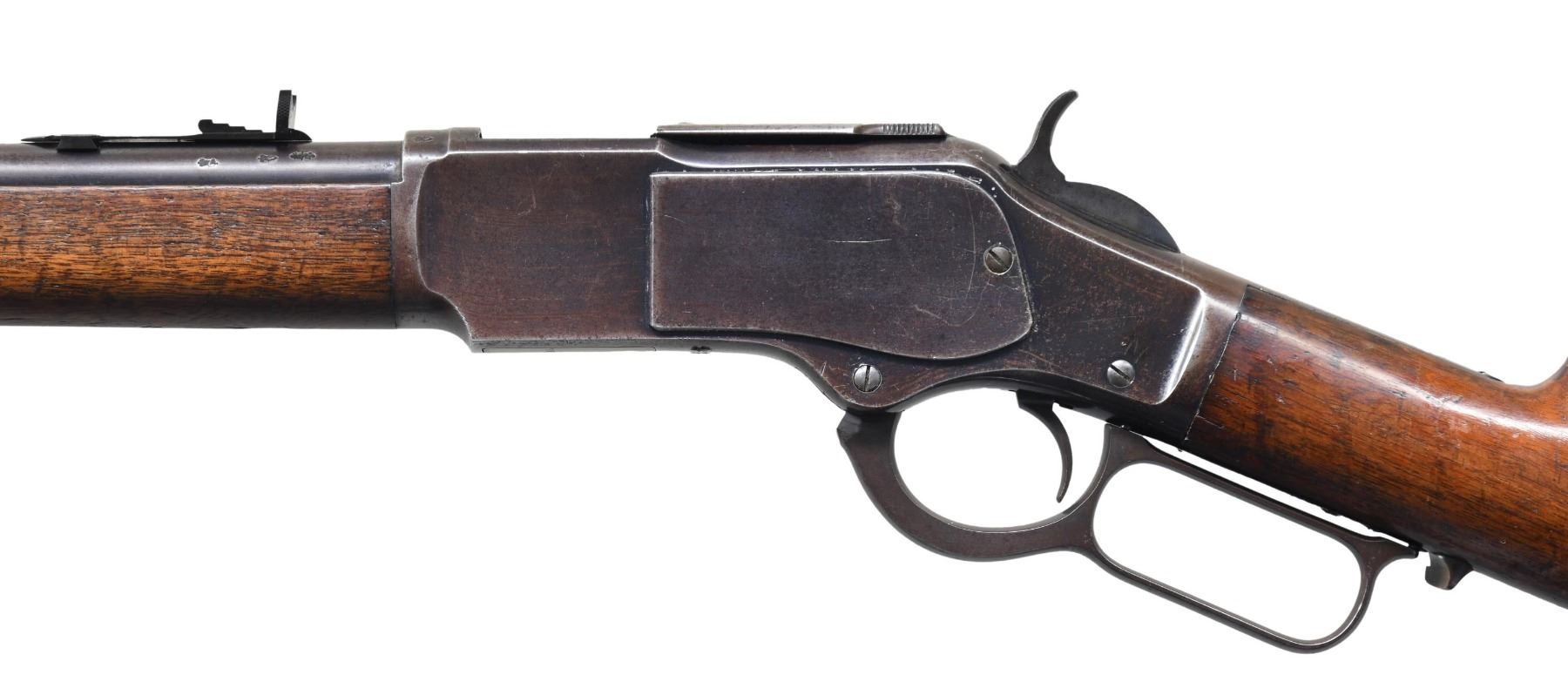 WINCHESTER 1873 THIRD MODEL LEVER ACTION SHORT RIFLE. Cal. 32 WCF (32-20). S# 150471A. Bbl. 20" rnd., 4" shorter than standard. "The Winchester Book" by George Madis lists, on page 209 in the "Silver Anniversary Edition 1 of 1000" Wilson states "One of each 450 rifles had special shorter barrel". Original sporting sights. Full length mag. Blue finish, with case colored hammer and lever. Left side of the bbl. and action show British proofs. Proper 8 3/8" short rifle length forearm, with straight grip walnut stock having steel shotgun buttplate. Mfg. in 1884. UNATTACHED ACCESSORIES: Cody Firearms Museum record stating "Type: Rifle/ Caliber: 32/ Barrel Type: Round/ Trigger: Plain/ Shotgun butt/ Received in warehouse on June 10, 1884/ Shipped from warehouse on June 11, 1884, Order number 12676". CONDITION: 30% original blue fading to brown, showing scratches and marks. Stocks have worn original finish, showing numerous scratches and marks, with small chips around top tang. Mechanically fine. Bore is generally bright, with sound rifling, showing spots of pitting. (01-27044/DS). ANTIQUE. $4,000-5,500.