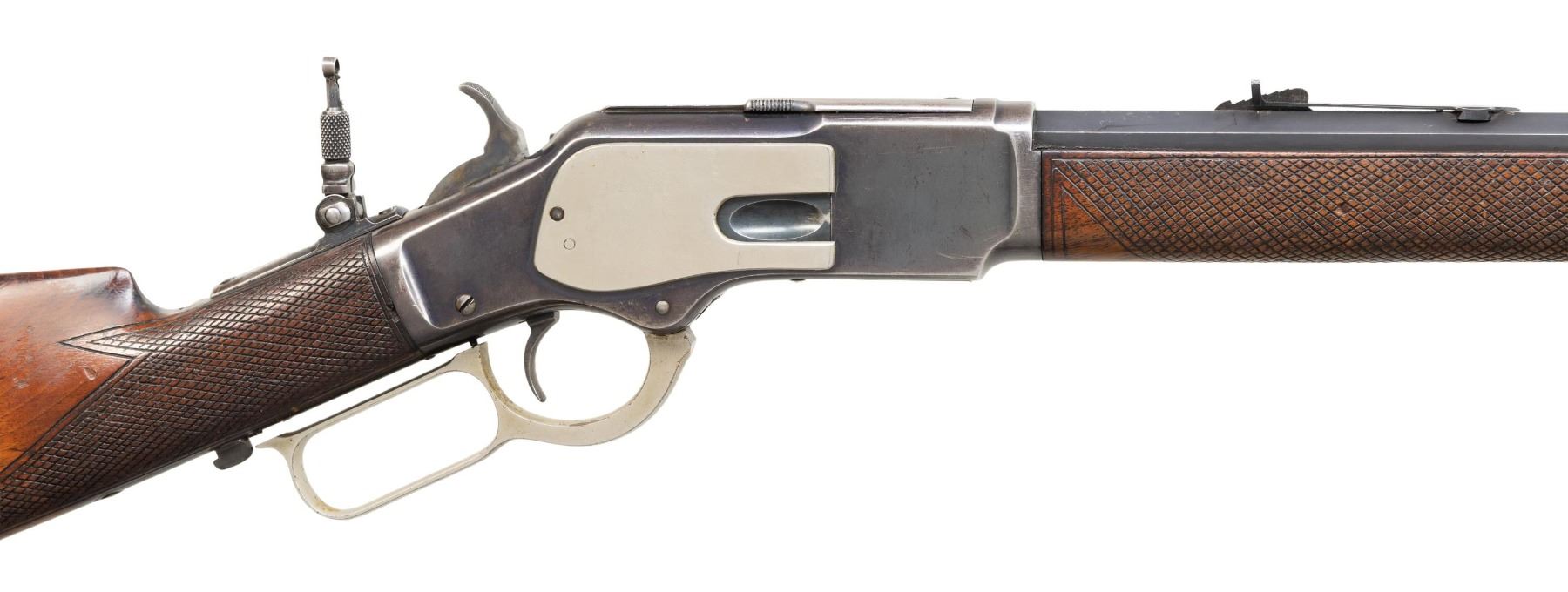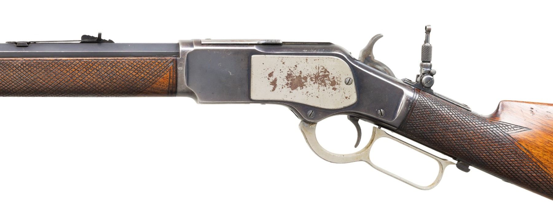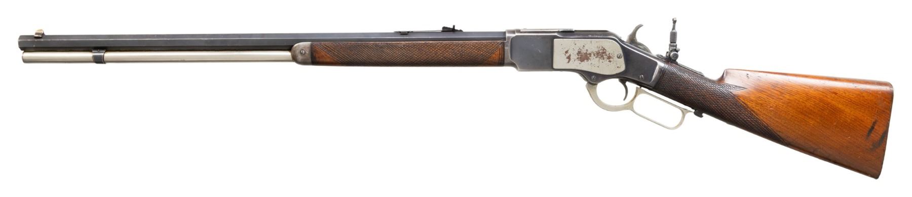 Cal. 38 WCF. S# 215993B. Bbl 24" octagon. Sporting front sight, flat top sporting rear sight with combination tang sight. Full length mag. Blue finish with added nickel finished mag tube, side plates, carrier and lever. Case colored hammer. Forearm and straight grip stock with steel shotgun buttplate have added very coarse checkering. Mfg. 1886. CONDITION: bbl and receiver have over 70% lightly faded blue showing carry and edge wear with small handling marks. Mag tube, side plates, carrier and lever have 90% nickel finish with spots of flaking. Hammer shows some lightly visible case colors. Stocks have moderately worn finish showing handling marks. Sound action. Bore is generally bright with sound rifling. (01-28181/DS). ANTIQUE. $1,200-1,800.