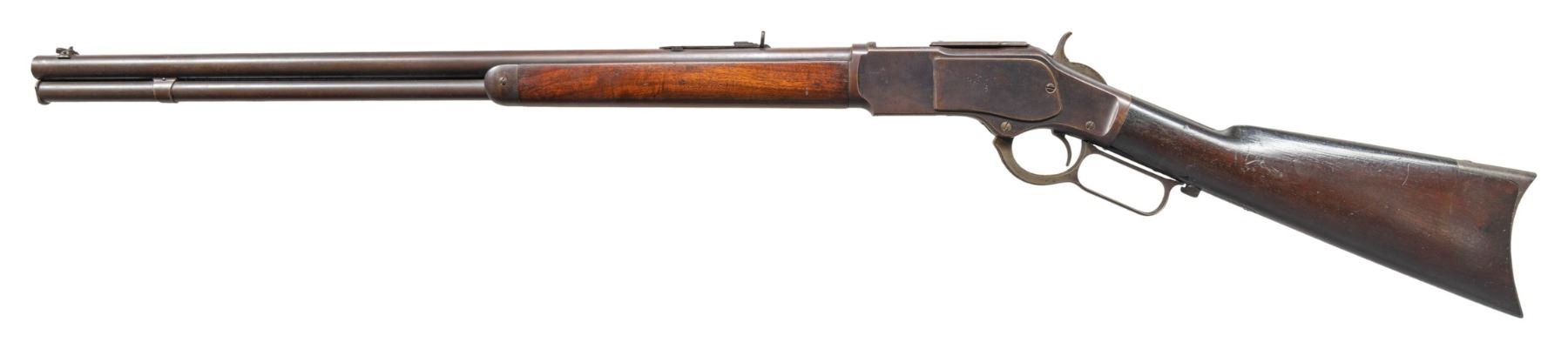 Cal. 22 Short. S# 250825B. Bbl. 24" rnd. Combination front sight with sporting rear sight. Full length tubular mag. Blue finish with case colored hammer and lever. Walnut forearm and straight grip stock with crescent steel buttplate. Mfg. in 1888. CONDITION: rifle retains over 70% dull lightly faded blue showing scratches, marks, and spotted corrosion. Breech end of bbl. has wrench marks. Hammer and lever show traces of case colors. Forearm has original finish showing scratches and marks. Stock has an age darkened appearance with numerous scratches, marks, and small dents, having a 1 1/2" chip left of the lower tang. Sound action. Dark pitted bore has little remaining rifling. PROVENANCE: The Esteemed Norm Greenberg Collection. (01-27694/DS). ANTIQUE. $2,000-3,000.