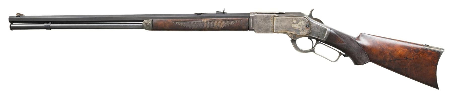 LEVER ACTION RIFLE. Cal. 22 short. S#. 186246A. Bbl. 24" octagon. Reverse German silver blade Rocky Mtn front with sporting rear sight. Full length tubular mag. The silver finished action has extensive vine type foliate scroll engraving with punch dot backgrounds, The right sideplate features a woodland scene with 2 cottontail rabbits. The left sideplate shows 2 squirrels on a tree branch. Complementary engraving extends to the forend cap, lever & crescent steel buttplate. Front receiver ring has a British proof mark. Forend & pistol grip stock of XX fancy black walnut feature a ebony grip insert and style H checkering. Left inside of the lower tang is stamped with assembly no. "578" followed by wood grade marking "XX" and cal. marking "22". Mfg. 1885. CONDITION: bbl. has reblued finish over remaining light pitting. Outside mag tube appears to be a replacement. Mag band pin is not present. Several action screws are replacement and most others are reblued. The custom plated action has acquired a mottled dark tarnish. the left side around the sideplate shows spots having a copper toned appearance. The forend is broken and repaired in 2 places with chips leaving a poor fit to the metal. The sanded & refinished stock has a appropriate dark look showing marks & mildew spots. The checkering is lightly freshened. Dark pitted bore. (01-26816/DS). ANTIQUE. $1,500-3,000.
