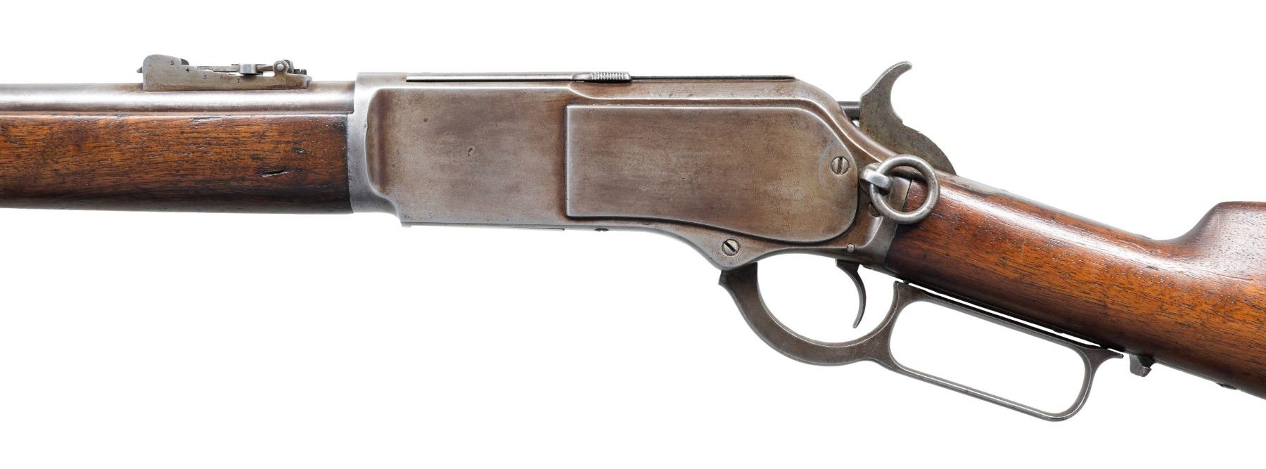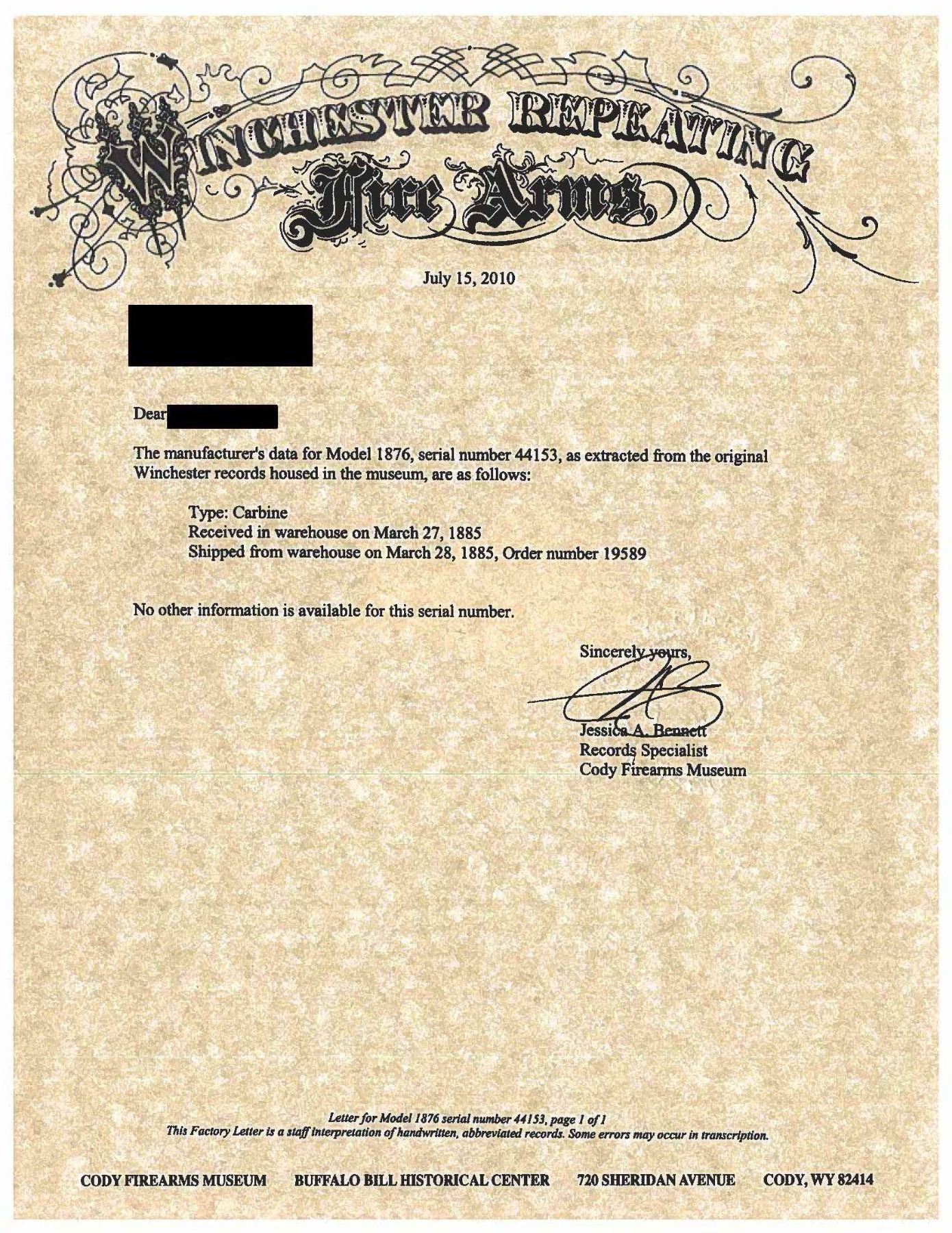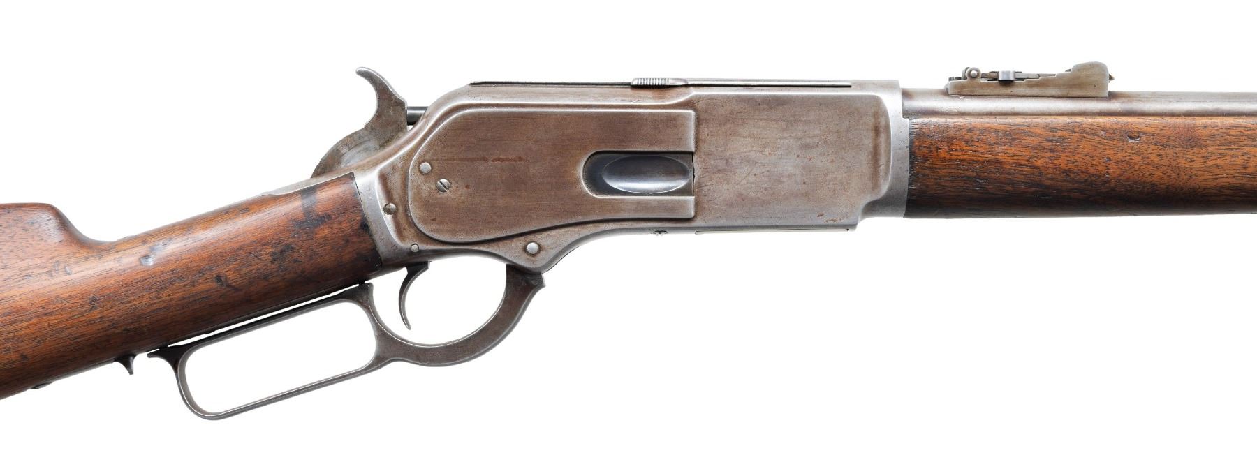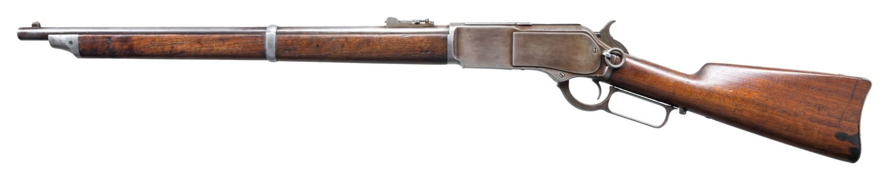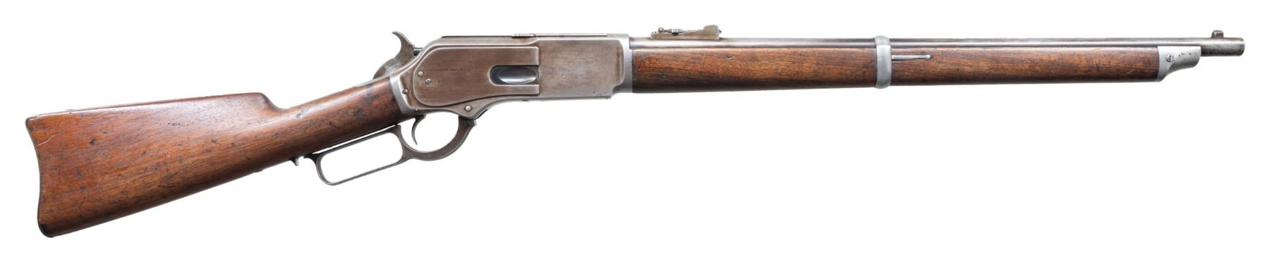 1876 LEVER ACTION SADDLE RING CARBINE. Cal. 45-75. S# 44153. Bbl. 22" rnd. with integral front sight and 200-1000 yard leaf rear sight. Action has saddle ring on left side. Full length band fastened iron tipped forearm. Straight grip walnut stock with steel carbine buttplate. Right side of stock has a banner marked "NWMP". 1,611 mfg. by Winchester for the NWMP between 1878-1885. UNATTACHED ACCESSORIES: Winchester factory letter stating: "Type: Carbine/ Received in warehouse on March 27, 1885/ Shipped from warehouse on March 28, 1885, Order number 19589.". CONDITION: metal has largely faded to gray showing handling marks and spots of light corrosion. Sanded and refinished wood shows scratches, marks, and dents. Sound mechanics. Bore retains strong rifling showing some very light corrosion. PROVENANCE: The Esteemed Norm Greenberg Collection. (01-27698/DS). ANTIQUE. $5,000-8,000.
