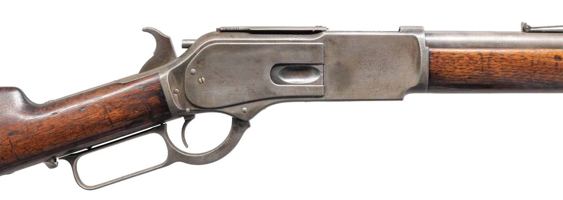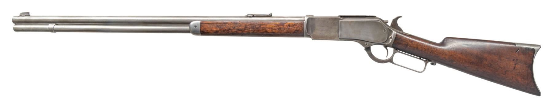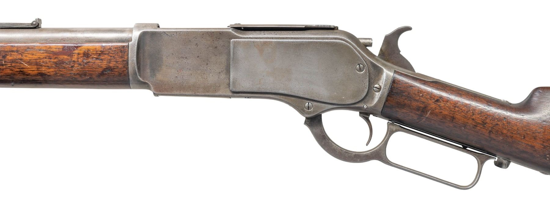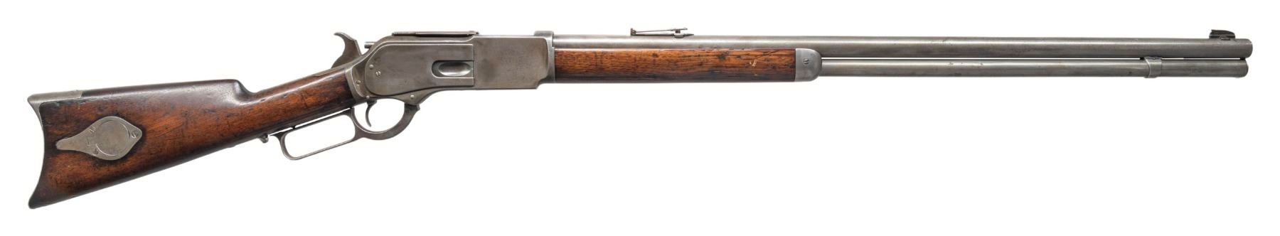Cal. 45-60 WCF. S#. 17619. Bbl. 28" round. Replacement brass bead front sight with graduated leaf rear sight. Full length mag. Walnut forend and straight grip stock with crescent steel trap door buttplate. Right side of stock has an added circular lid iron patch box. Mfg. 1881. UNATTACHED ACCESORIES: base only for a Rocky Mtn style front sight. CONDITION: metal has a cleaned gray appearance showing scattered light pitting and small dents. Stocks show an age darkened look with scratches & marks. sound action. Dark lightly pitted bore retains sound rifling. (01-28201/DS). ANTIQUE. $2,000-3,000.