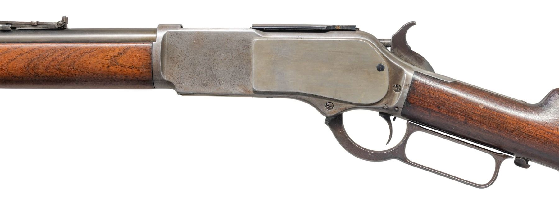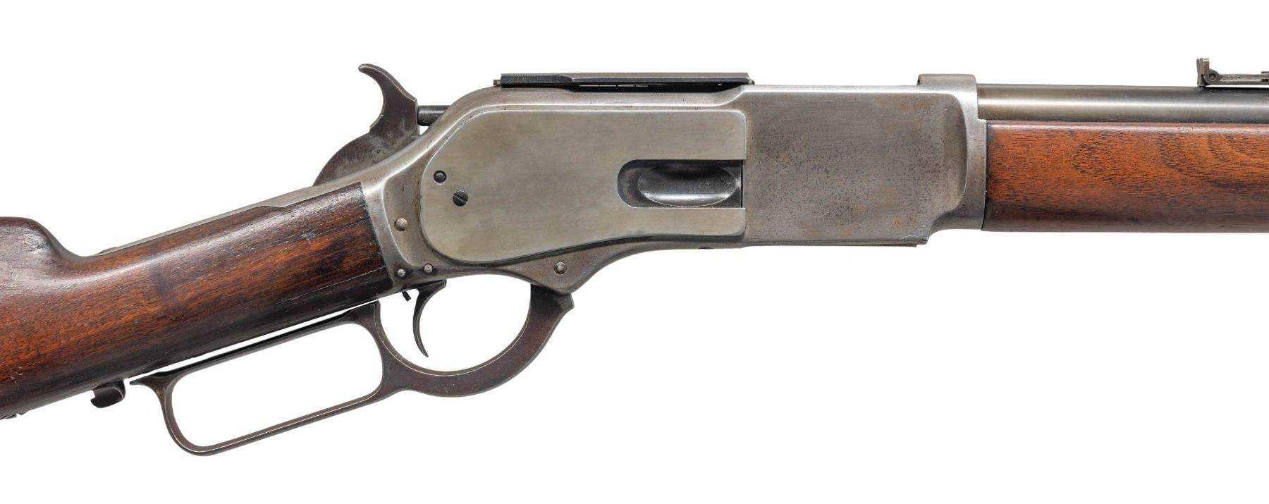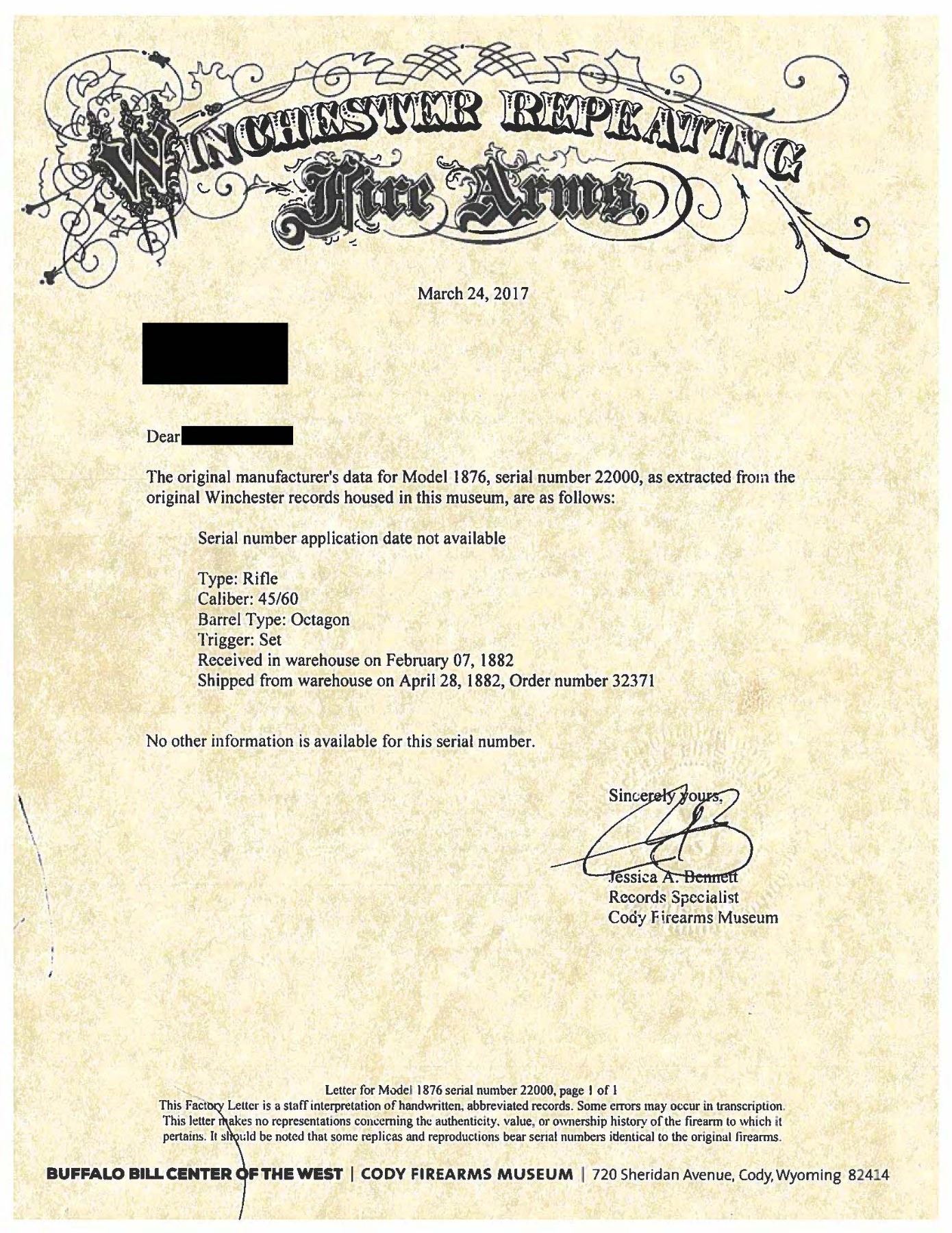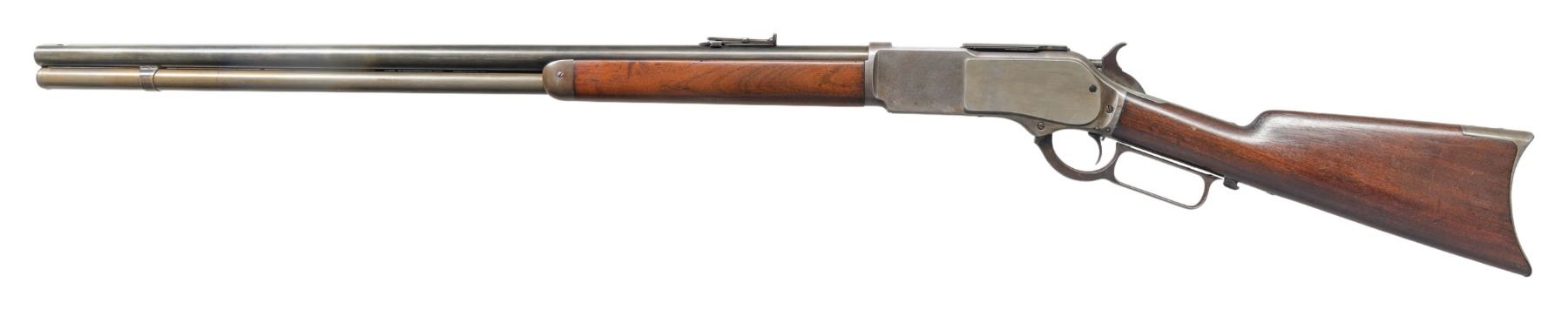 Cal. 45-60 WCF. S#. 22000. Bbl. 28" round. Open dovetail for front sight with a graduated leaf rear sight. Full length mag. Set trigger. Walnut forend & straight grip stock with crescent steel trap door buttplate. UNATTACHED ACCESORIES: Cody Firearms Museum letter stating: "Type: Rifle, Caliber: 45/60, Barrel Type: Octagon, Trigger: Set, Received in warehouse on February 07 1882, Shipped from warehouse on April 28, 1882, Order number 32371." CONDITION: reblued bbl. has weakened markings, caliber marking is recut. Action finish has faded to gray. Dust cover and some action screws are replacements. Trigger is not setting properly. Sanded & refinished wood. The bore retains strong rifling showing some very light pitting. (01-28207/DS). ANTIQUE. $1,500-2,250.
