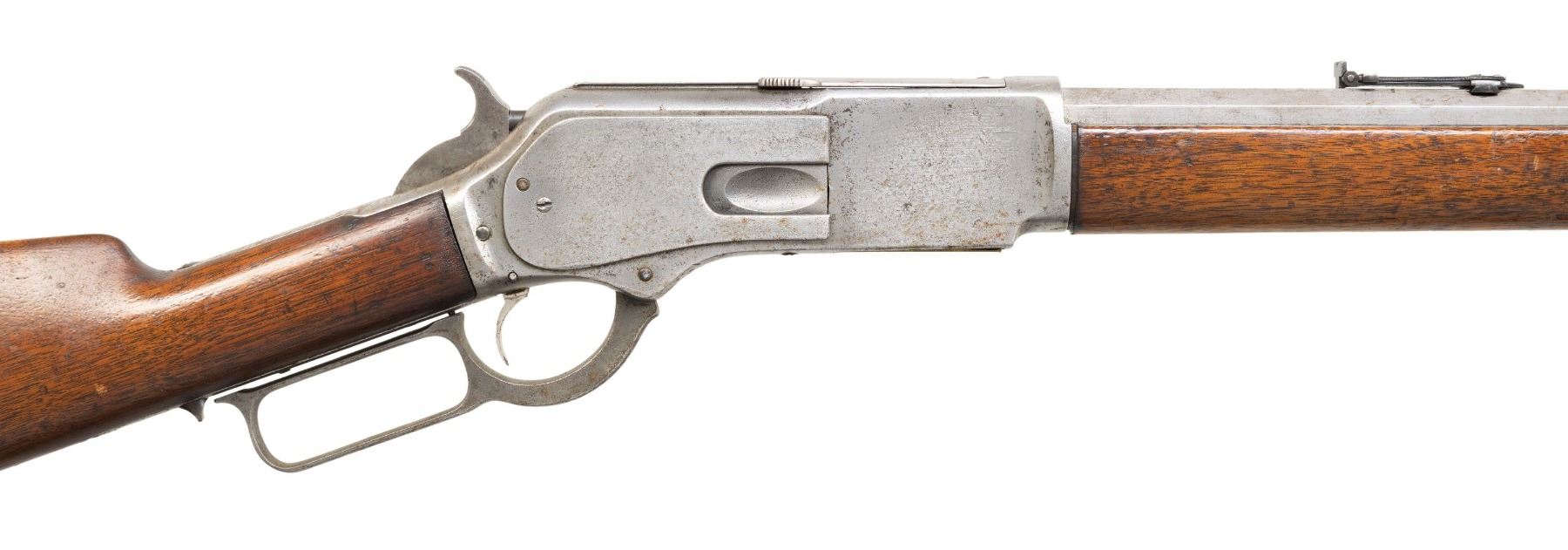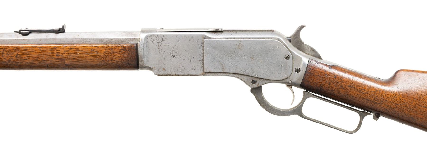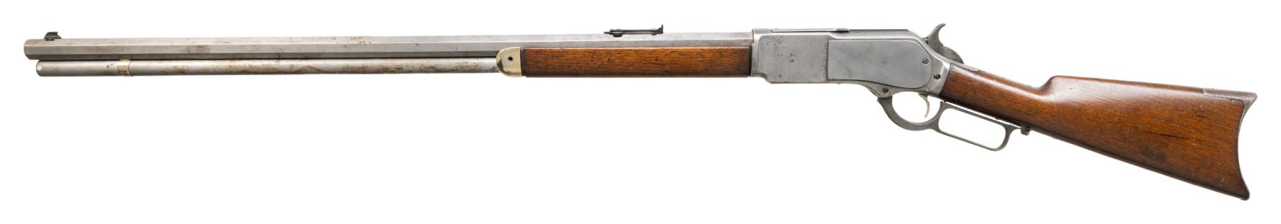 Cal. 45-60. S# 25118. Bbl unmarked 31" octagon replacement with handstamped caliber marking. Bead front sight with graduated leaf rear sight. Full length mag. Walnut forearm, straight grip stock with crescent steel trapdoor crescent buttplate. Mfg. 1882. CONDITION: metal has cleaned appearance. Action shows general pitting. Bbl and mag tube shows spots of surface rust. Nickel plated forearm cap mounted too far forward for proper forearm fit. Wood is sanded and refinished showing scratches and marks. Action shows wear. Mag tube, cap, spring and follower are not present. Bore retains sound rifling with darkening in the grooves. (01-28182/DS). ANTIQUE. $1,000-1,500.