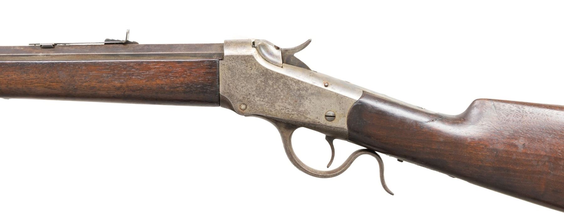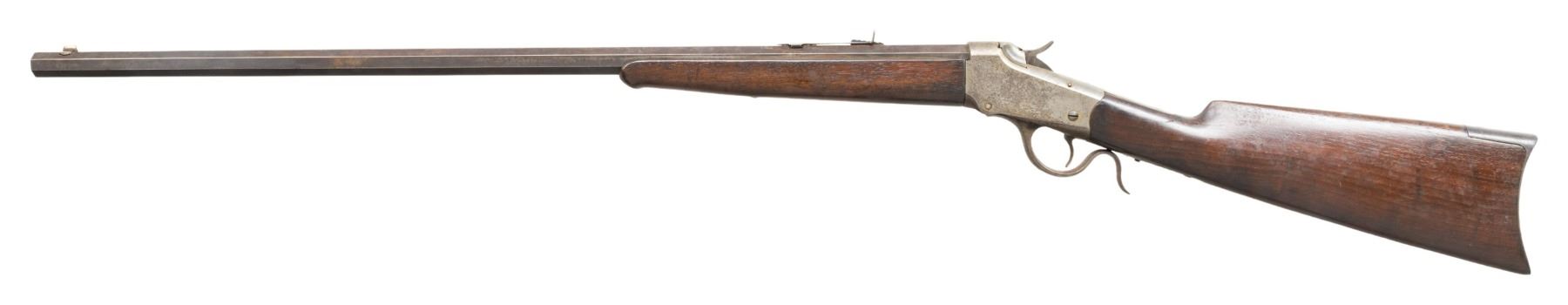 Cal.25-20 Single Shot. S#. 53161. Bbl. 28" No. 1 weight octagon. Sporting front with replacement sporting style rear sight. Ebony tipped Schnabel forend with straight grip walnut stock having a crescent steel buttplate. Mfg. 1891. CONDITION: metal has faded to brown showing spots of light pitting. Refinished wood shows wear and handling marks. The stock a 2 5/8" added wood repair right of the top tang. Sound action. The bore has a darkened appearance retaining sound rifling. (01-26793/DS). ANTIQUE. $500-800.
