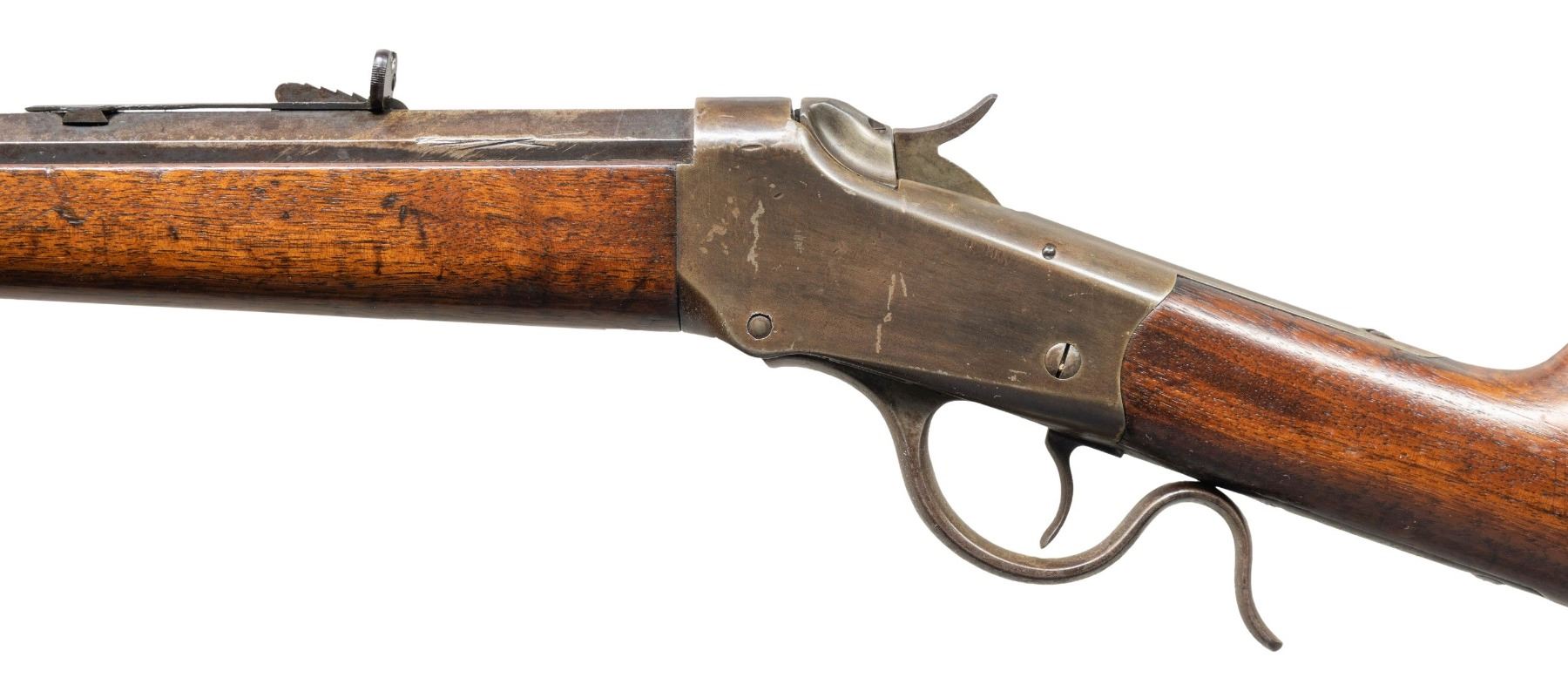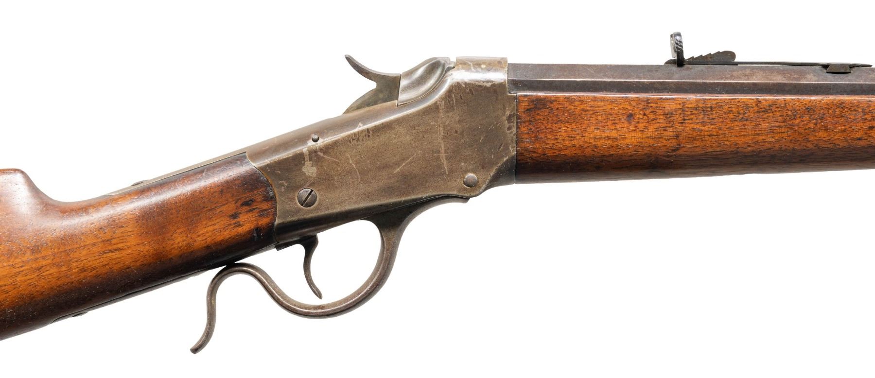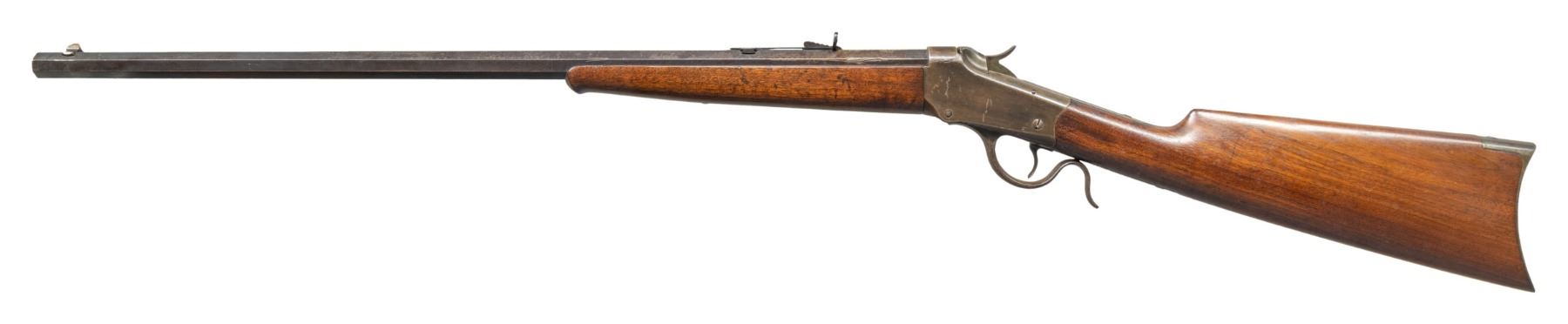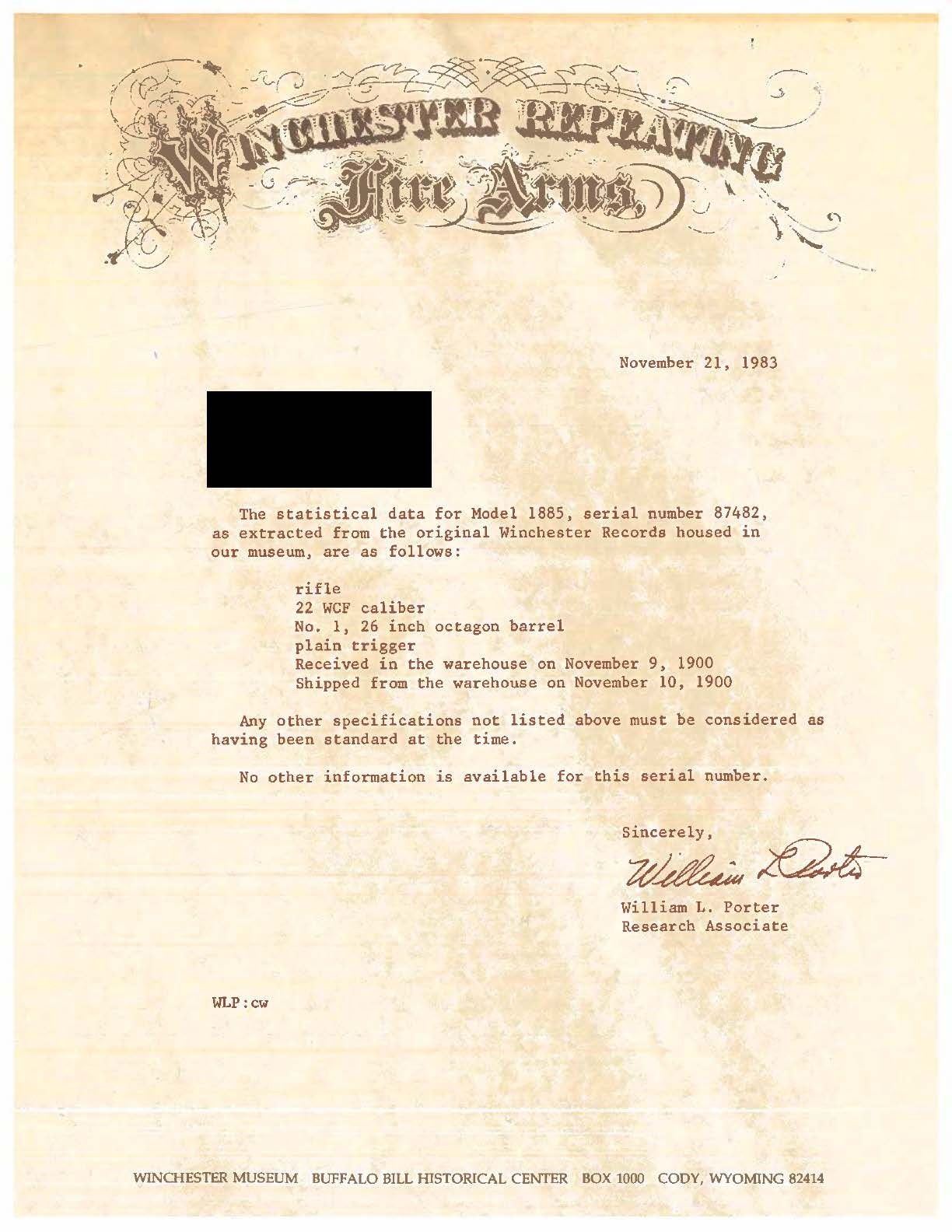 Cal. 22 WCF. S# 87482. Bbl. 26" No. 1 oct. with dovetailed blade sporting front sight. Semi buckhorn style sporting rear sight. Plain walnut stock set with ebony tipped schnabel forearm and crescent steel butt plate. Mfg. & shipped from the factory in 1900. UNATTACHED ACCESSORIES: Winchester factory letter confirming configuration and shipment date. CONDITION: overall fair with thinning metal finish that has approximately 30-40% coverage that has some high edge wear, scattered patchy old oxidation, and some marks from a vise at the breech end of the bbl, Receiver finish has faded and remnants of touch up from cold bluing is visible. Stock has scattered light handling marks and light scratches. Bore has light frosting and sharp rifling. (25-1295/ZAL). CURIO. $500-800.