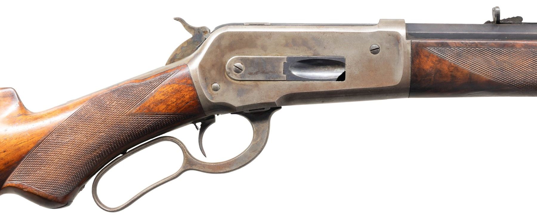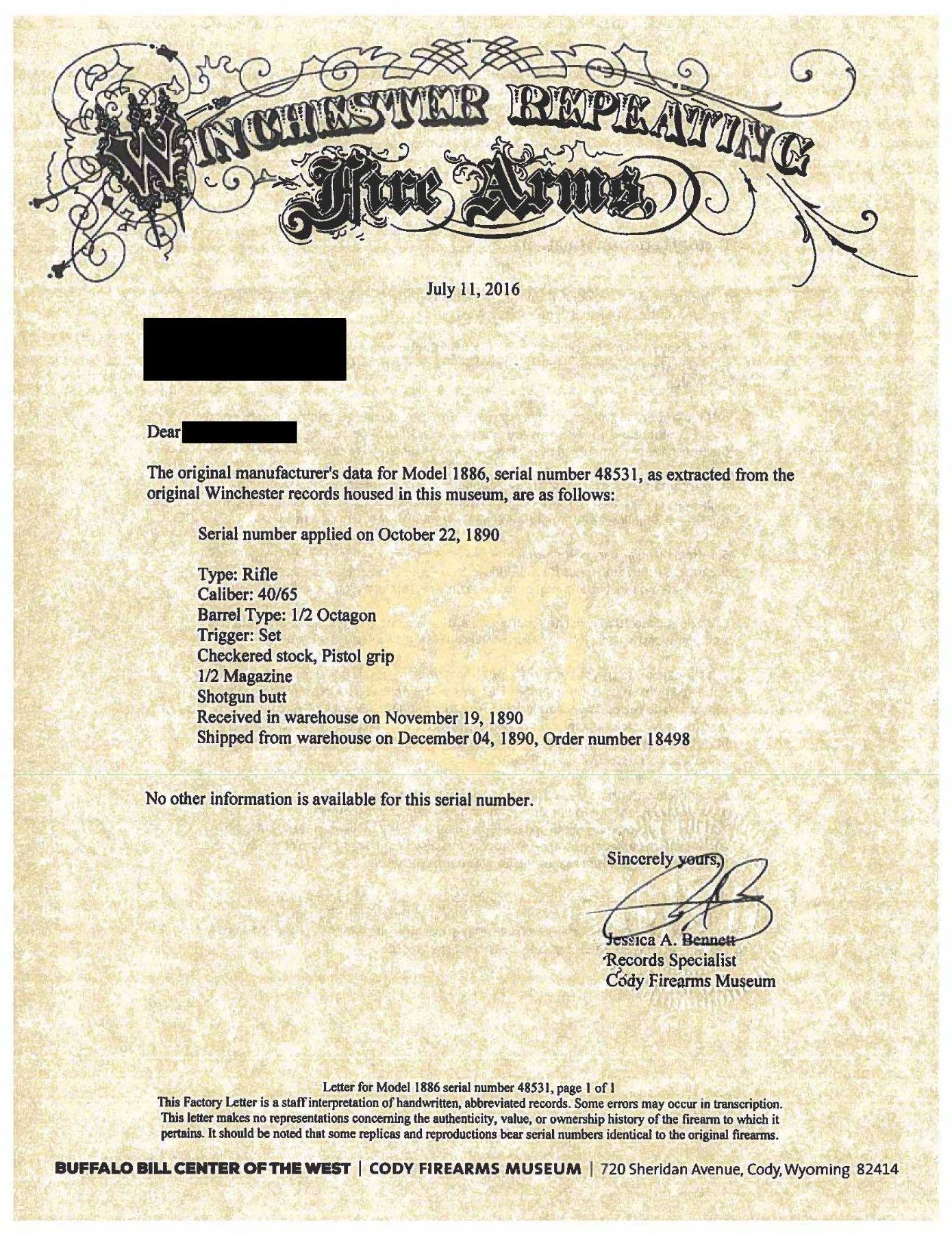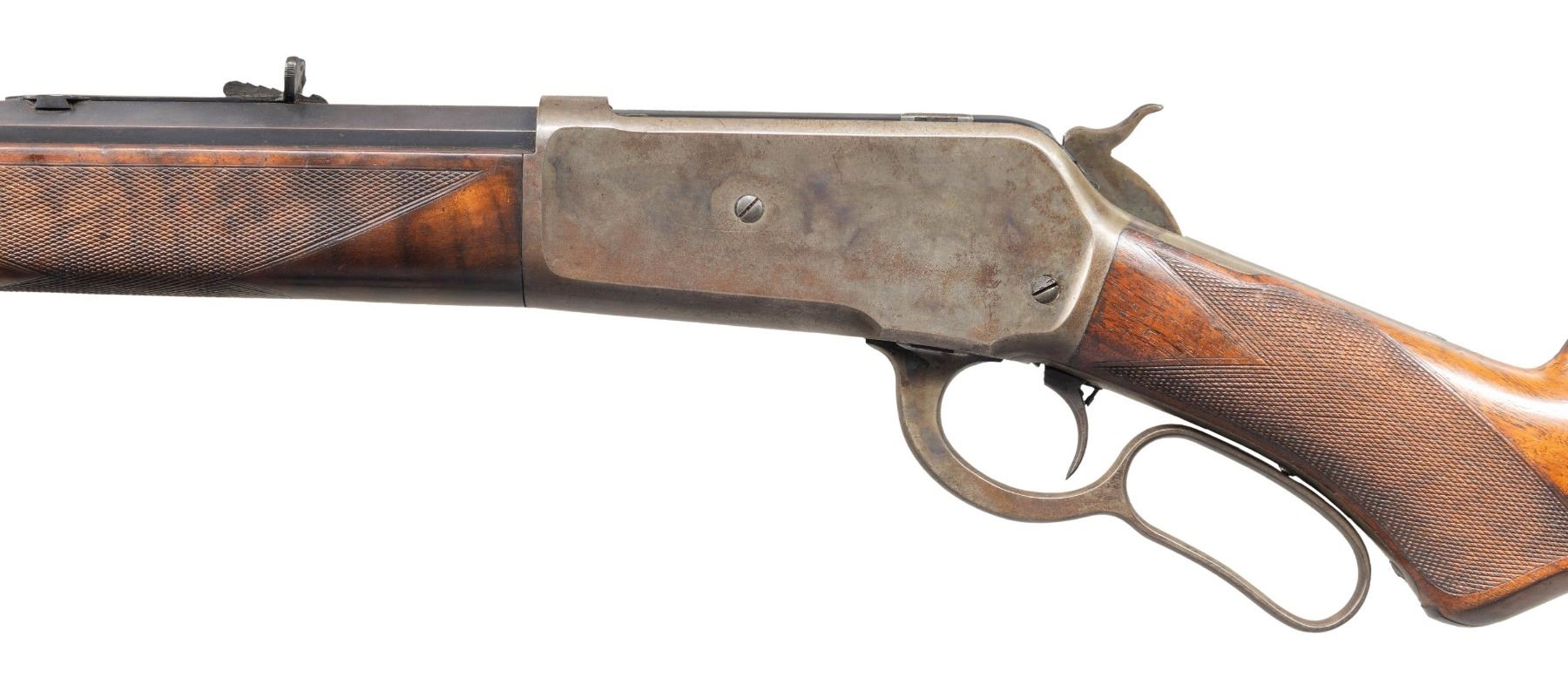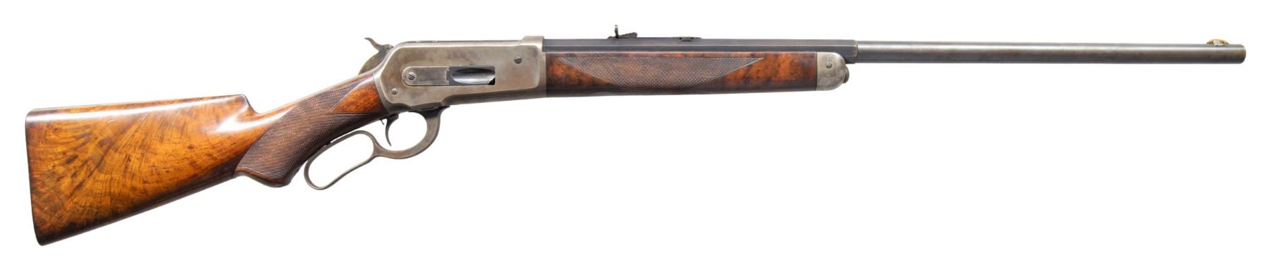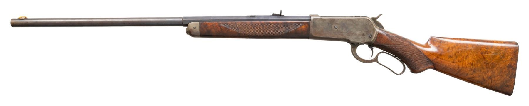 Cal. 40-65 WCF. S# 48531. Bbl. 26" octagon to rnd. Sporting front sight with replacement bone blade and original sporting rear sight. Button mag. Blue finish with case colored action. Single set trigger. Forearm and pistol grip stock of fancy walnut featuring ebony grip insert, Style H checkering, and steel shotgun buttplate. Left inside of lower tang is marked with assembly # "266" followed by "S" and wood grade marking "XXX". Top tang channel of stock has matching assembly # "266". UNATTACHED ACCESSORIES: Cody Firearms Museum letter stating: "Serial number applied on October 22, 1890/ Type: Rifle/ Caliber: 40/65/ Barrel Type: 1/2 octagon/ Trigger: Set/ Checkered stock, Pistol grip/ 1/2 Magazine/ Shotgun butt/ Received in warehouse on November 19, 1890/ Shipped from warehouse on December 04, 1890, Order number 18498". CONDITION: bbl. retains 70% dull lightly faded blue showing spotted freckling. Action has a darkened appearance showing carry wear with lightly visible case colors on its side and In protected areas. Sound action and functioning set trigger. Loading gate is chipped on the lower front corner. Original wood finish and checkering show moderate wear with scattered scratches, marks, and small dents. Lightly pitted bore retains sound rifling. PROVENANCE: The Esteemed Norm Greenberg Collection. (01-27712/DS). ANTIQUE. $6,000-10,000.