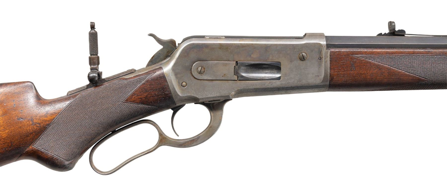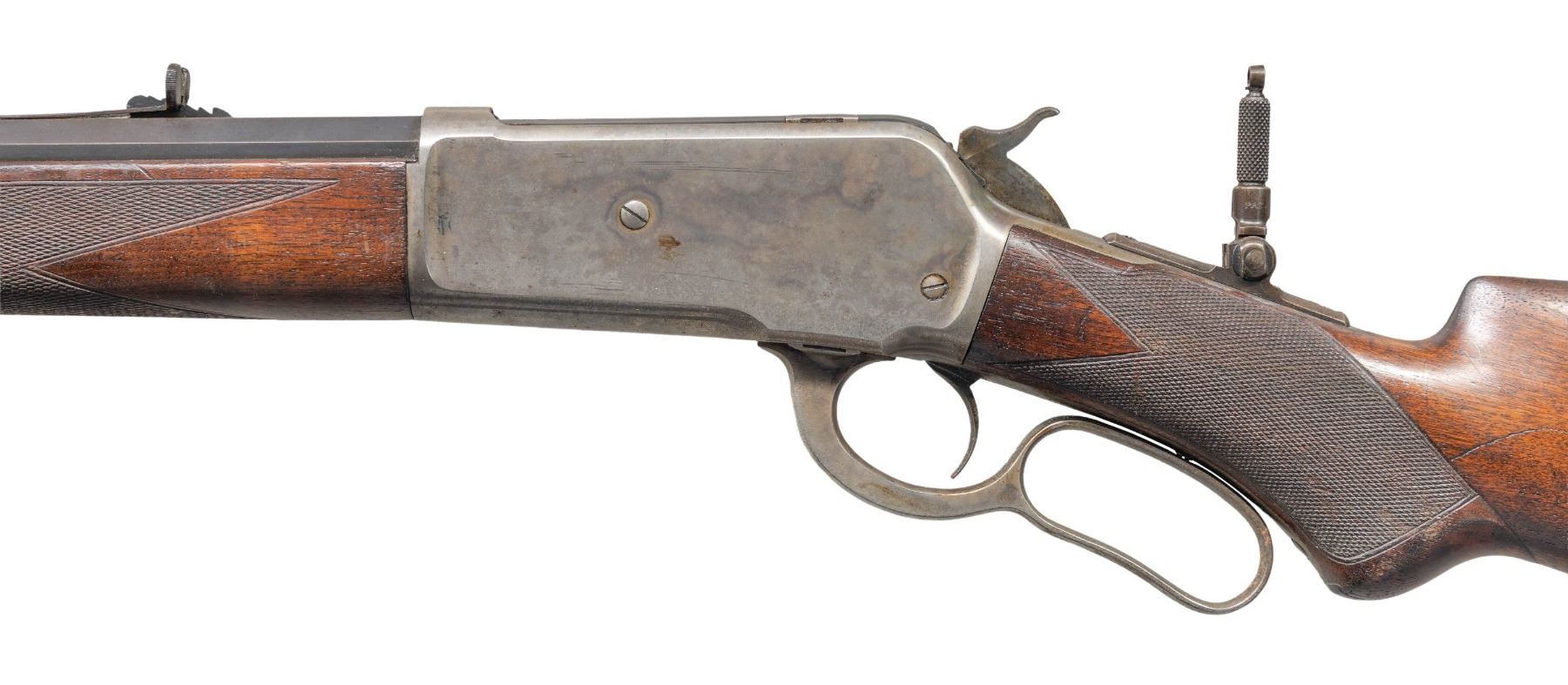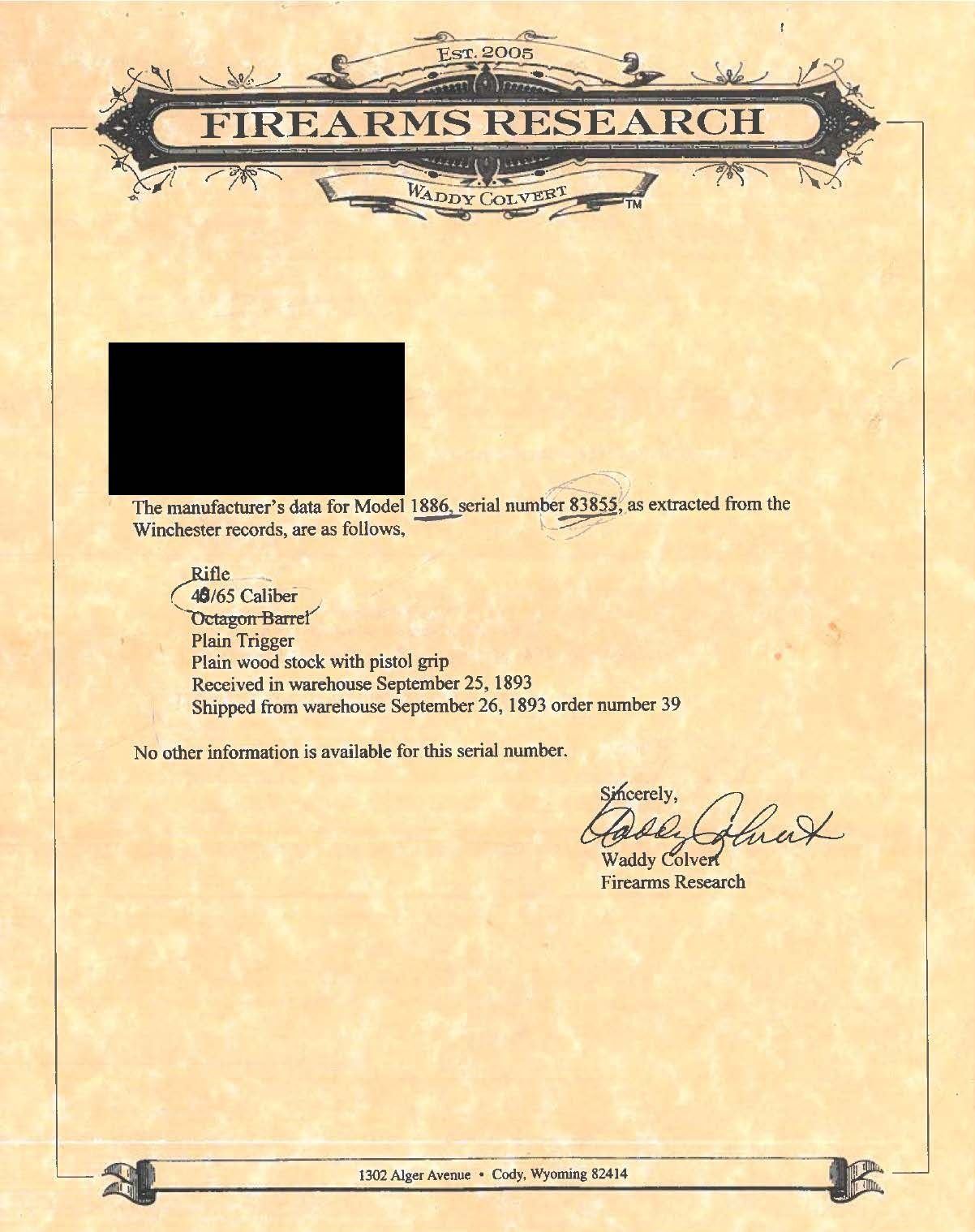 Cal. 40-65 WCF. S# 83855. Bbl. 26" octagon. Lyman No. 4 hunting front sight, original sporting rear sight, and added combination tang sight. Full length mag. Blue and case colored finish. Walnut forearm and pistol grip stock have ebony grip insert, Style H checkering, and crescent steel buttplate. Left inside of lower tang is stamped with assembly # "1003" followed by "CF". Top tang channel of stock has matching assembly # "1003". UNATTACHED ACCESSORIES: Waddy Colvert letter stating: "Rifle/ 40/65 Caliber/ Octagon Barrel/ Plain Trigger/ Plain wood stock with pistol grip/ Received in warehouse September 25, 1893/ Shipped from warehouse on September 26, 1893 order number 39". CONDITION: bbl. and mag. tube retain 70% lightly faded original blue showing edge wear. Action retains 30% fading case colors in protected areas and shows carry wear. Original wood finish shows numerous scratches, marks, and small dents. Bore retains sound rifling with a slightly darkened appearance. (01-26771/DS). ANTIQUE. $4,000-6,000.