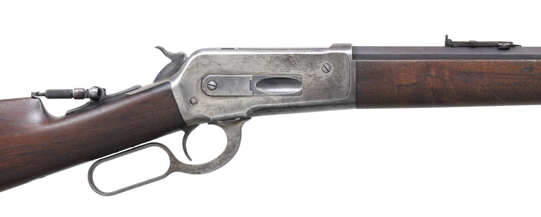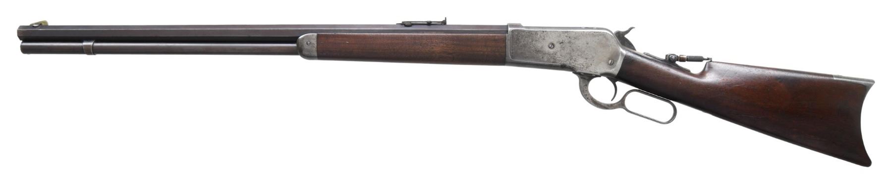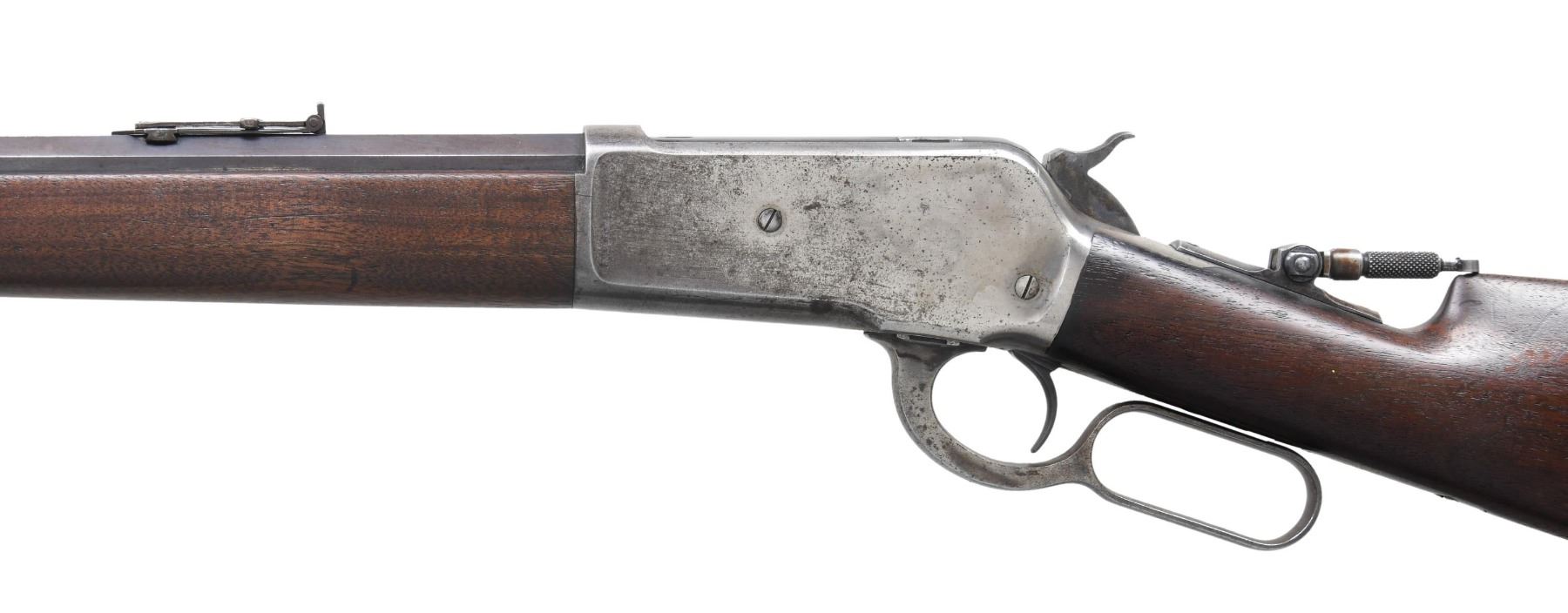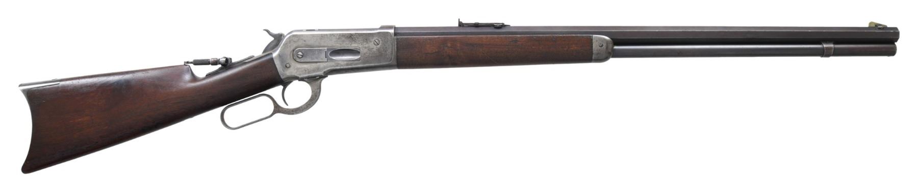 Cal. 45-70. S# 56414. Bbl. 26" octagon. Rocky Mountain front sight, original "1886" dated graduated leaf rear sight, with Lyman "N" tang sight. Full length mag. Blue and case colored finish. Walnut forearm and straight grip stock, with crescent steel buttplate. Mfg. in 1891. CONDITION: bbl. and mag. tube retain 40% original blue. Action shows a small amount of lightly visible case colors, with balance fading to silver/gray showing spotted surface freckling. Original wood shows scattered small scratches and marks. Mechanically fine. Bore is bright, with strong rifling showing small spots of very light pitting. (01-27088/DS). ANTIQUE. $4,000-5,500.