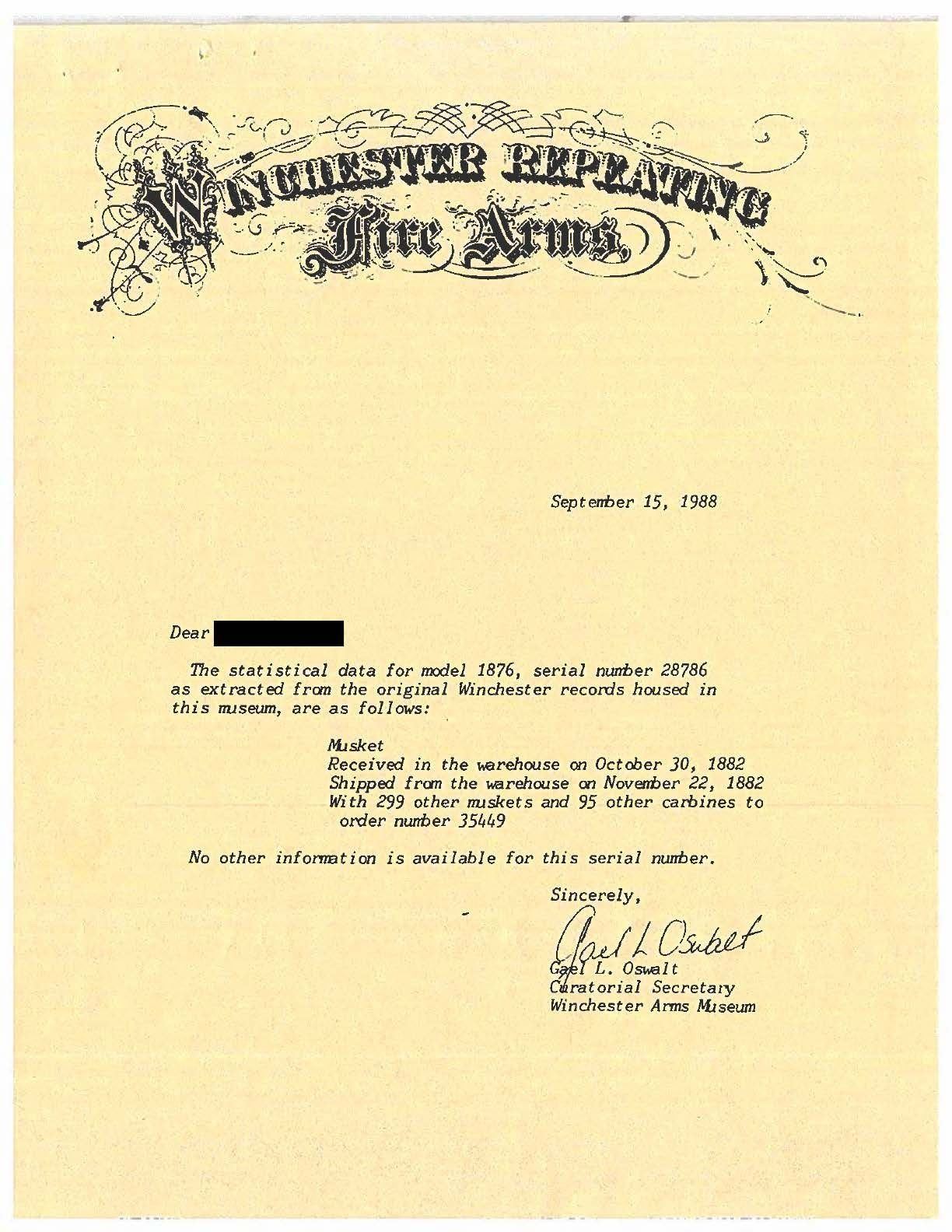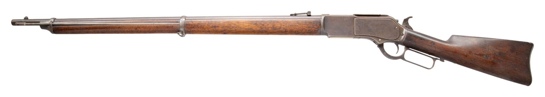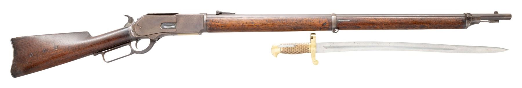 MUSKET. Cal. 45-75WCF. S#. 28786. bbl. 32" round. Fixed front with graduated leaf rear sight. Tubular mag. concealed in single band fastened full length forend having a right side mounted cleaning rod. Bayonet lug is forend cap mounted. Straight grip walnut stock with steel musket buttplate. Right side of stock is stamped with initials "C G H". Left side of stock is also also stamped with initials "C G H" along with numbers "0029". UNATTACHED ACCESORIES: Winchester Repeating arms letter dated September 15,1988 stating: "Musket, Received in the warehouse on October 30,1882, Shipped from the warehouse on November 22, 1882 With 299 other muskets and 95 carbines to order number 35449.". Rifle is also accompanied by a U.S. Winchester Model 1873 Yataghan sword bayonet. Left side of ricasso with apparent Imperial German proof, right side stamped "B". 1-piece feathered brass handle. Blade retains a mostly bright appearance, showing scattered spots of light to mild surface oxidation. Brass handle shows scattered handling marks, retaining a mostly bright appearance. CONDITION: metal finish has faded to brown. Stocks have dark worn appearance showing dents & marks. Sound action. Dark pitted bore. (01-26805/DS). ANTIQUE. $2,000-3,000.
