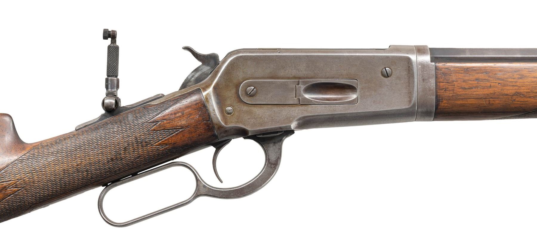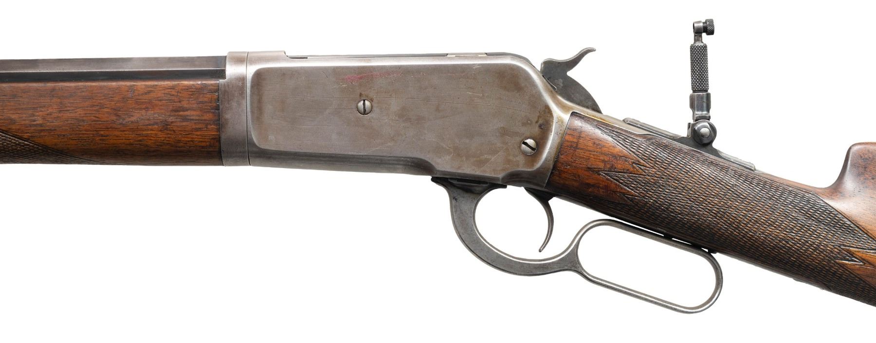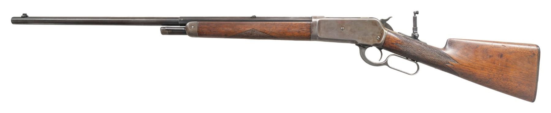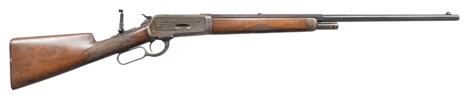 Cal. 45-90 WCF. S# 128186. Bbl. 26" octagon to rnd. Marbles No. 6 front sight with broken bead, folding leaf rear sight, with combination tang sight. Half length takedown mag. Walnut forearm and straight grip stock with hard rubber shotgun buttplate has added non-factory point pattern checkering. Buttplate is fitted with a brass trapdoor, stock is slotted to hold large optional eye piece for the tang sight. Mfg. in 1902. CONDITION: bbl. has 40% dull fading blue. The action has largely faded to gray. Sanded and refinished stocks have a worn appearance showing scratches and marks. Buttplate is chipped along the right side and cracked along the left. Sound mechanics. Very good bore. (25-5316/DS). CURIO. $1,500-2,250.